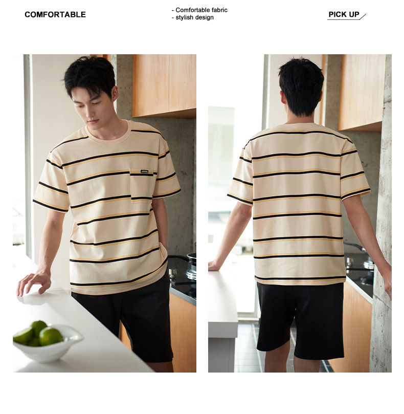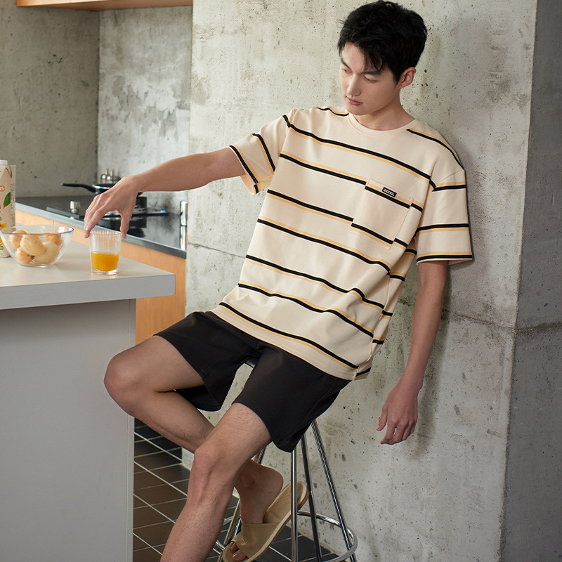 커플 잠옷 여름 순면 반팔 스트라이프 잠옷 여성용 외출 가능 얇고 편안한 남성용 홈웨어스토어 가기