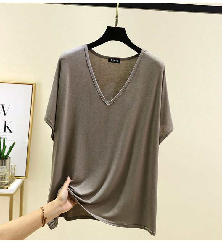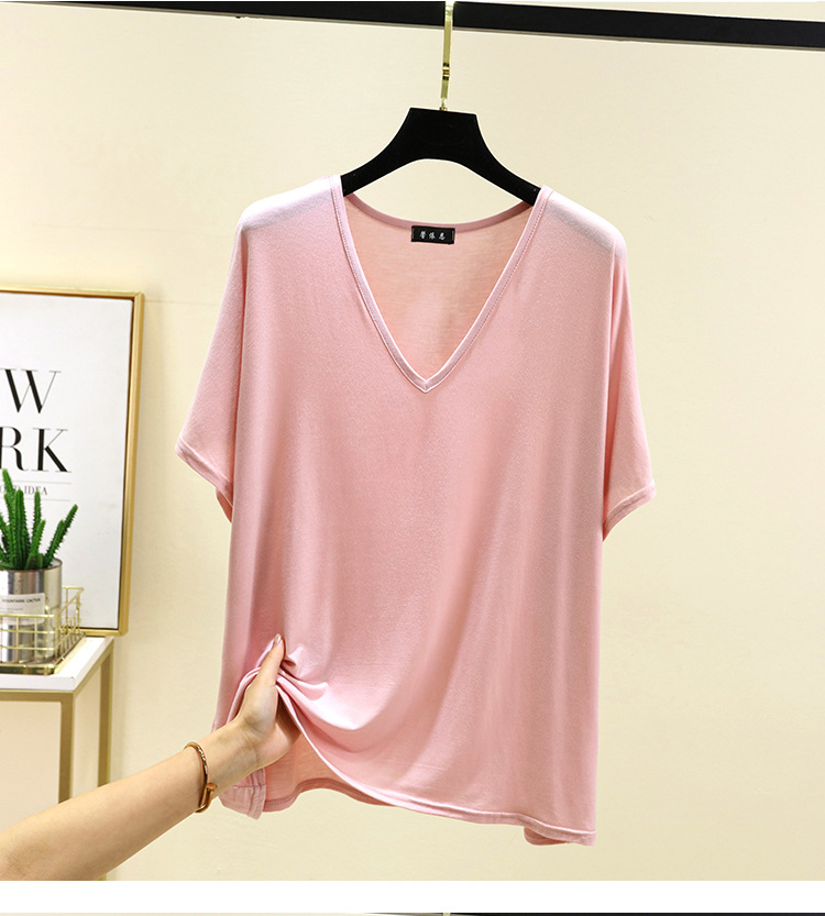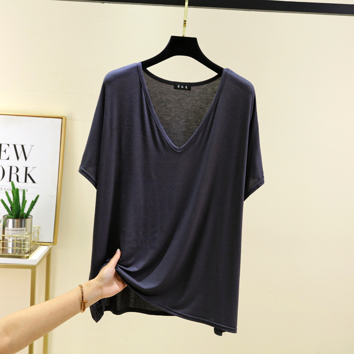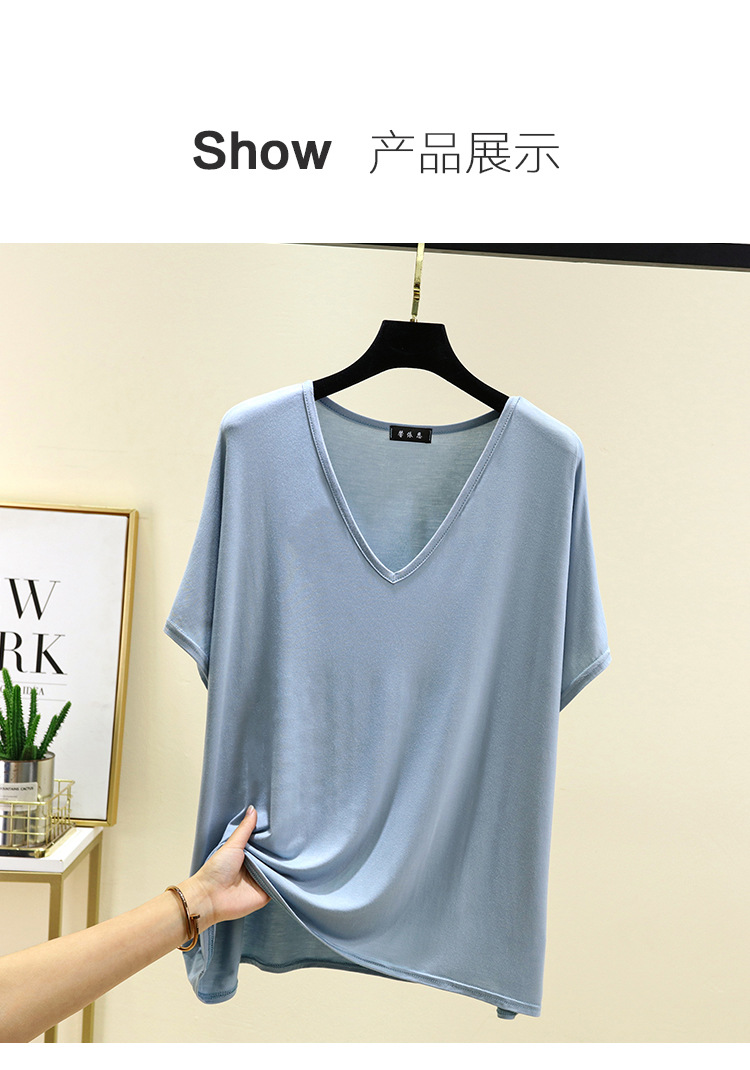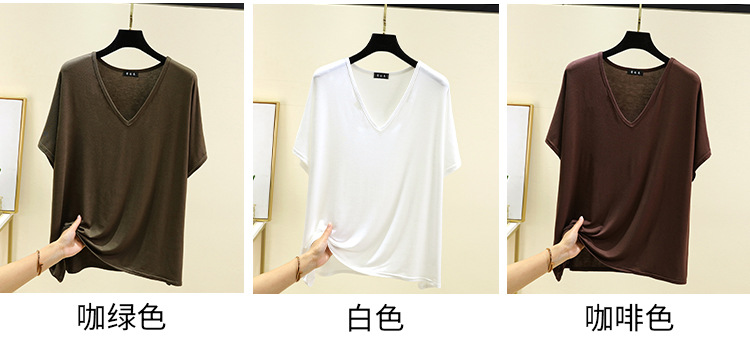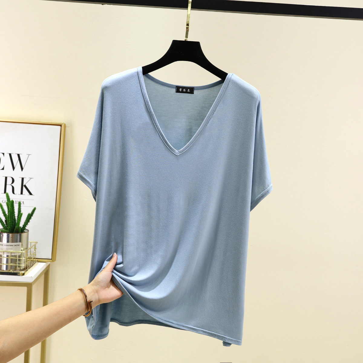 모달 V 넥 짧은 소매 최고 여성 여름 얇은 시원한 느낌베이스 셔츠 플러스 사이즈 느슨한 통통녀 다재다능한면 티셔츠