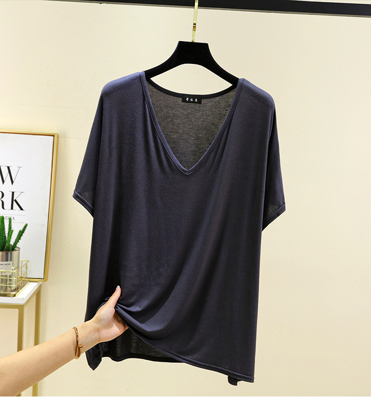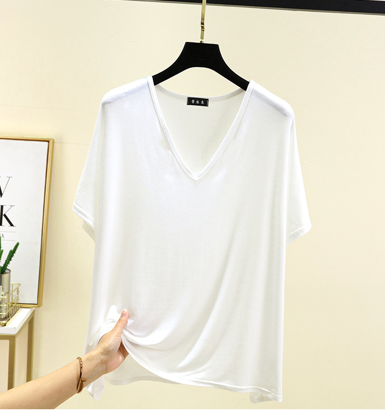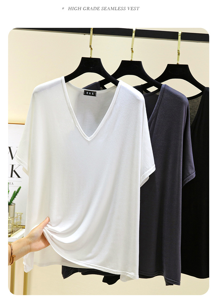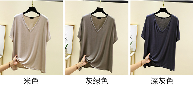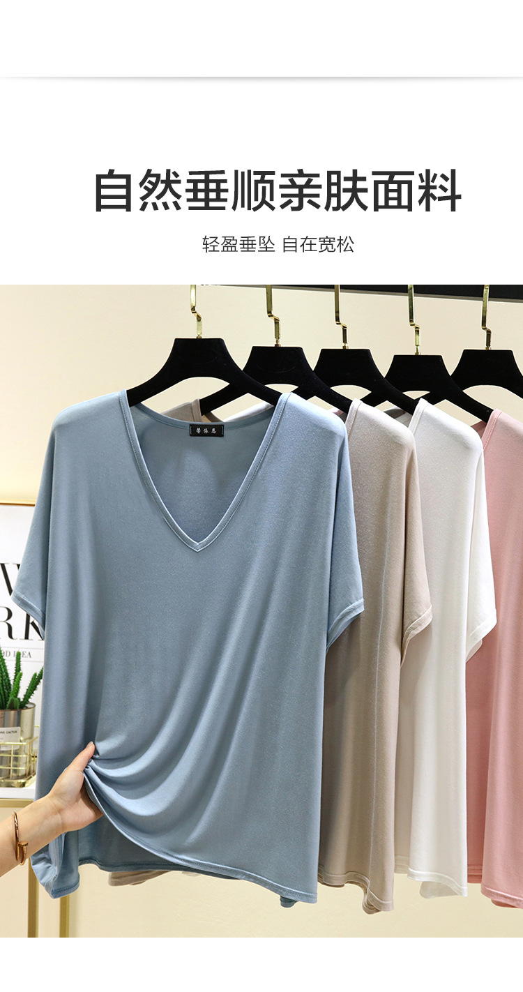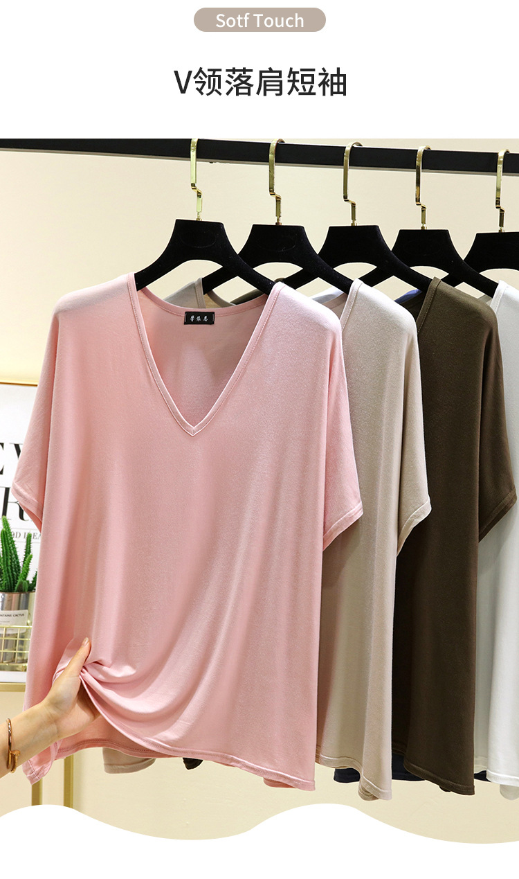 모달 V 넥 짧은 소매 최고 여성 여름 얇은 시원한 느낌베이스 셔츠 플러스 사이즈 느슨한 통통녀 다재다능한면 티셔츠