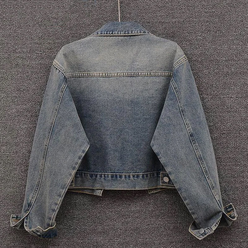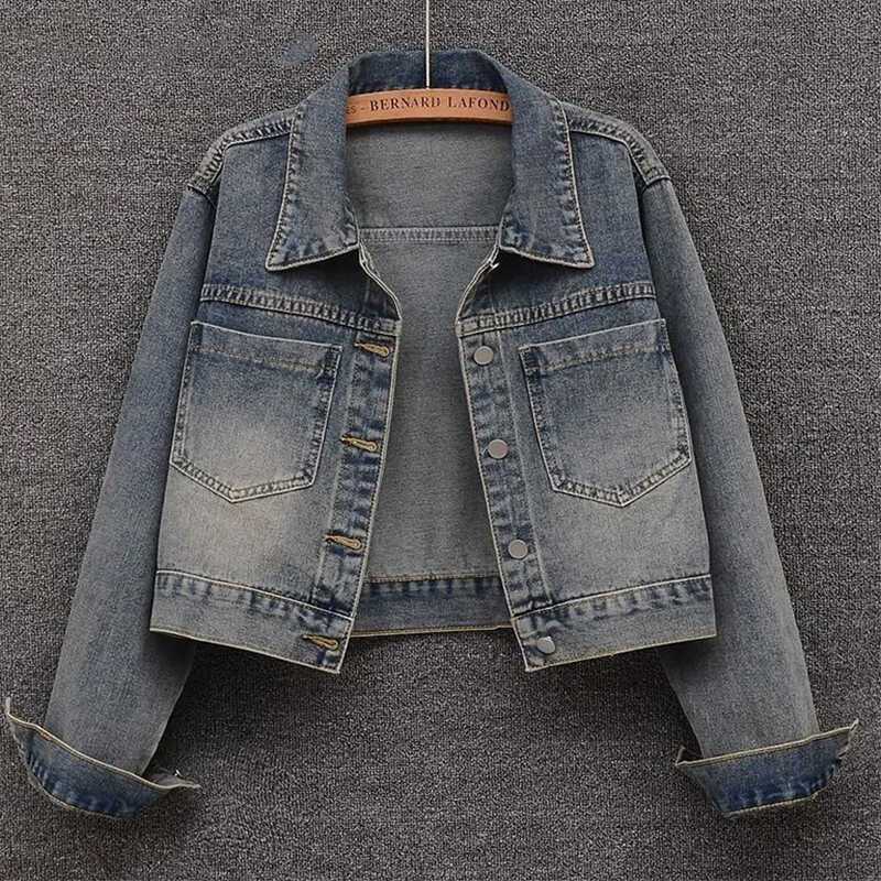 2025 년 봄과 가을 새로운 대형 포켓 복고풍 오래된 데님 코트 여성용 유행 짧은 느슨한 재킷 탑