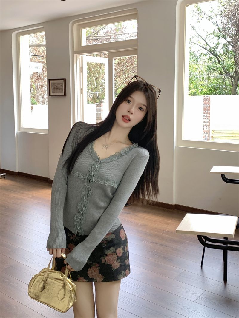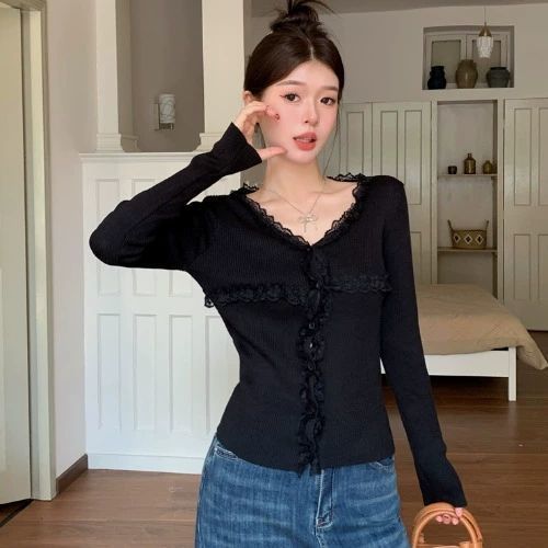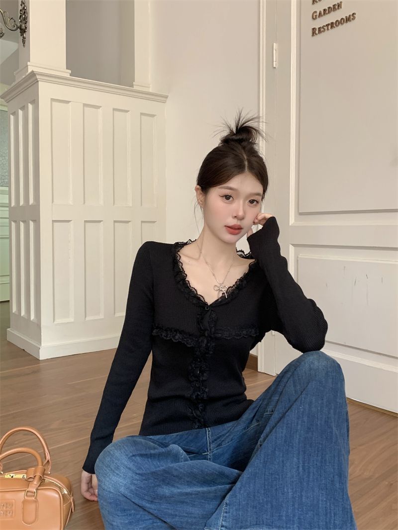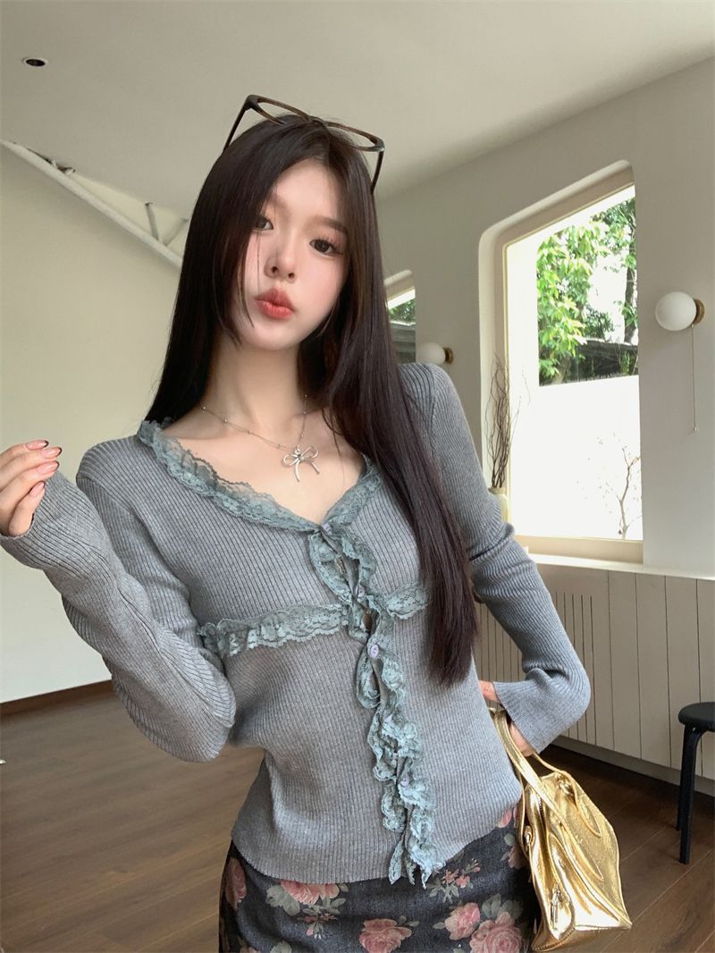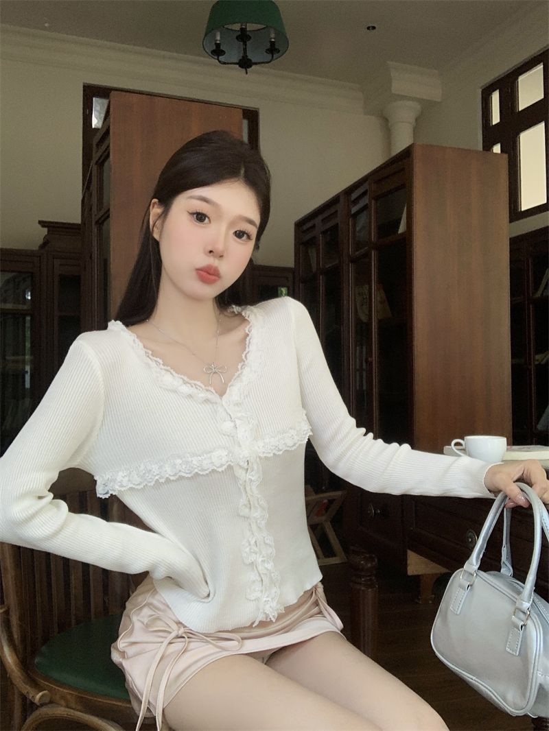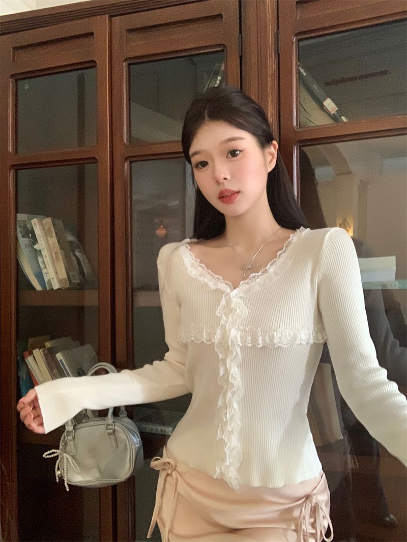 기질 연령 감소 디자인 센스 우드 이어 V 넥 스티칭 레이스 서양식 연령 감소 봄 니트 탑스토어 가기