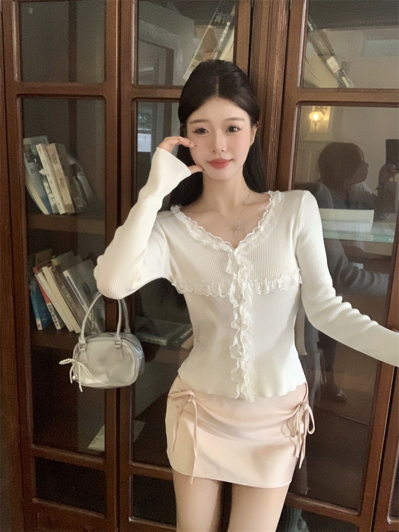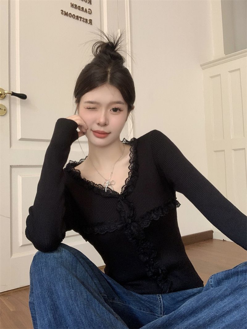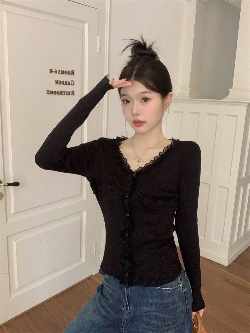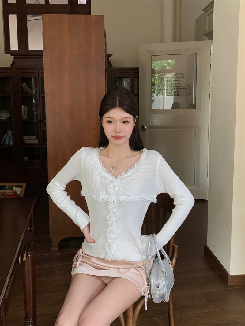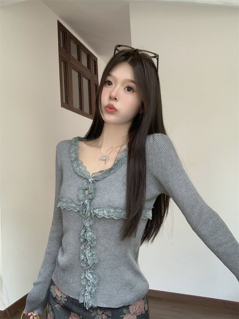 기질 연령 감소 디자인 센스 우드 이어 V 넥 스티칭 레이스 서양식 연령 감소 봄 니트 탑스토어 가기