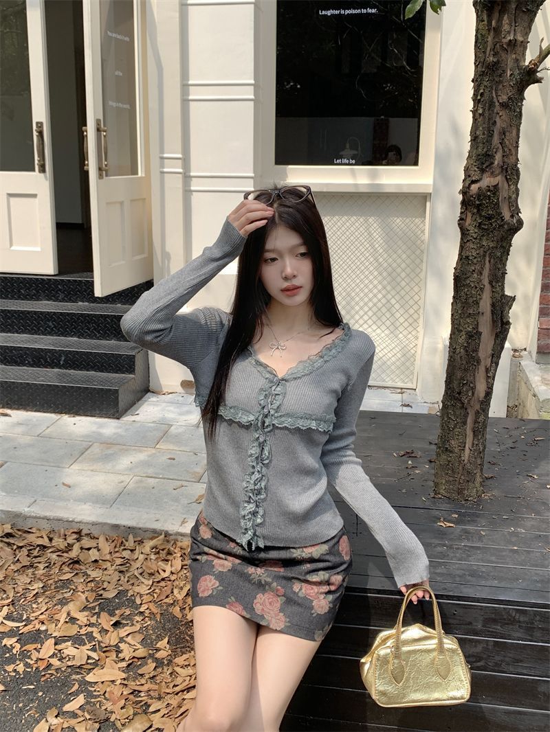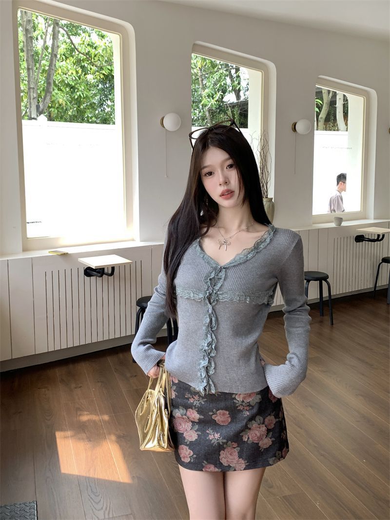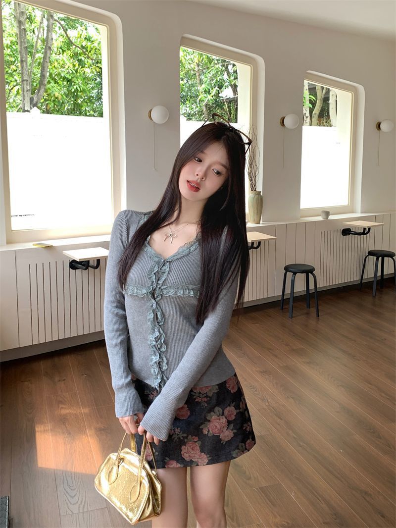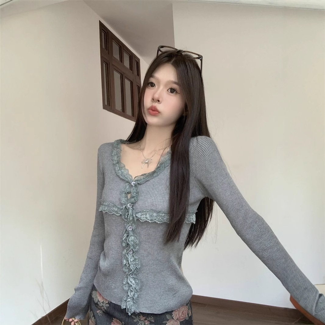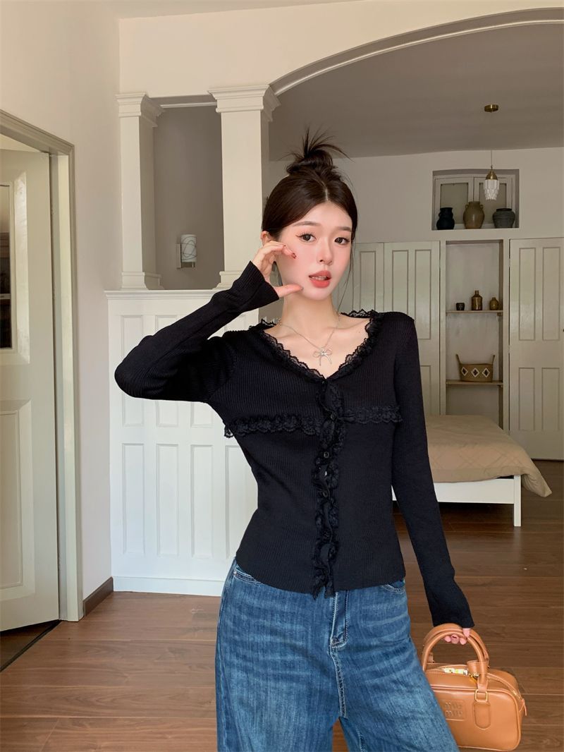 기질 연령 감소 디자인 센스 우드 이어 V 넥 스티칭 레이스 서양식 연령 감소 봄 니트 탑스토어 가기