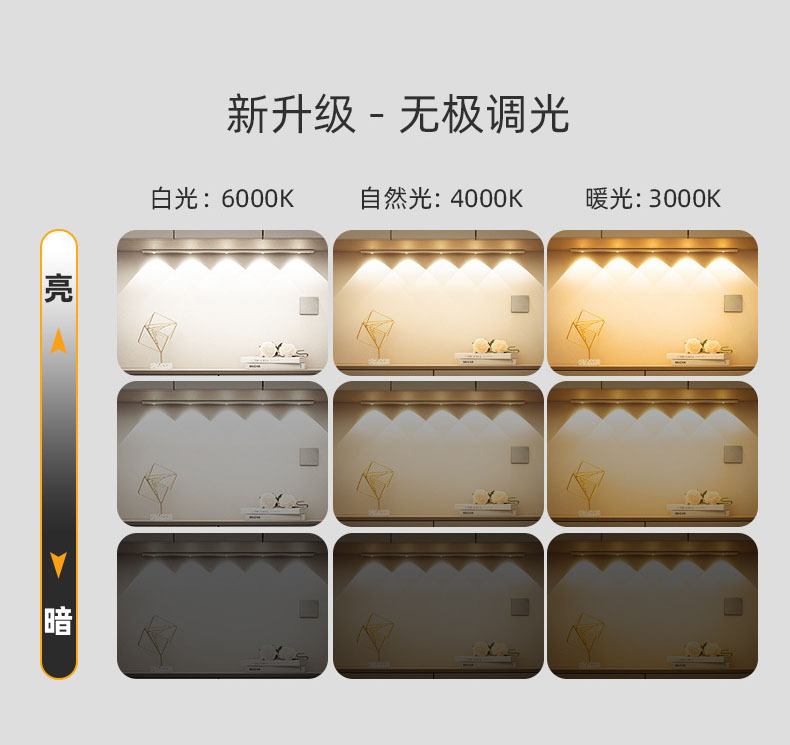 按键1(外):短按可调光色,白光,暖光,中性光随意调节,长按为无极调光可调亮度。
