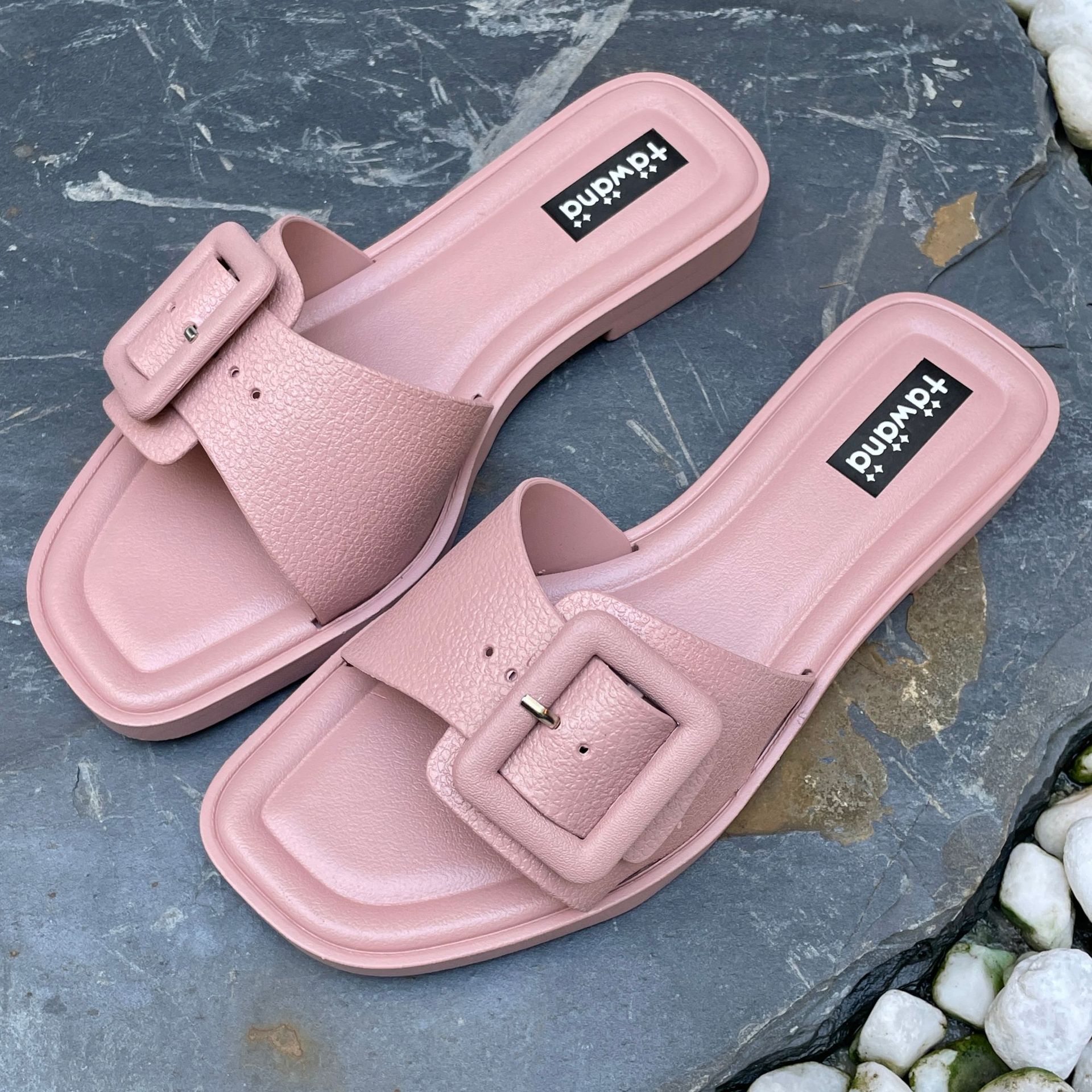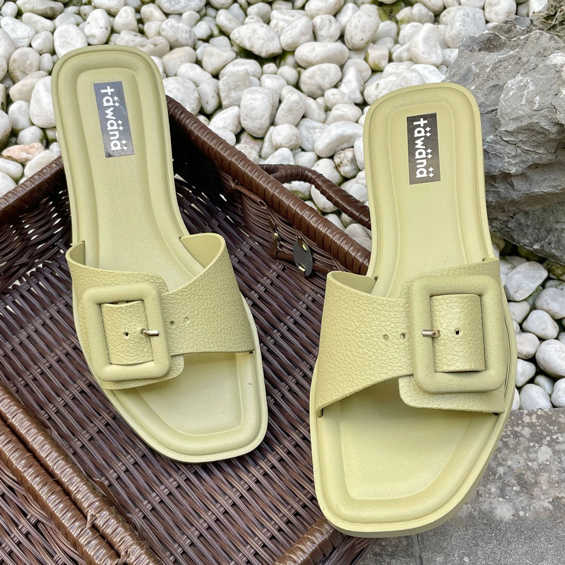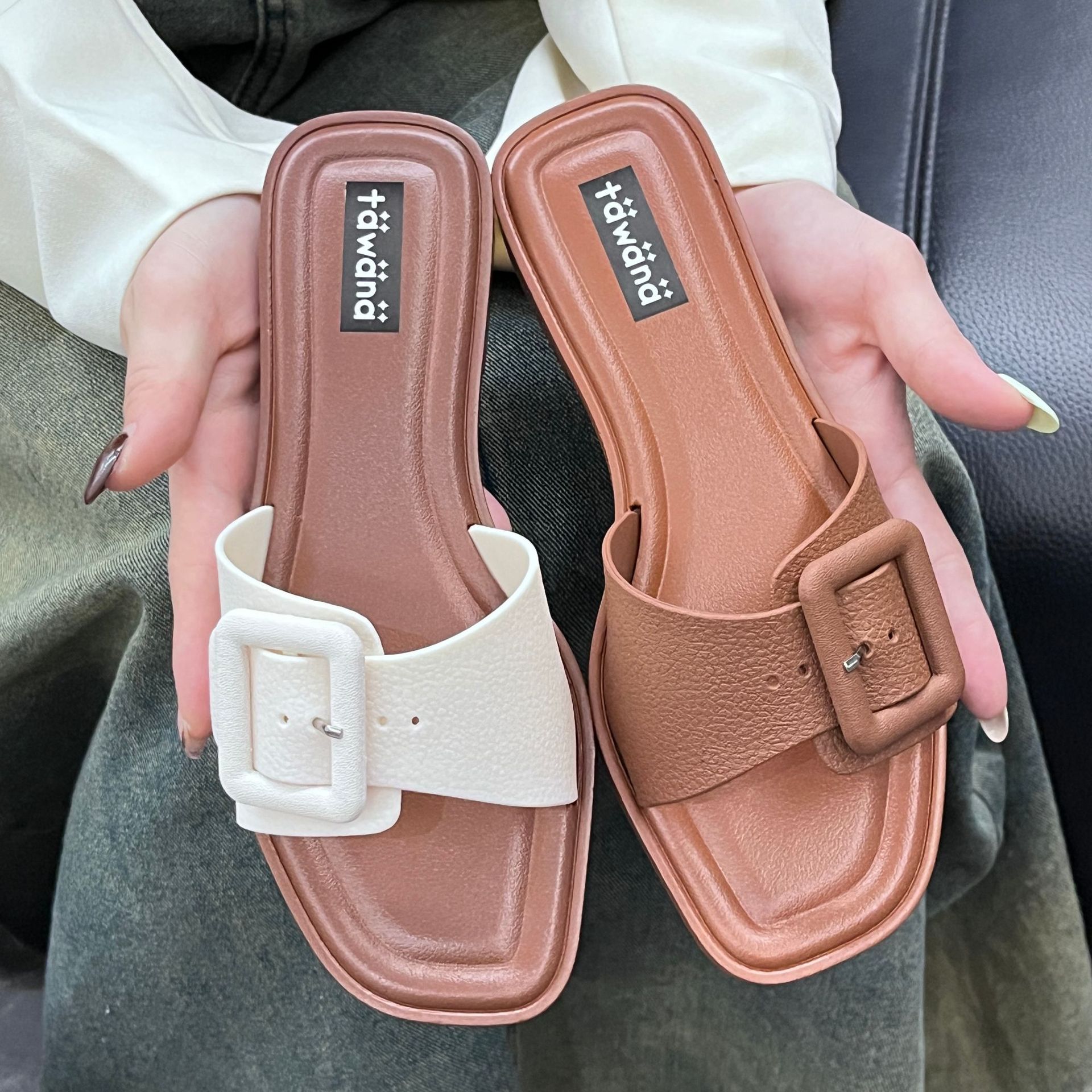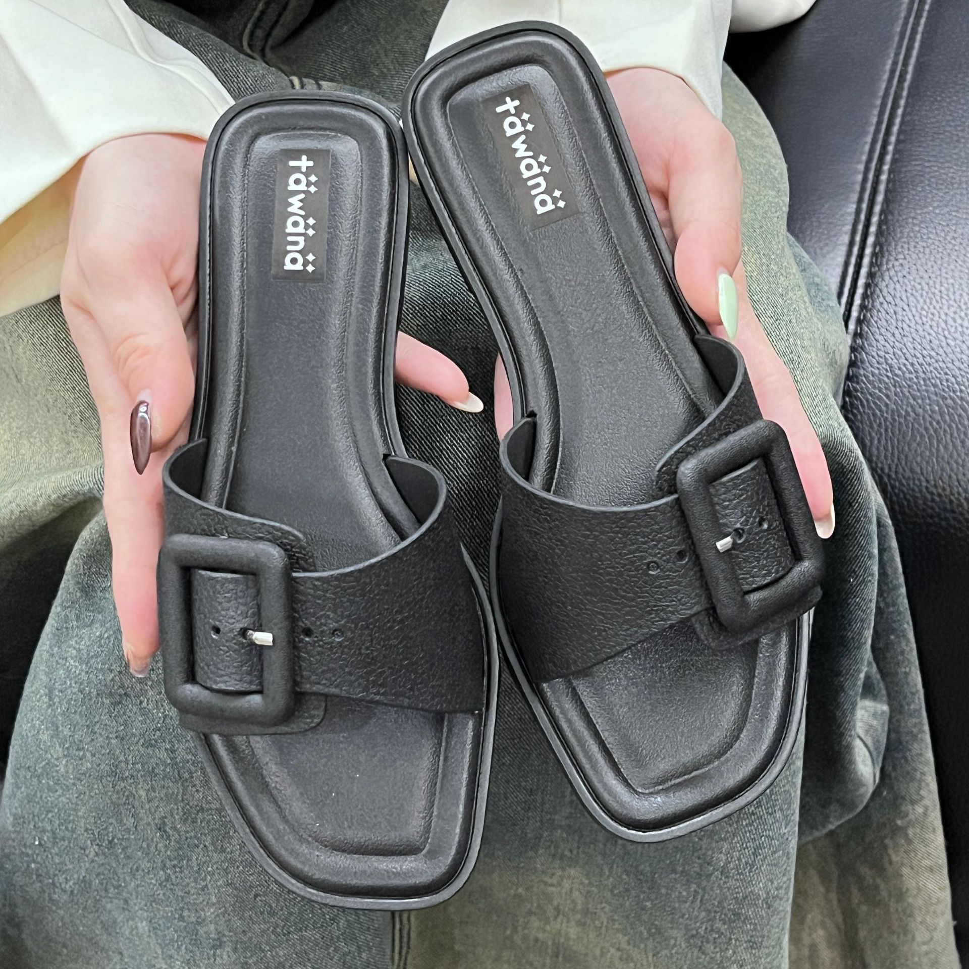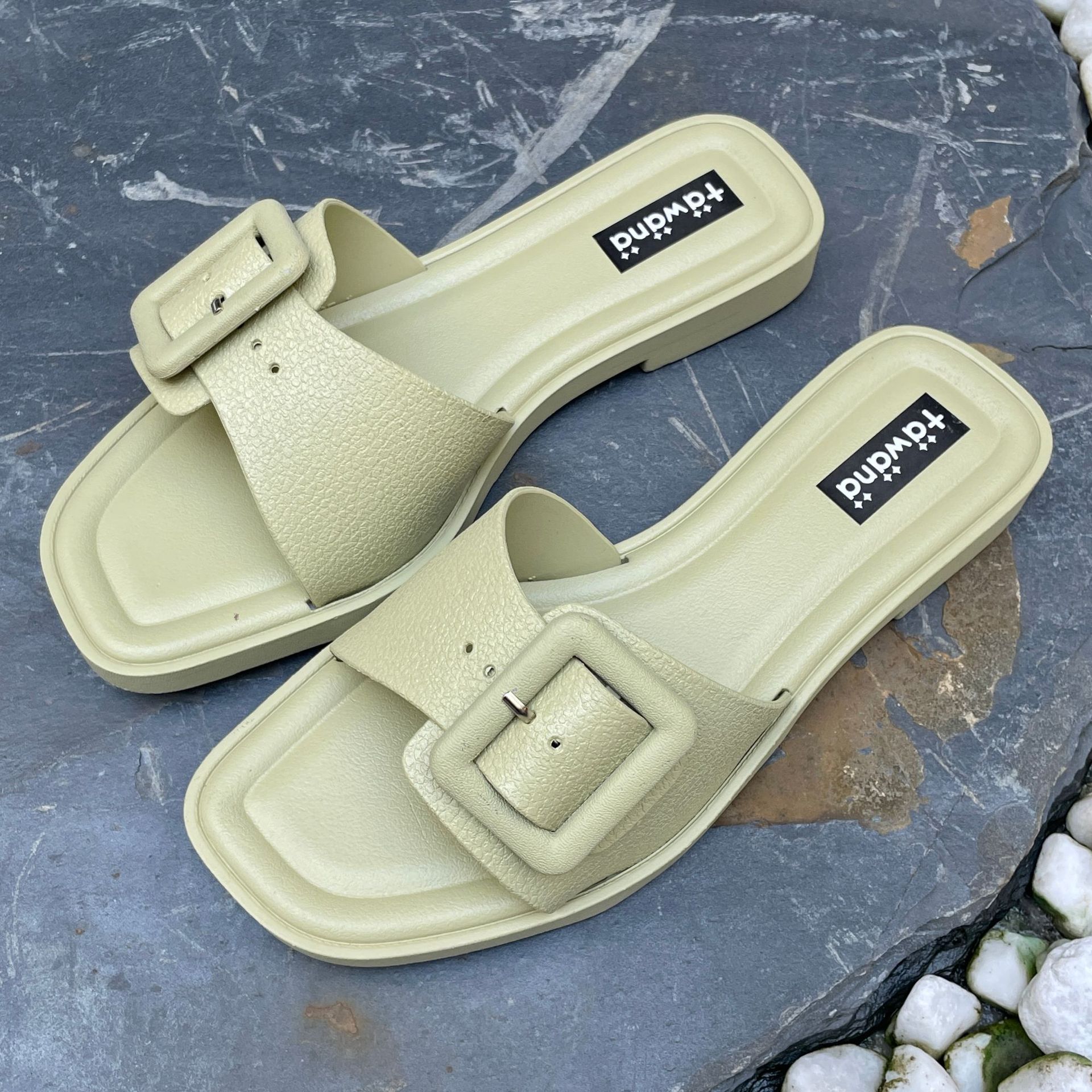 2025년 신형 여성용 슬리퍼, 신형 원라인 패셔너블 스퀘어 버클 플랫 바닥 미끄럼 방지 아우터 여성용 슬리퍼 PVC 슬리퍼 주문스토어 가기