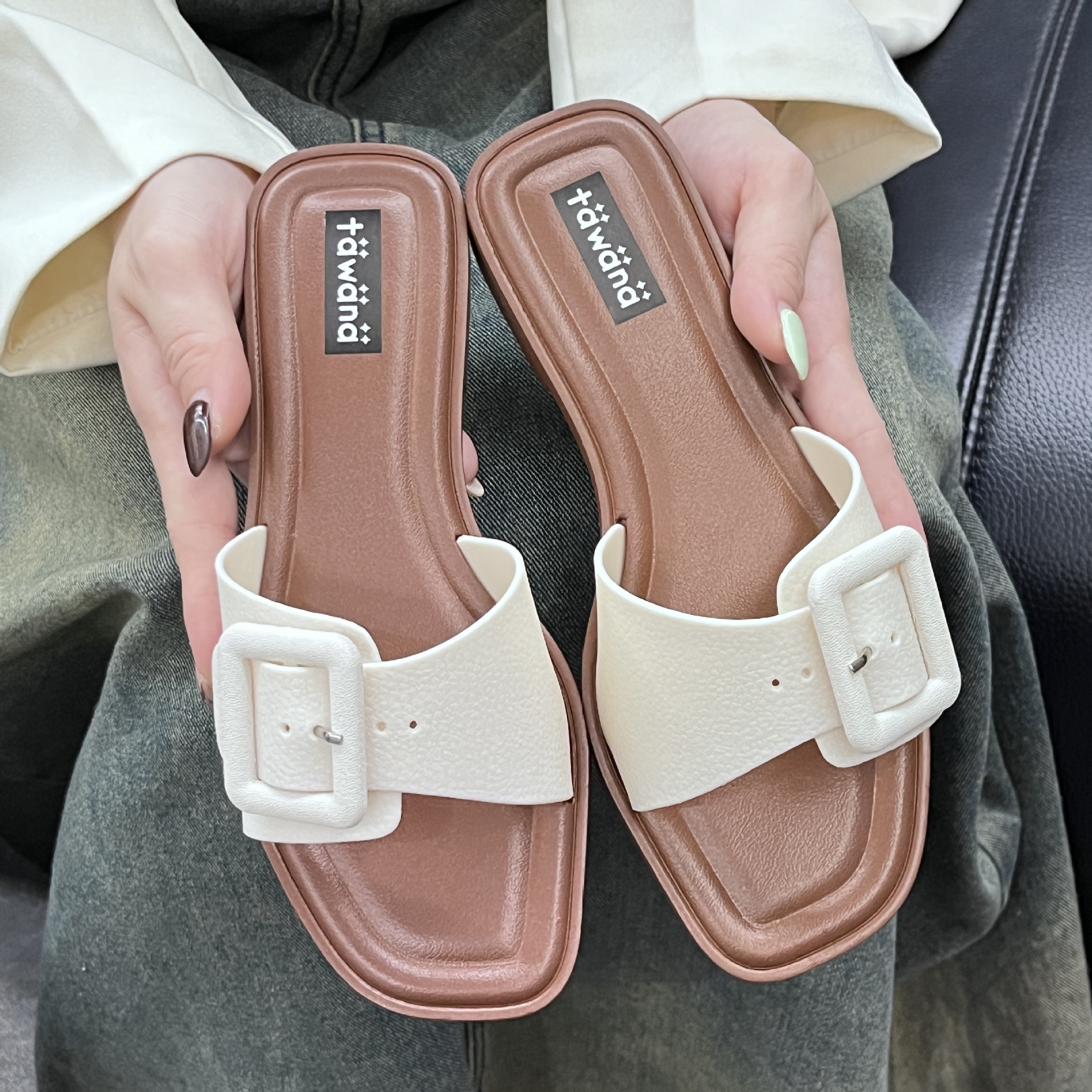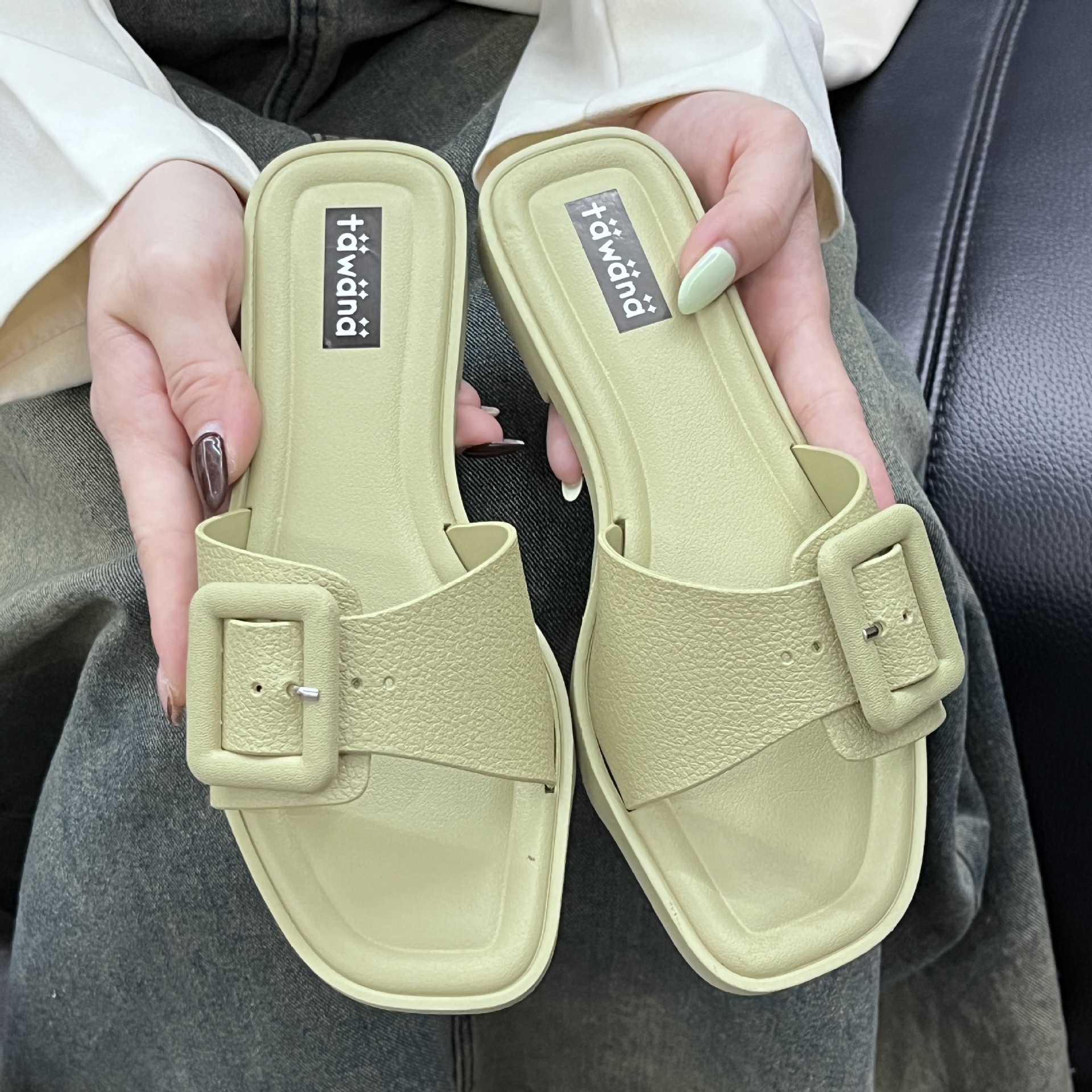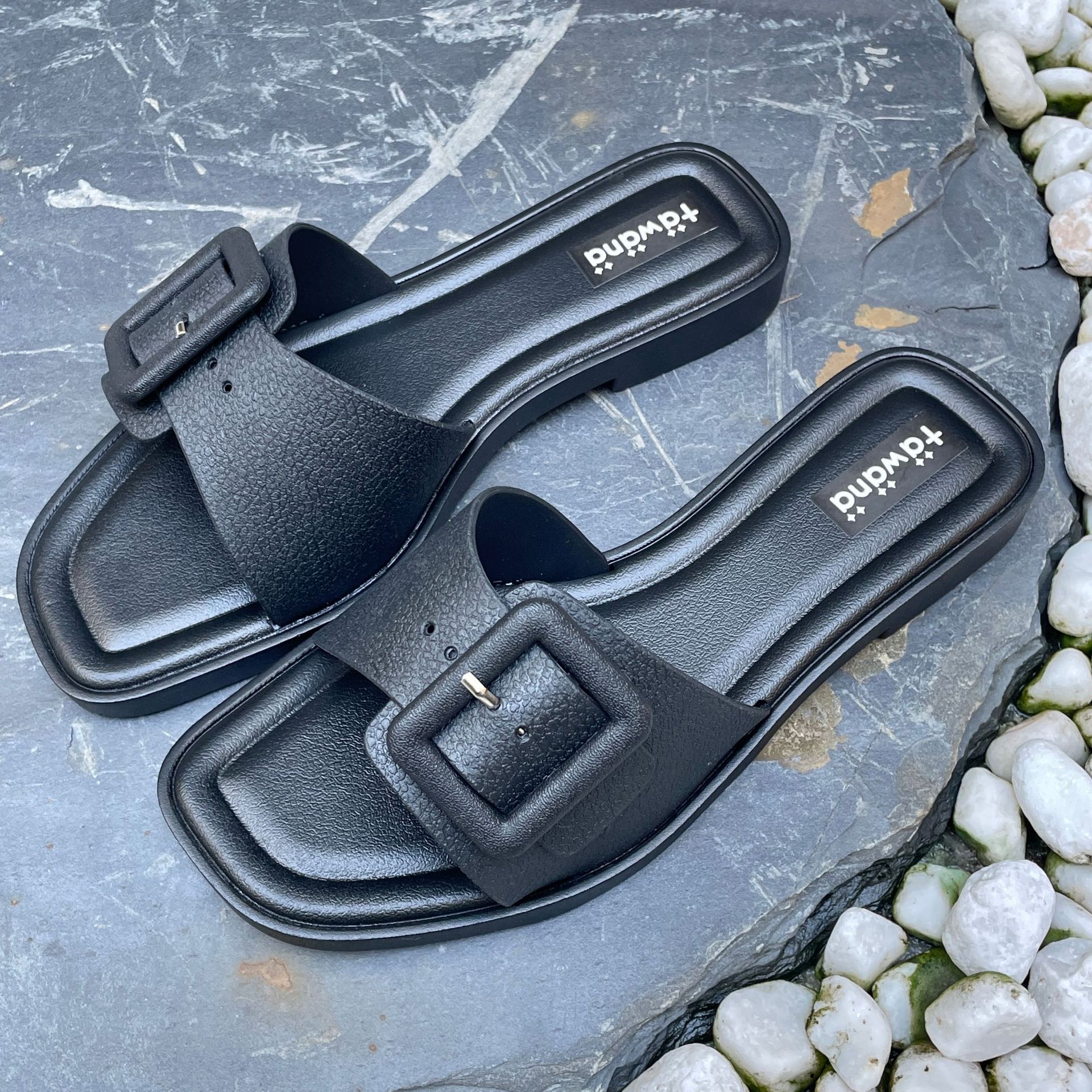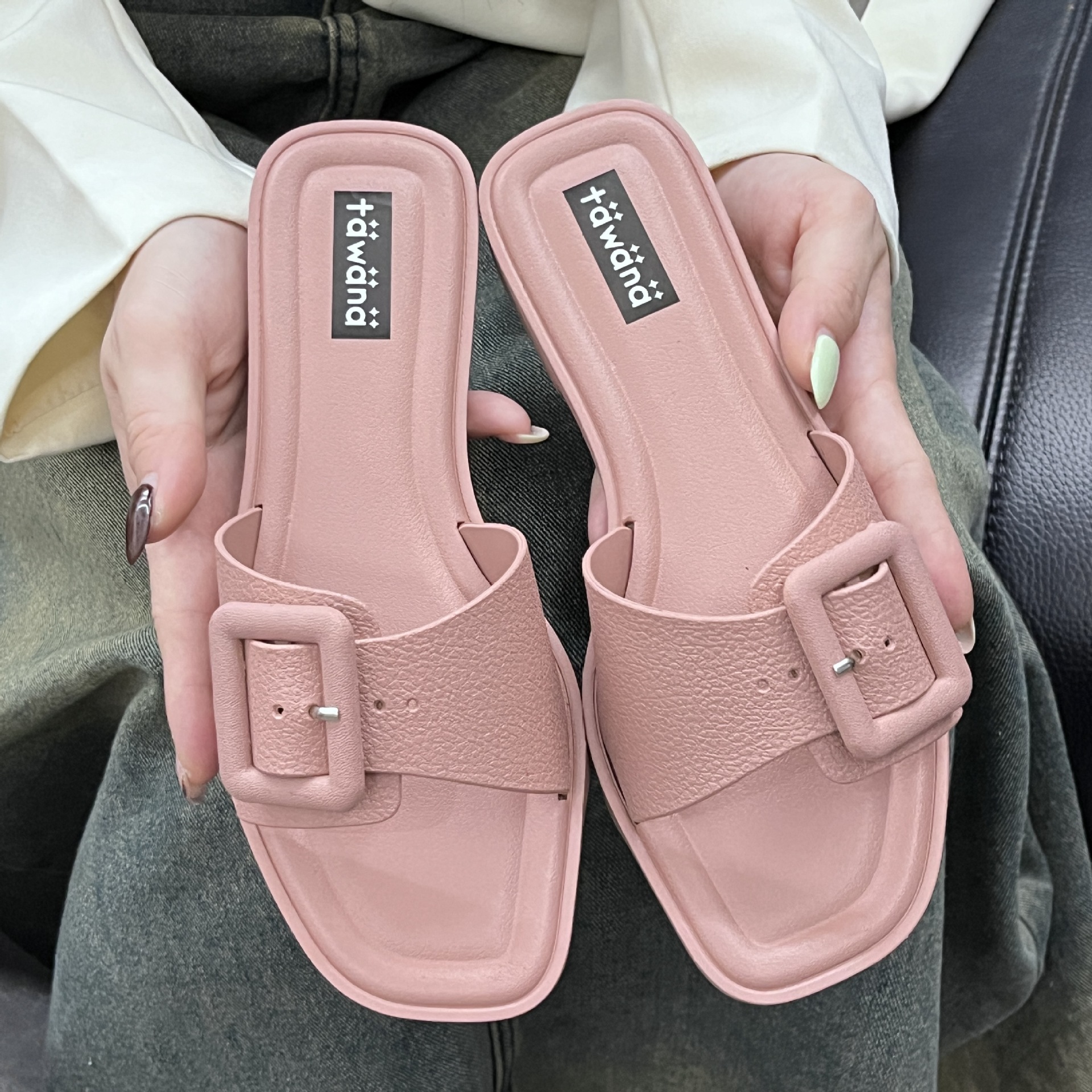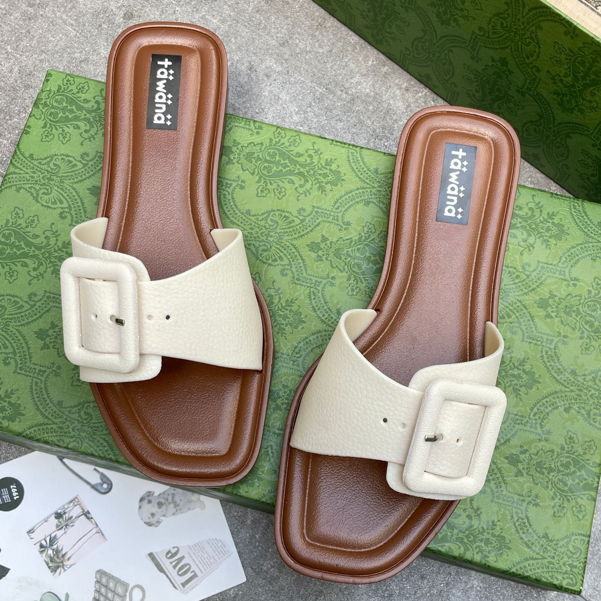 2025년 신형 여성용 슬리퍼, 신형 원라인 패셔너블 스퀘어 버클 플랫 바닥 미끄럼 방지 아우터 여성용 슬리퍼 PVC 슬리퍼 주문스토어 가기