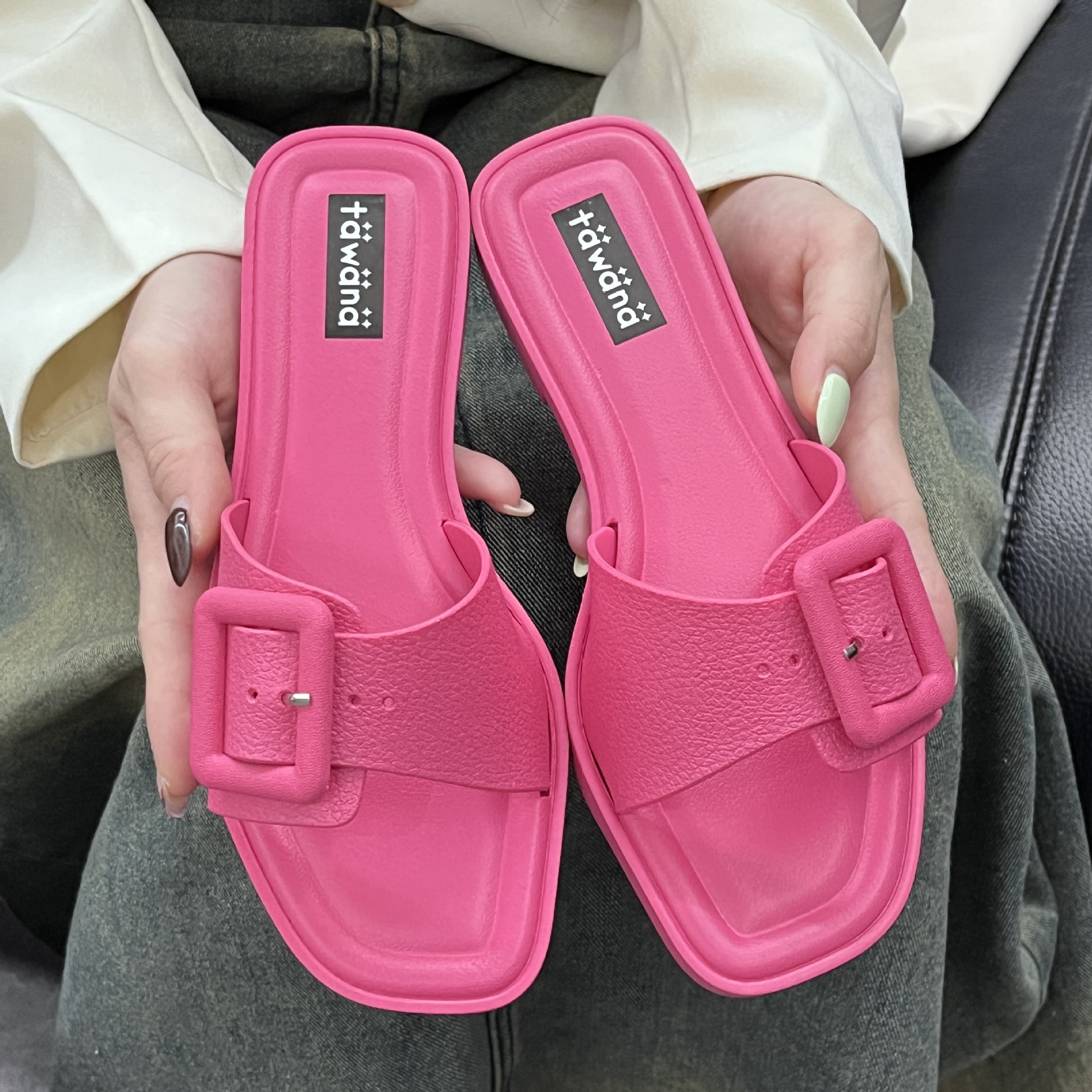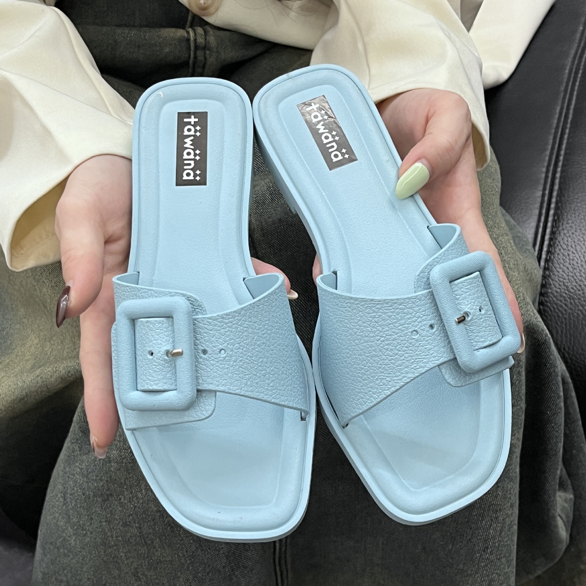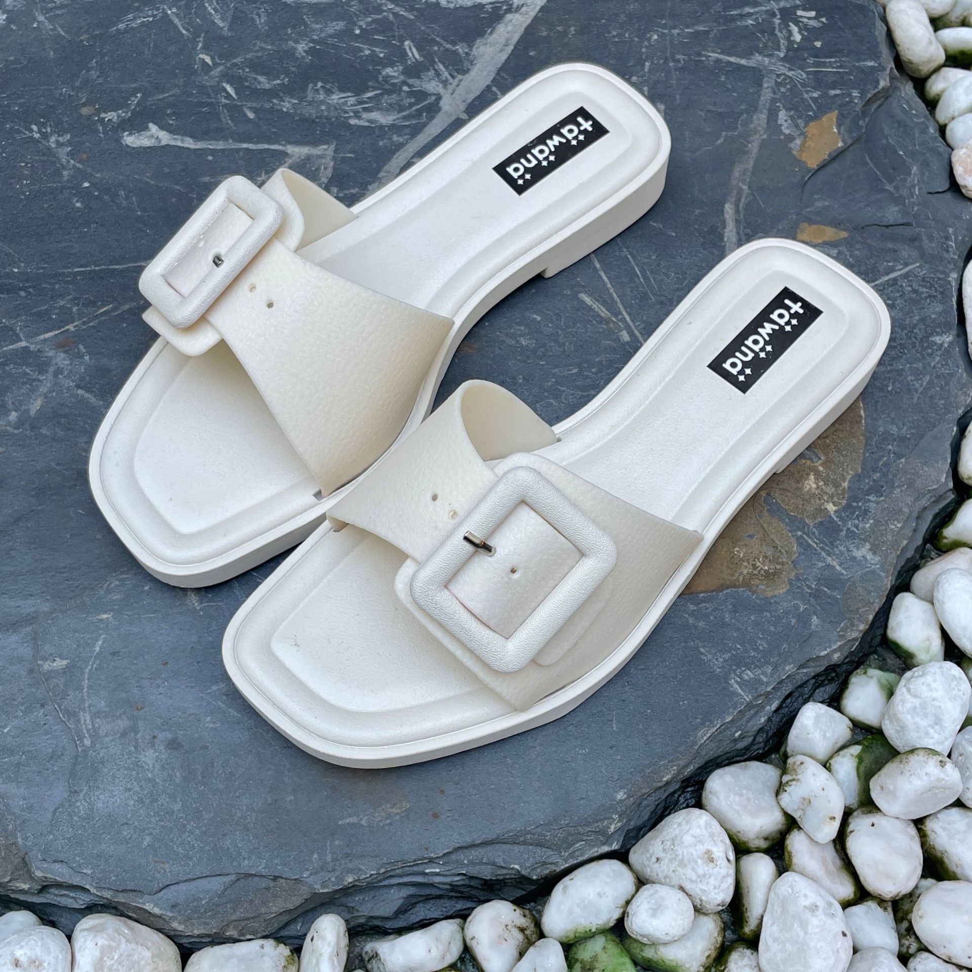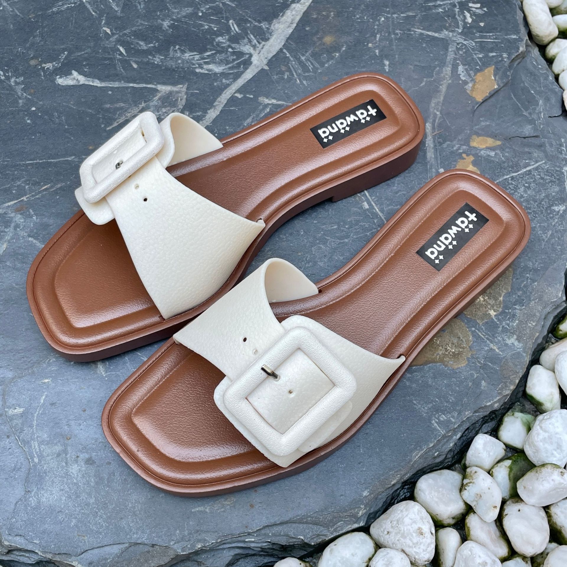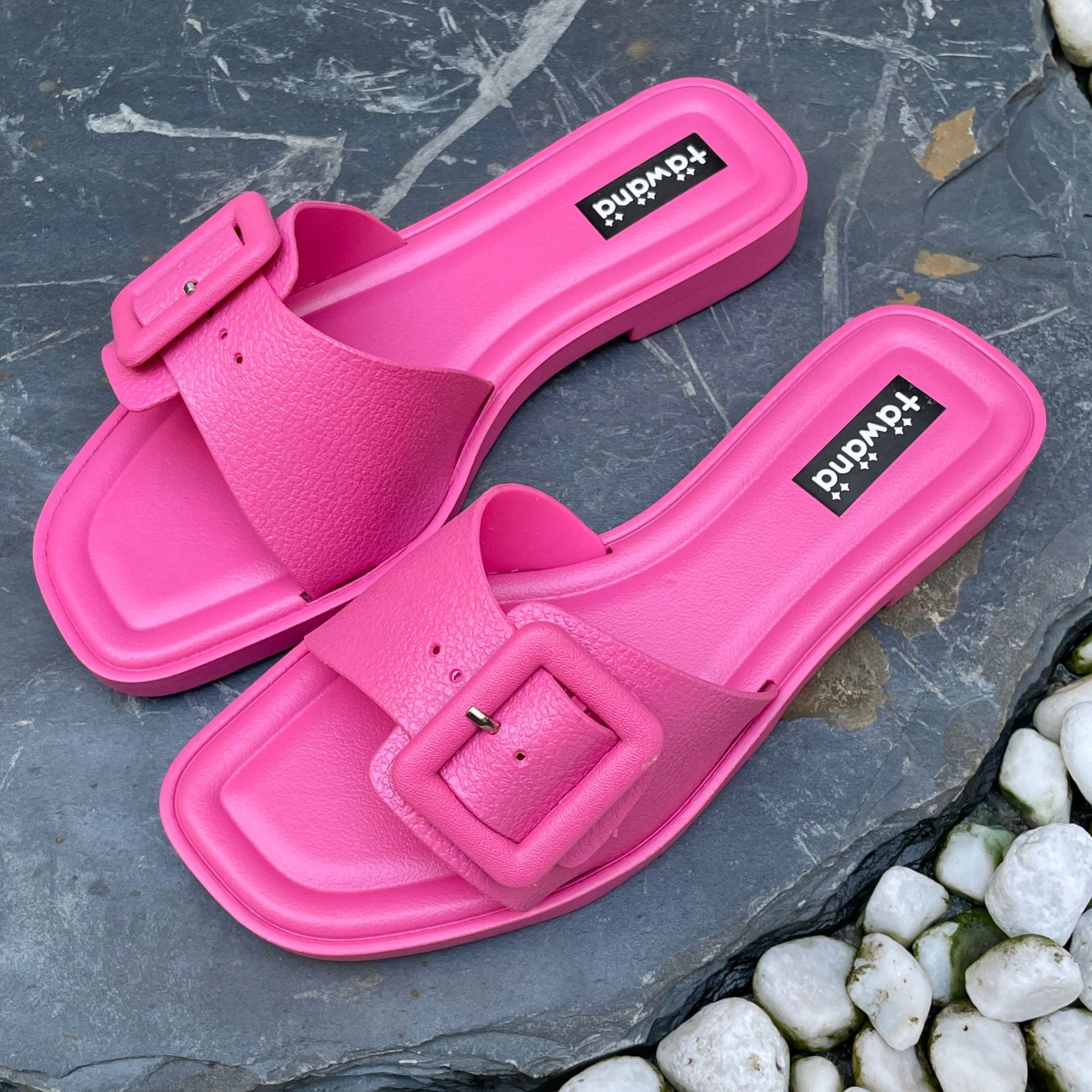 2025년 신형 여성용 슬리퍼, 신형 원라인 패셔너블 스퀘어 버클 플랫 바닥 미끄럼 방지 아우터 여성용 슬리퍼 PVC 슬리퍼 주문스토어 가기