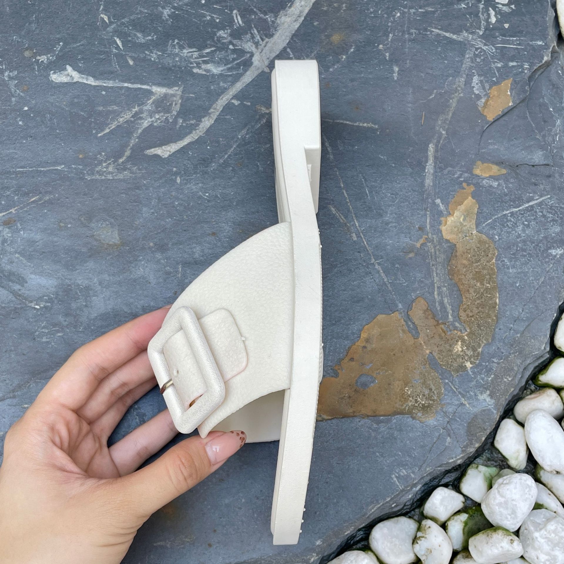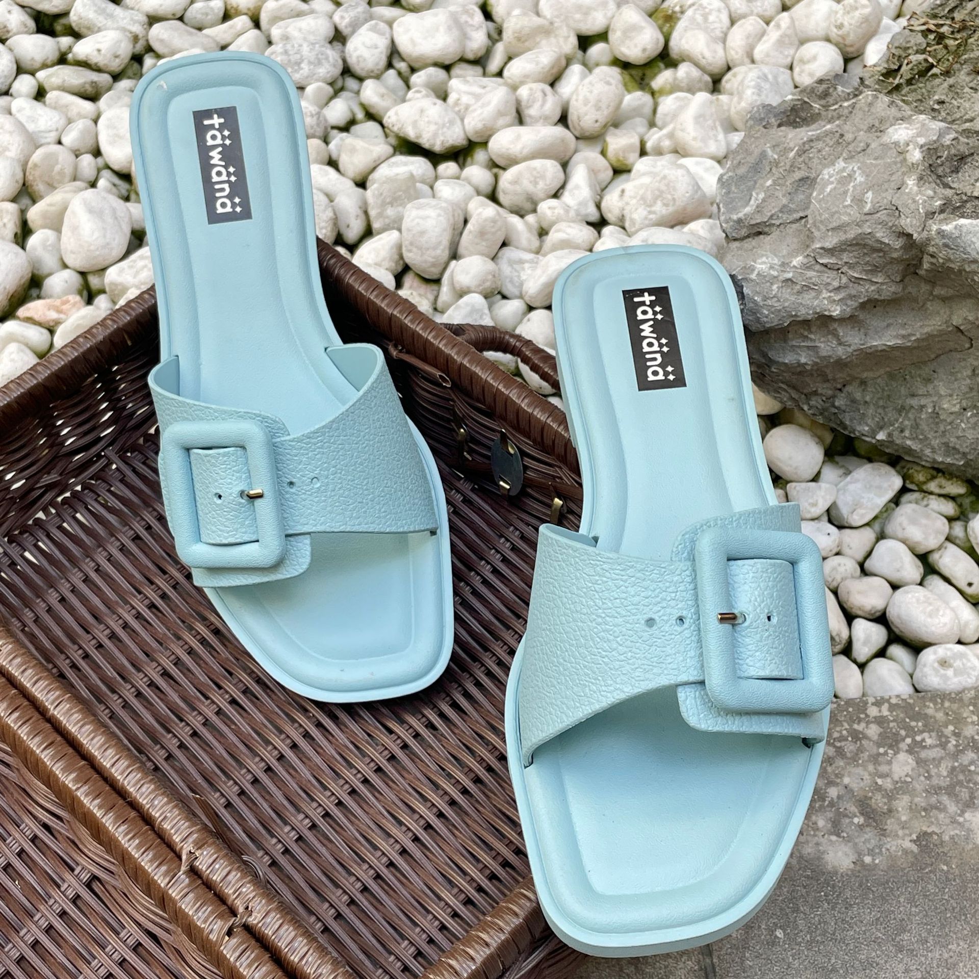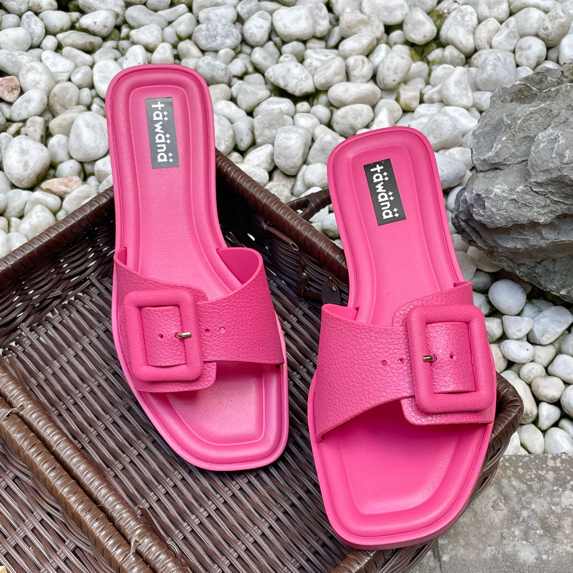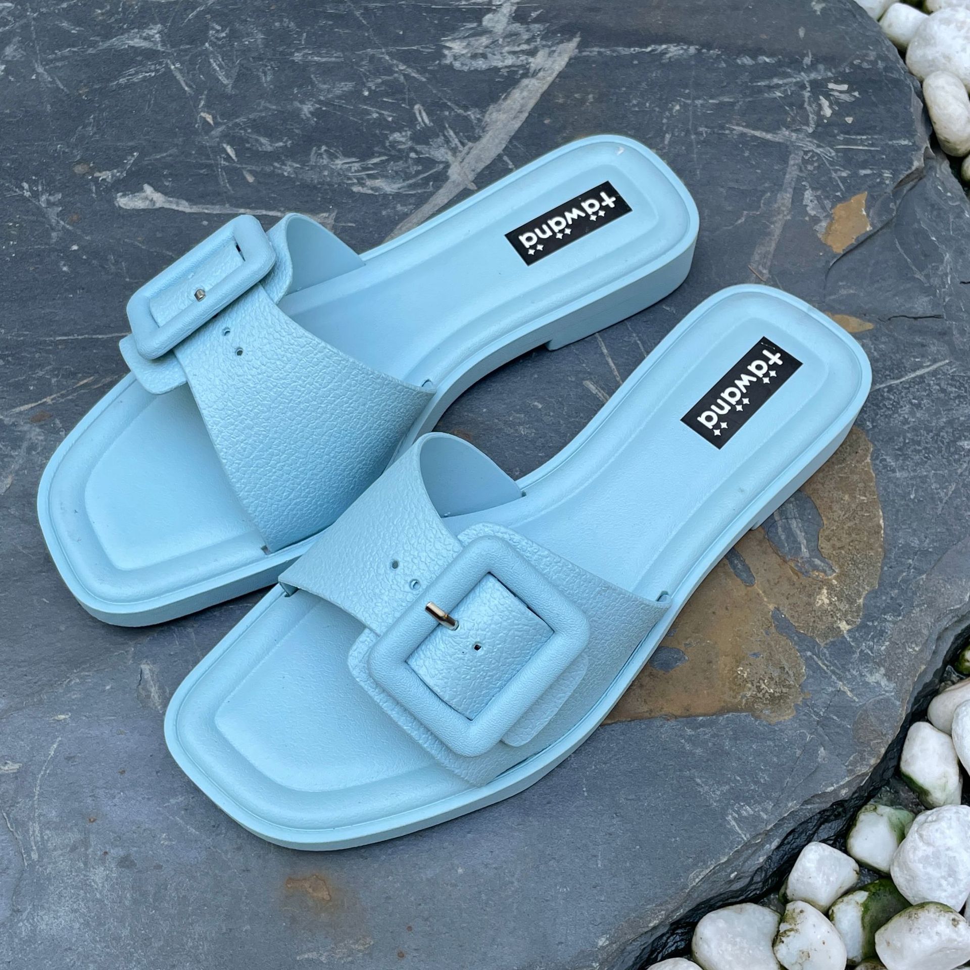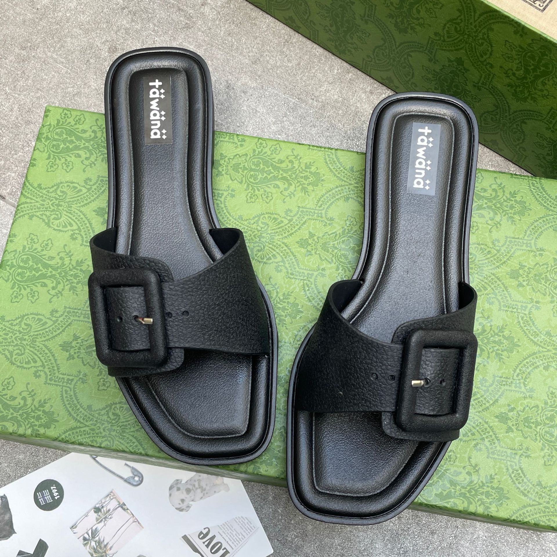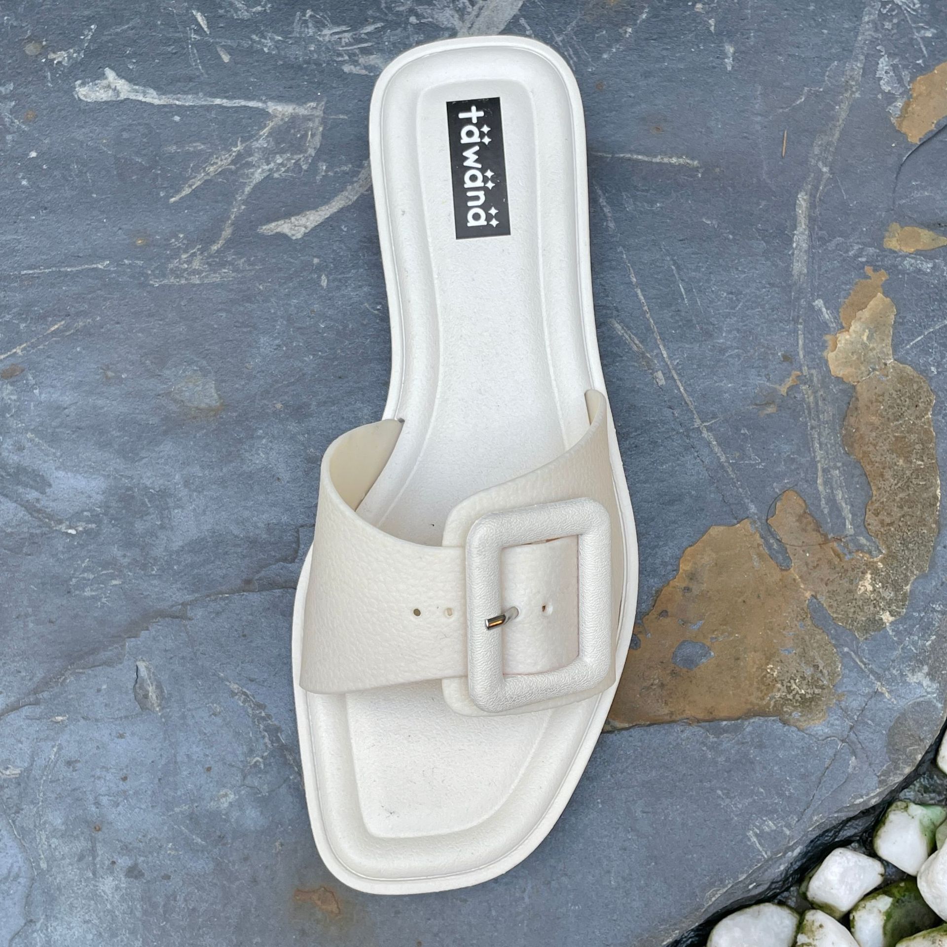 2025년 신형 여성용 슬리퍼, 신형 원라인 패셔너블 스퀘어 버클 플랫 바닥 미끄럼 방지 아우터 여성용 슬리퍼 PVC 슬리퍼 주문스토어 가기