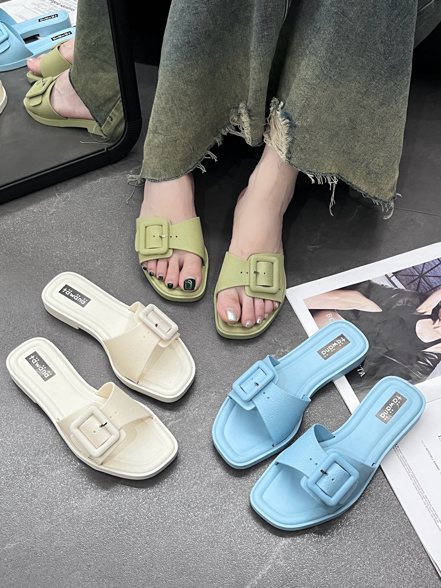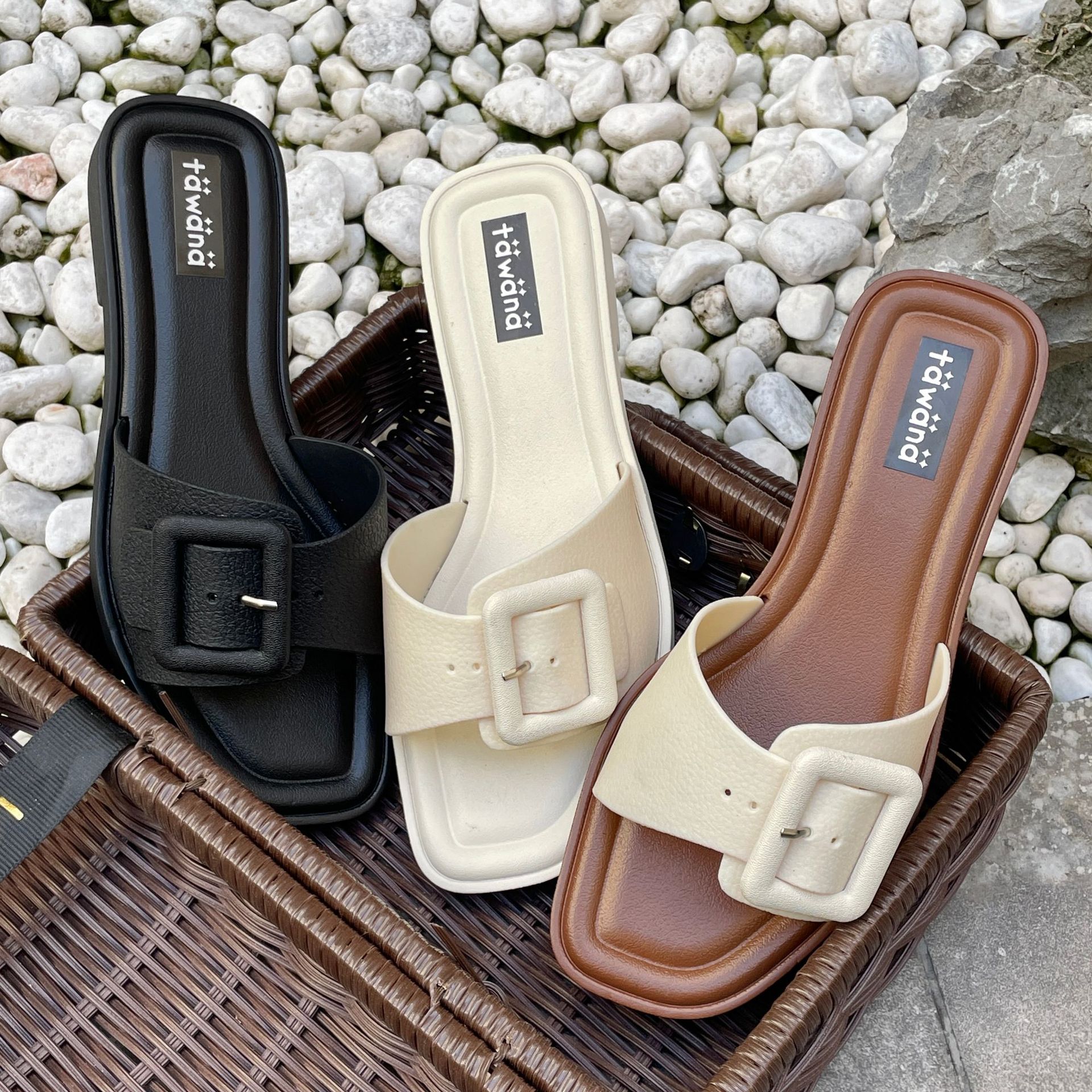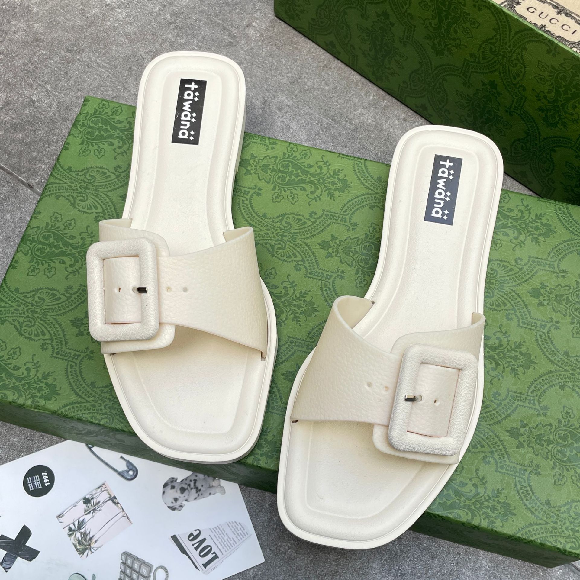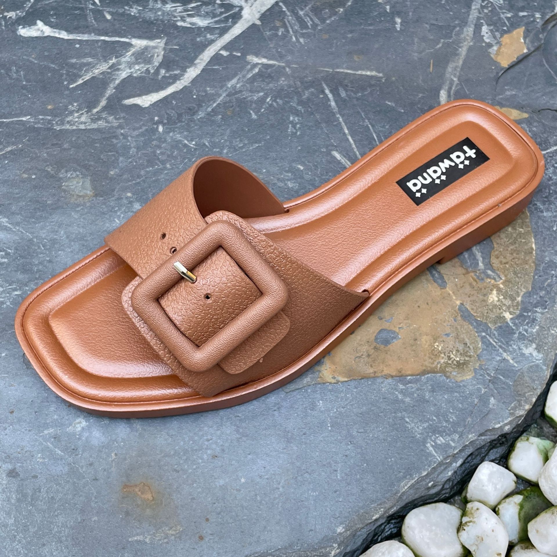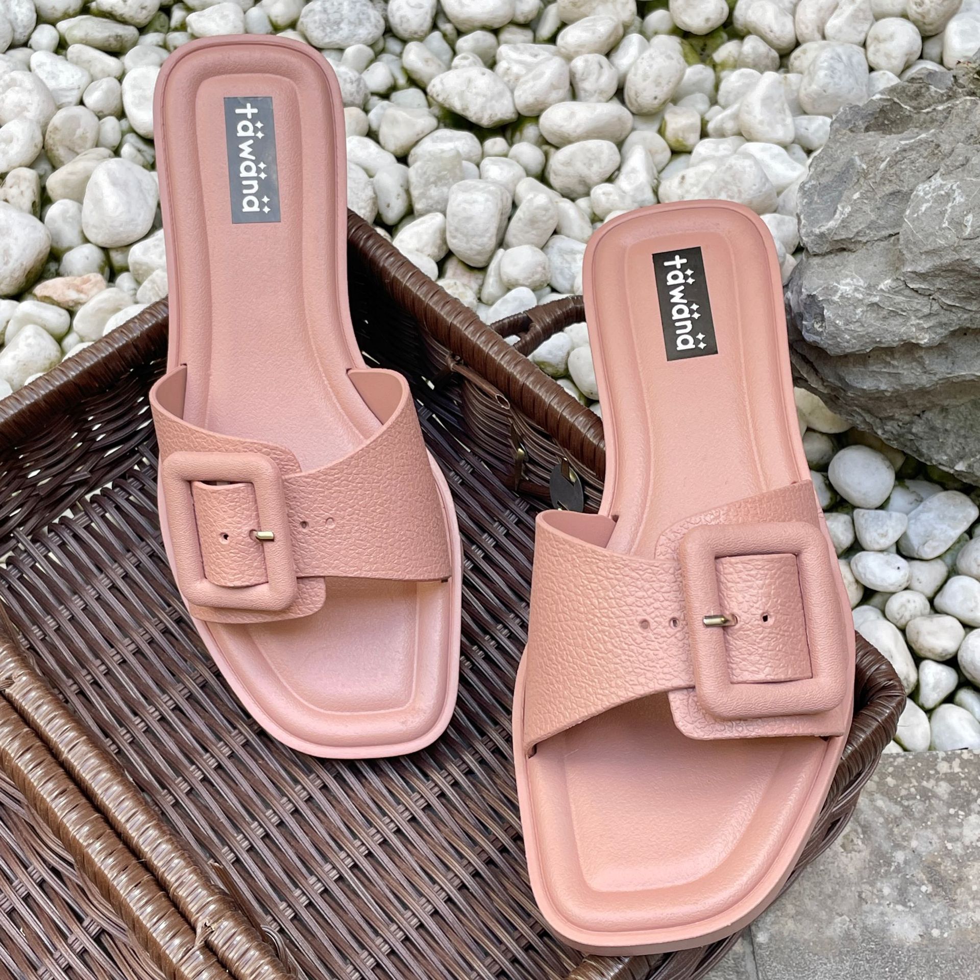 2025년 신형 여성용 슬리퍼, 신형 원라인 패셔너블 스퀘어 버클 플랫 바닥 미끄럼 방지 아우터 여성용 슬리퍼 PVC 슬리퍼 주문스토어 가기