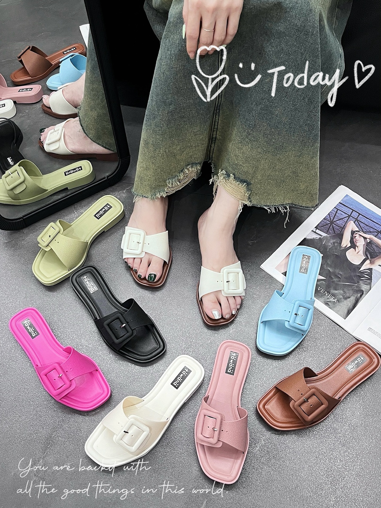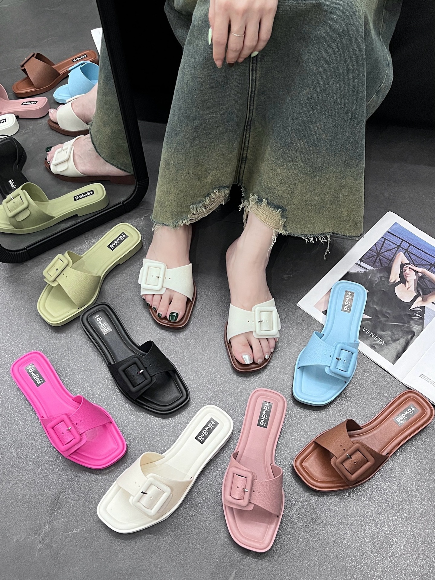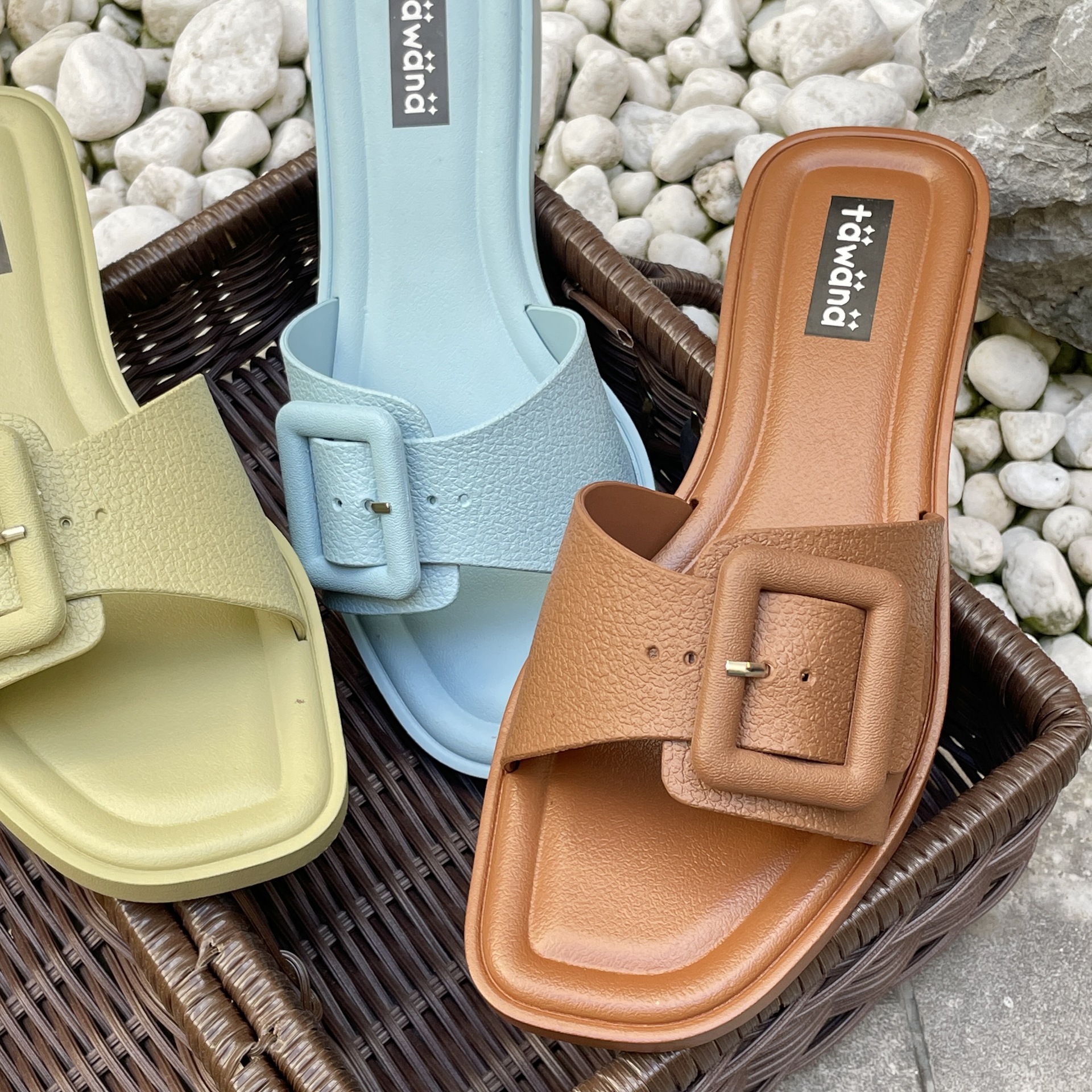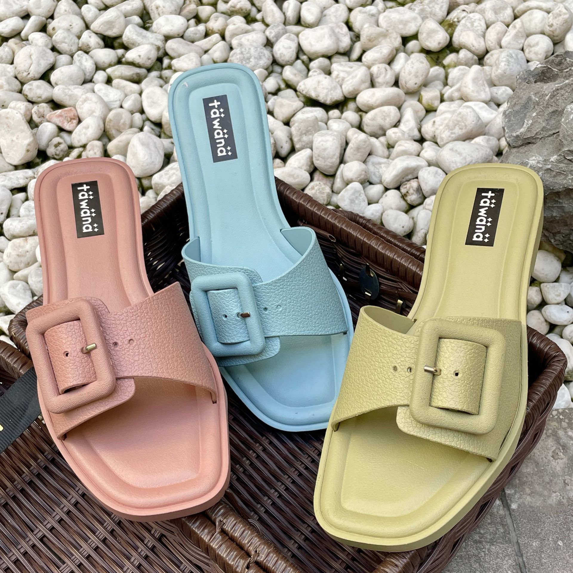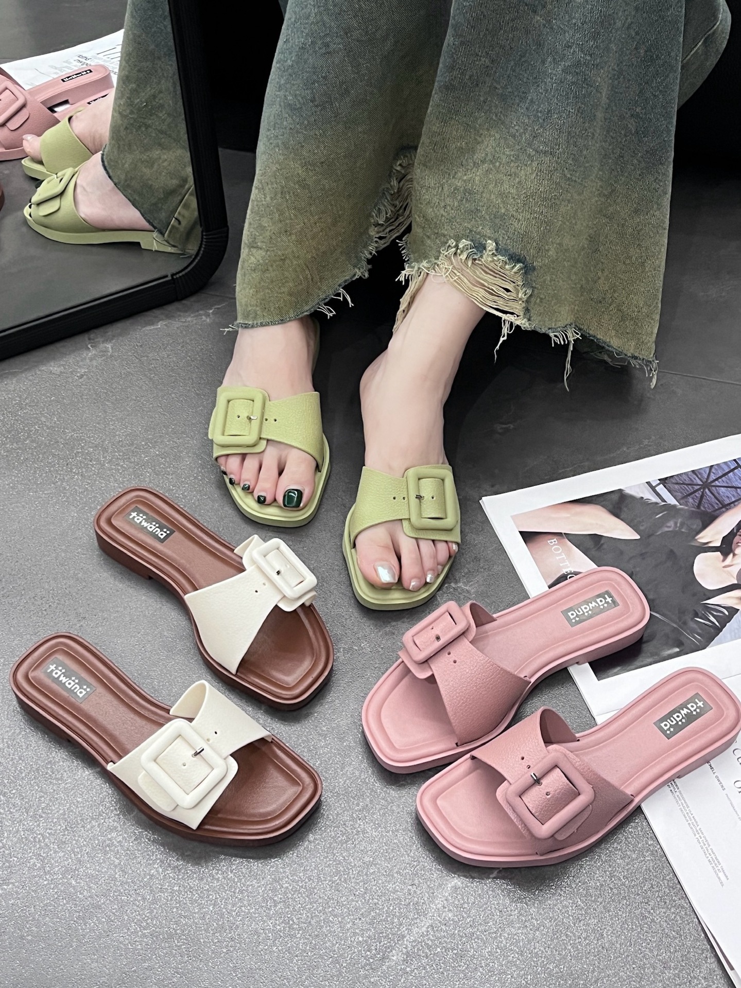 2025년 신형 여성용 슬리퍼, 신형 원라인 패셔너블 스퀘어 버클 플랫 바닥 미끄럼 방지 아우터 여성용 슬리퍼 PVC 슬리퍼 주문스토어 가기