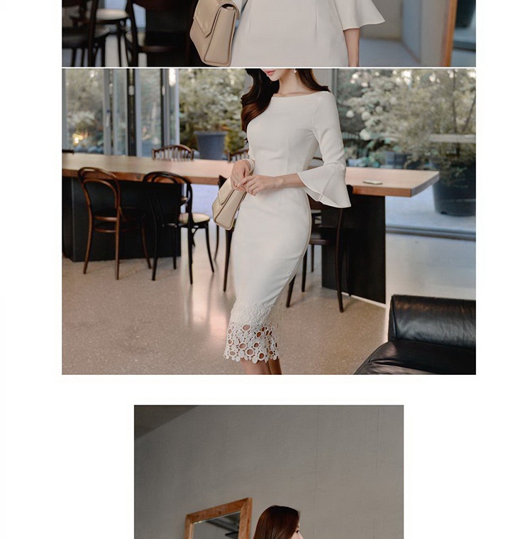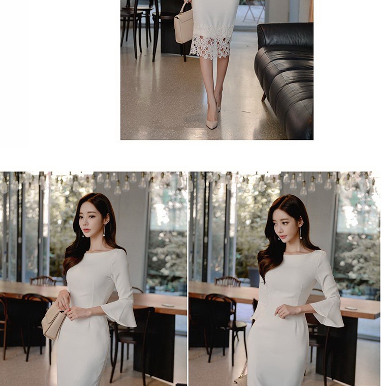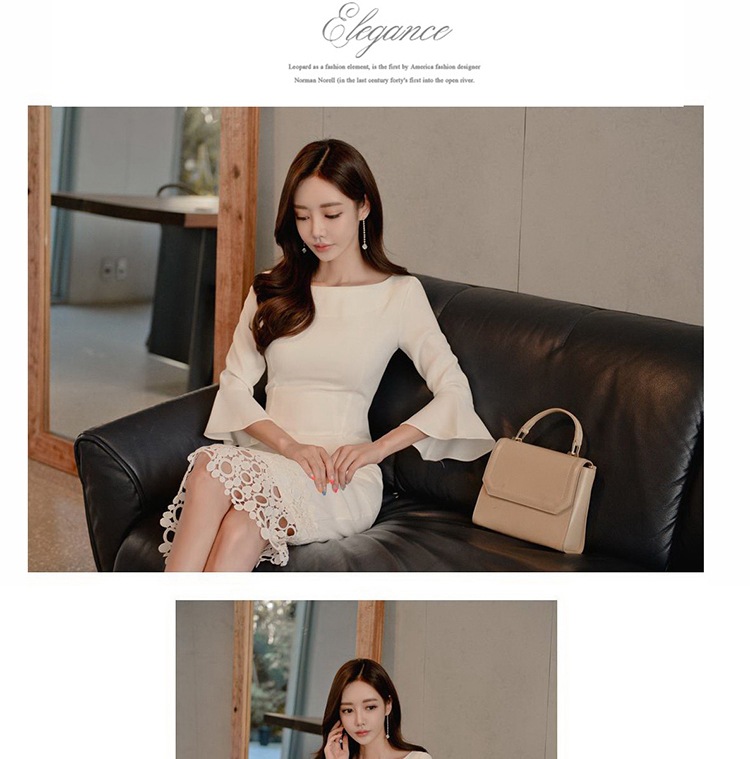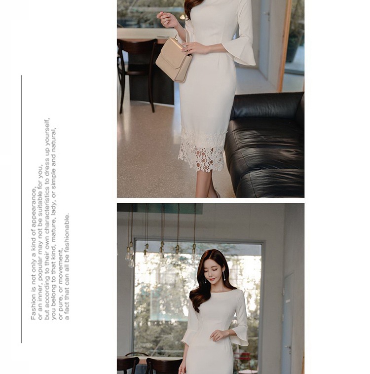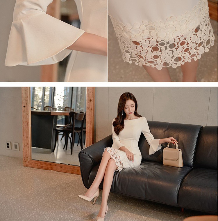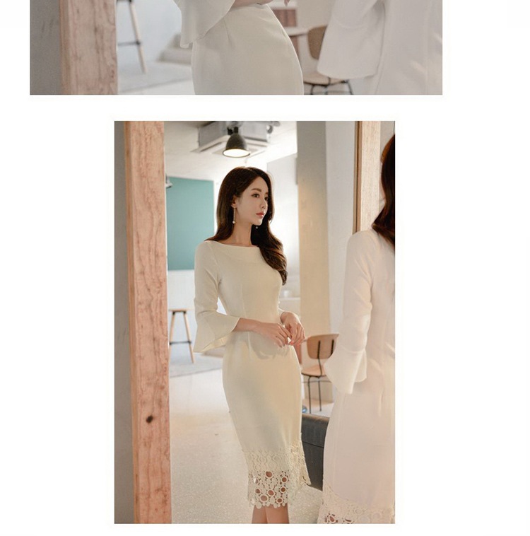 2025 봄과 가을 새로운 우아한 우아한 트럼펫 소매 레이스 스티칭 슬리밍 통근 솔리드 컬러 원피스 베이스 스커트스토어 가기