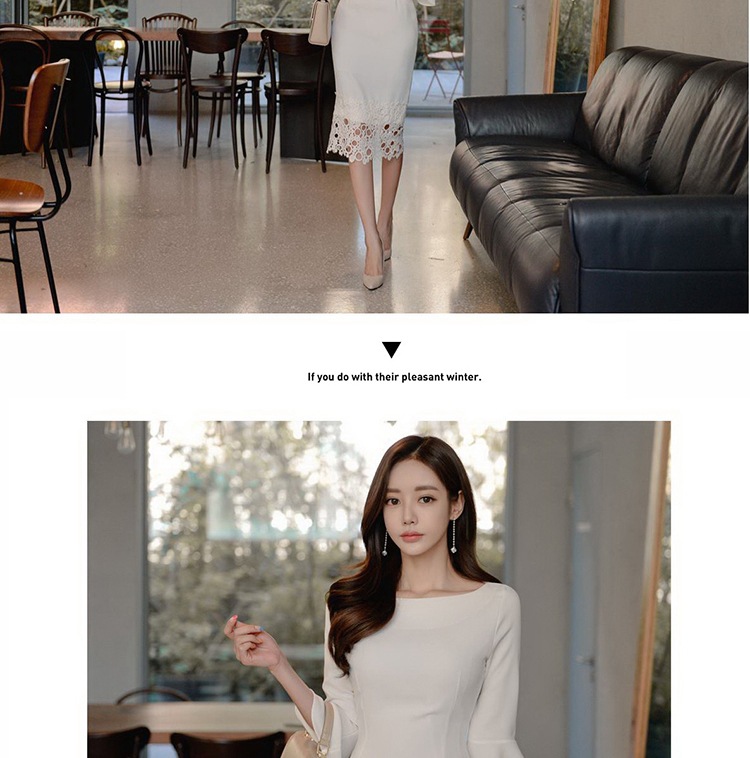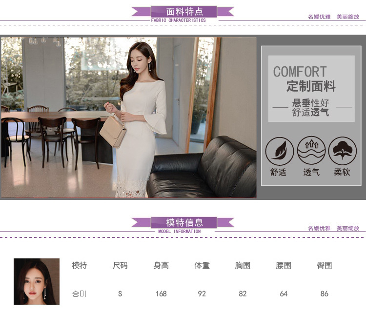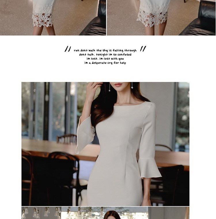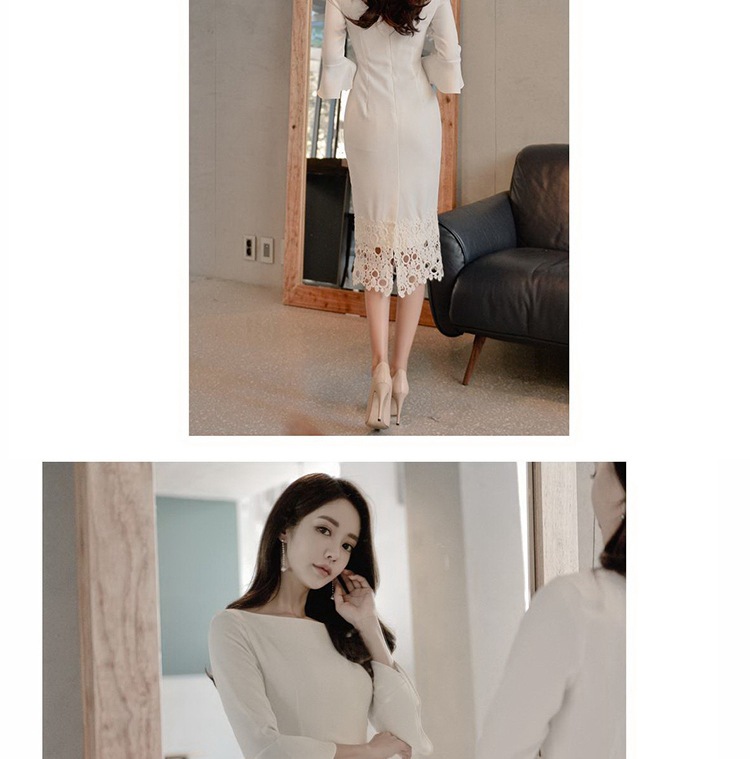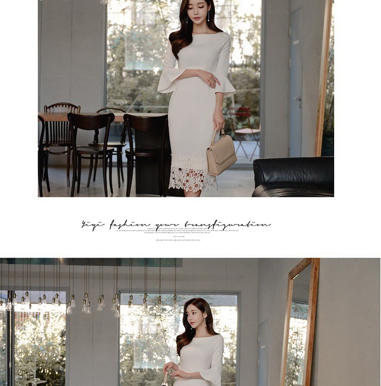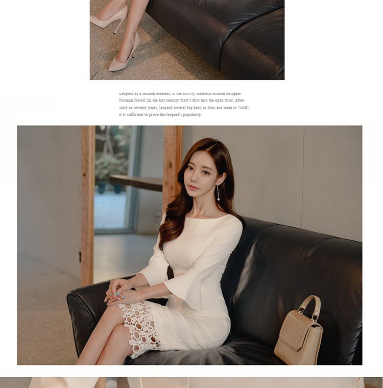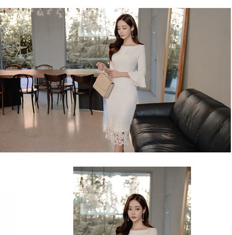 2025 봄과 가을 새로운 우아한 우아한 트럼펫 소매 레이스 스티칭 슬리밍 통근 솔리드 컬러 원피스 베이스 스커트스토어 가기