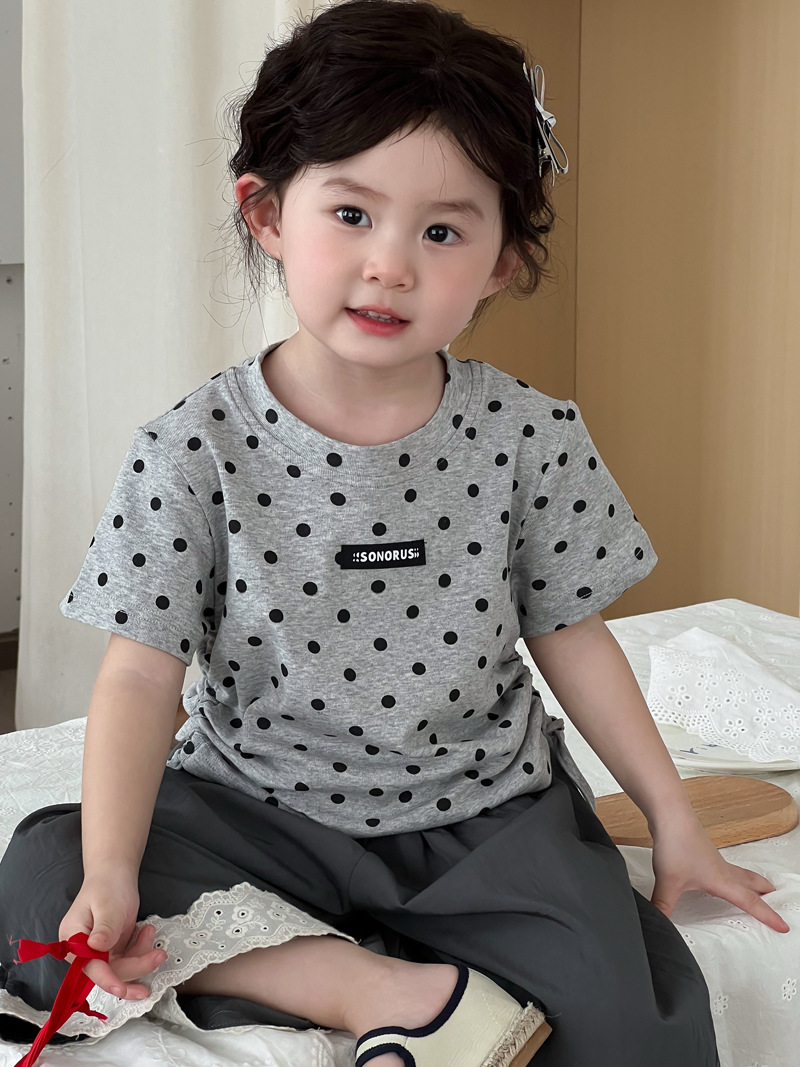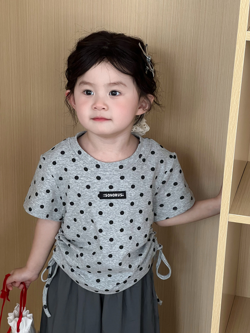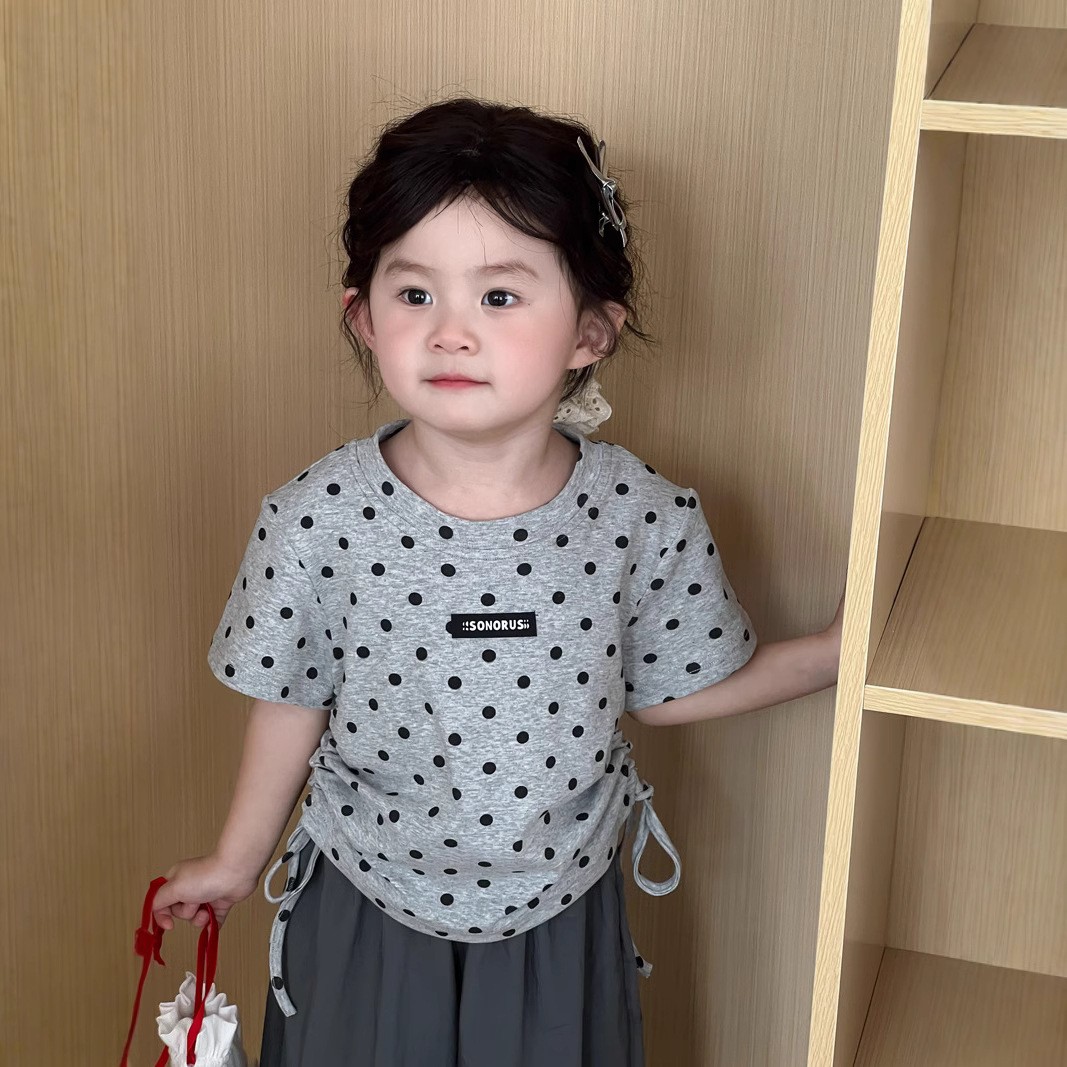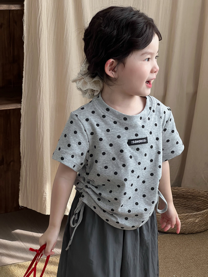 한국 스타일 소녀 2025 여름 새로운 도착 폴로 도트 인쇄 반팔 티셔츠 어린이 트렌디 쇼트 탑
