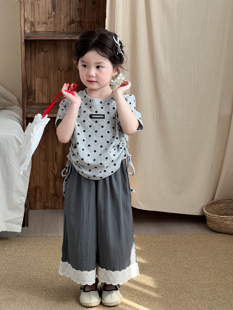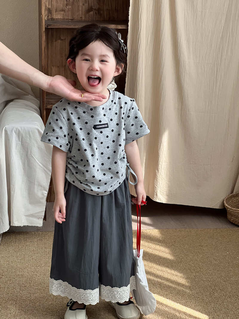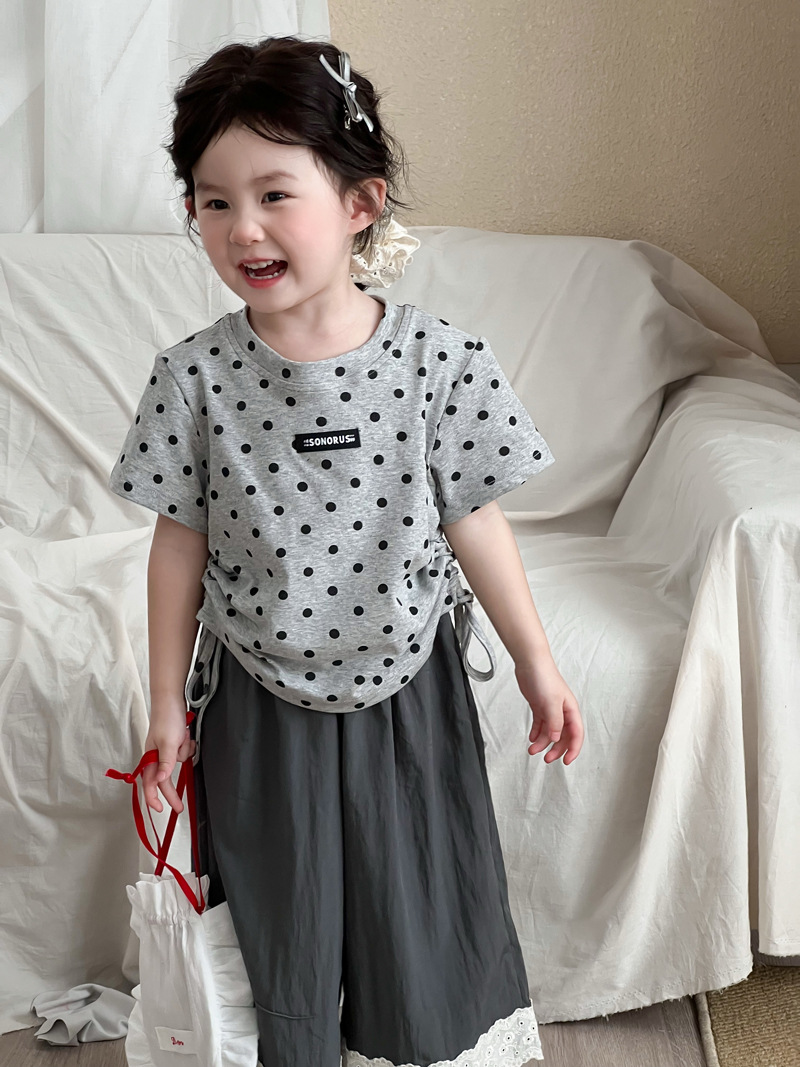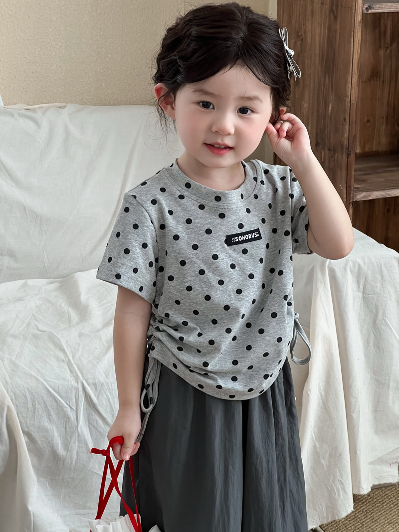 한국 스타일 소녀 2025 여름 새로운 도착 폴로 도트 인쇄 반팔 티셔츠 어린이 트렌디 쇼트 탑
