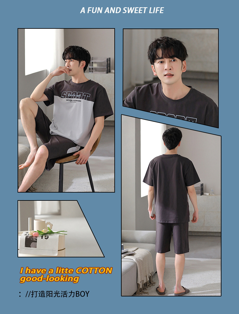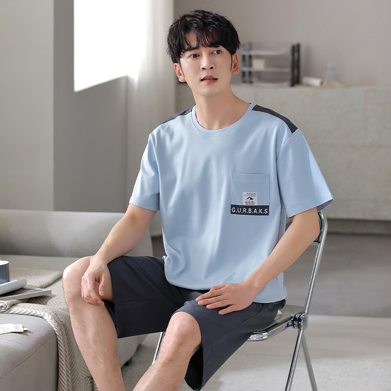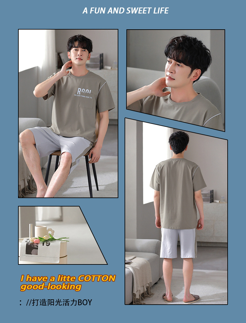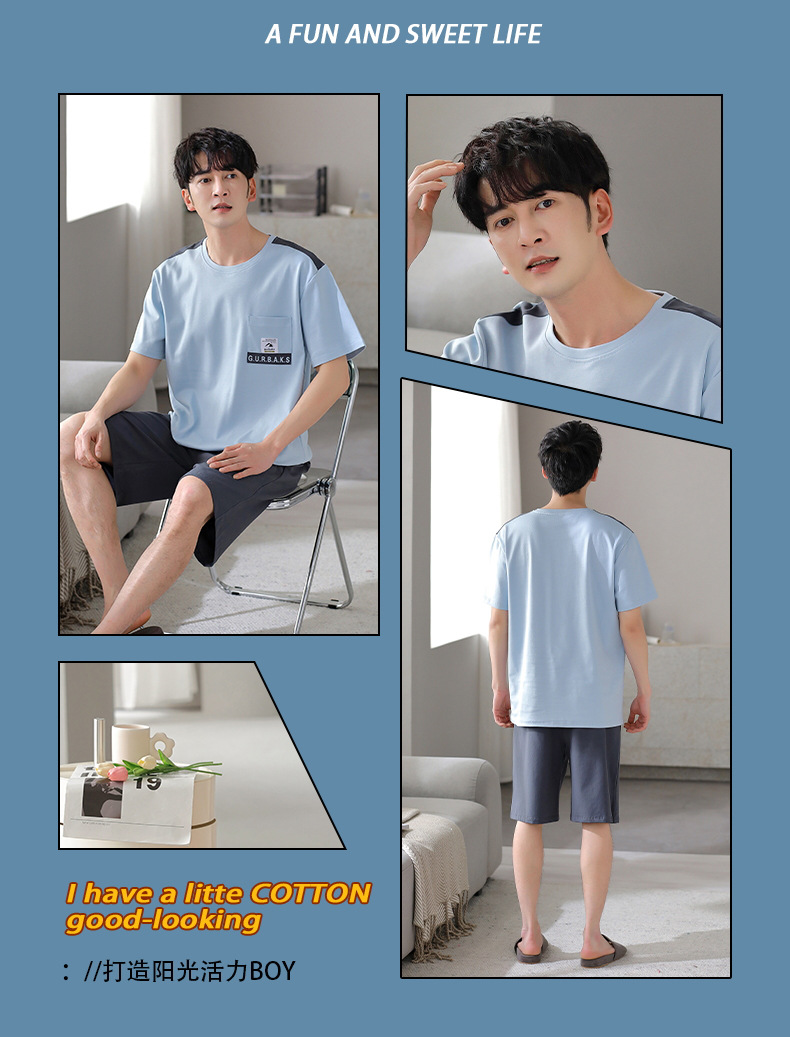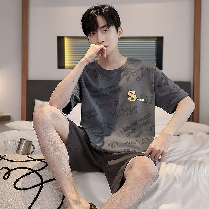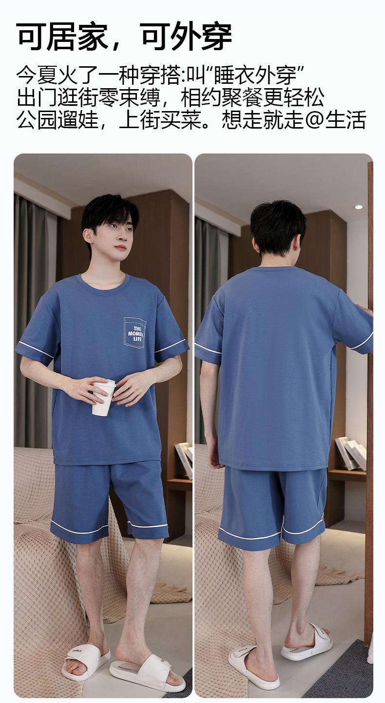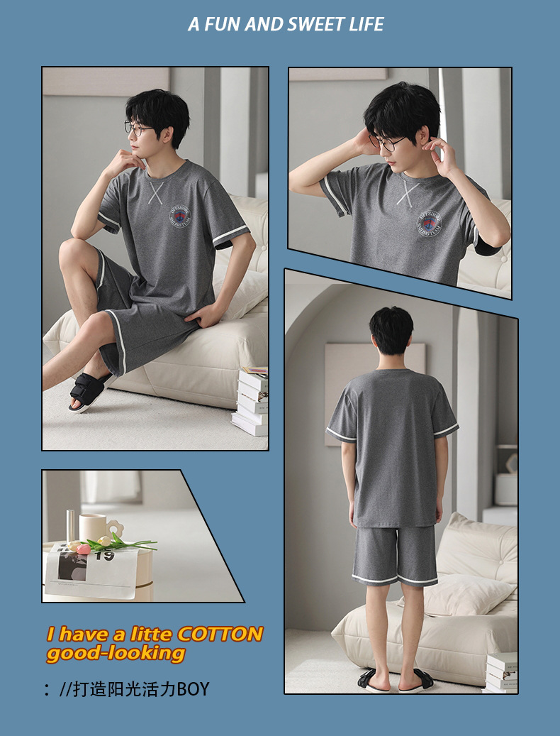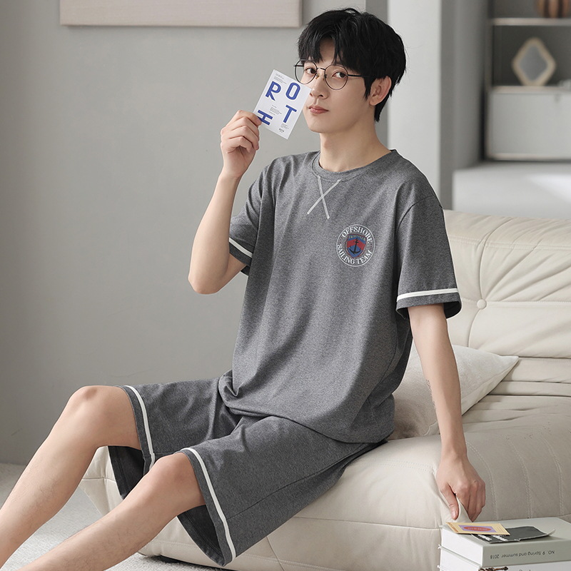 퓨어 코튼 파자마 남자 여름 반팔 반바지 얇은 청소년 캐주얼 스포츠 간단한 라운드 넥 홈웨어 외주스토어 가기