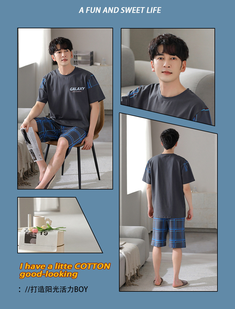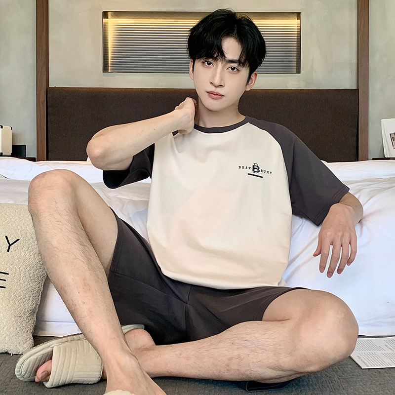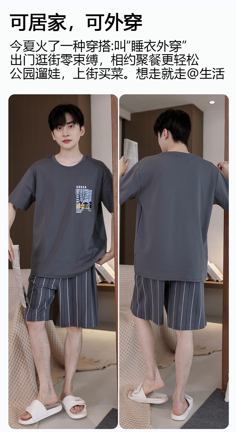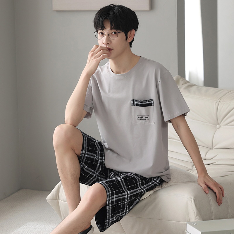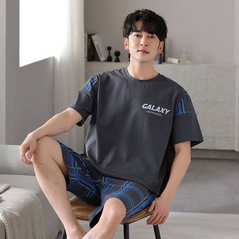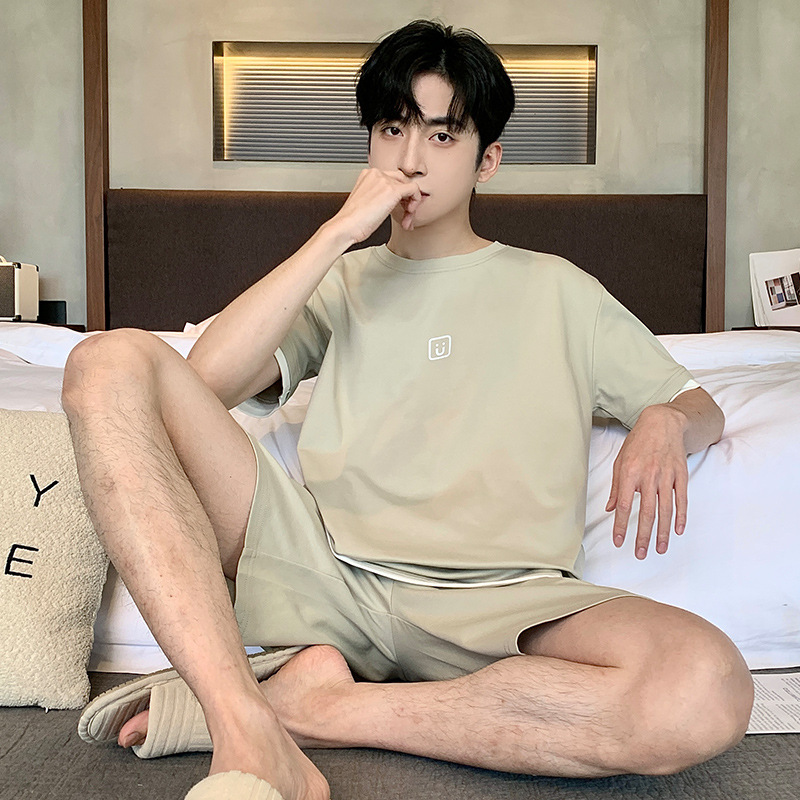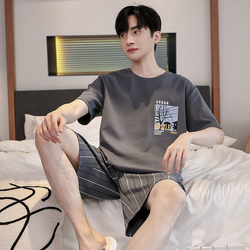 퓨어 코튼 파자마 남자 여름 반팔 반바지 얇은 청소년 캐주얼 스포츠 간단한 라운드 넥 홈웨어 외주스토어 가기
