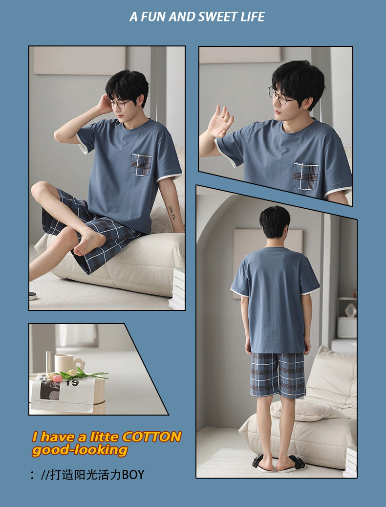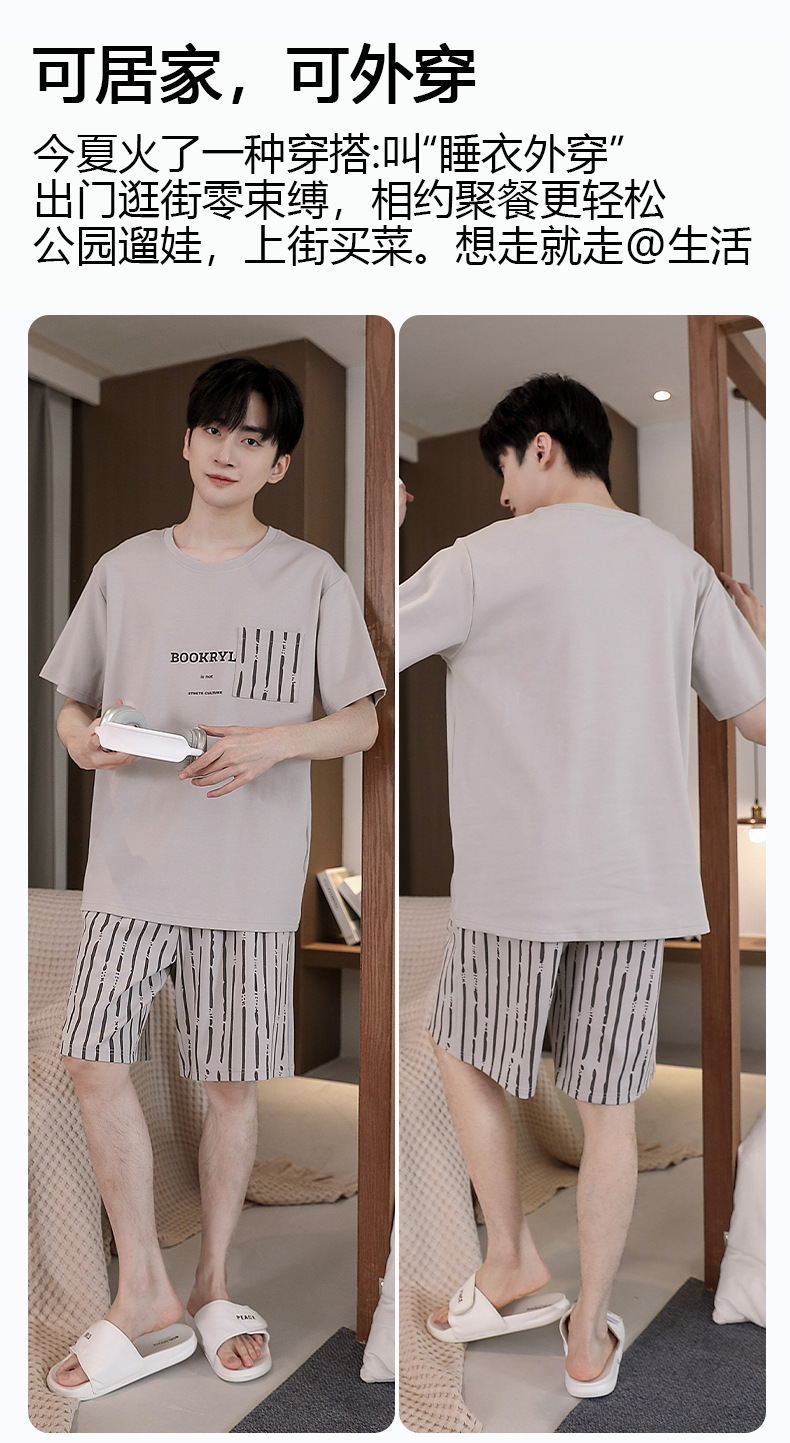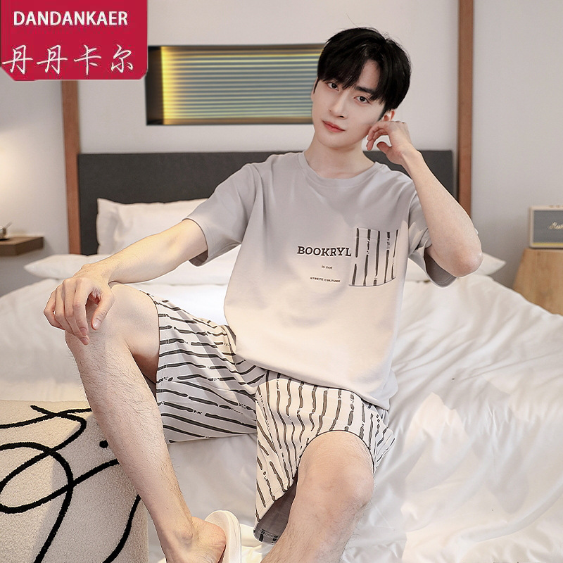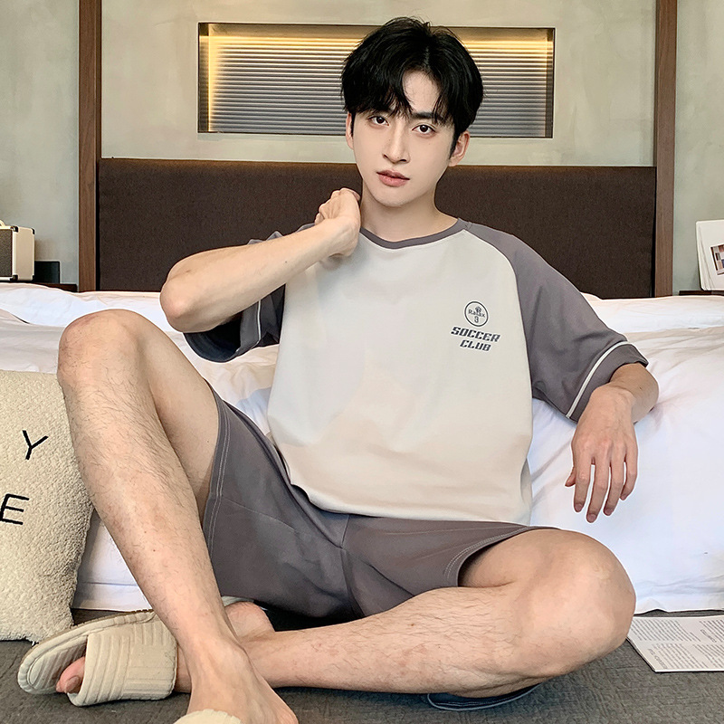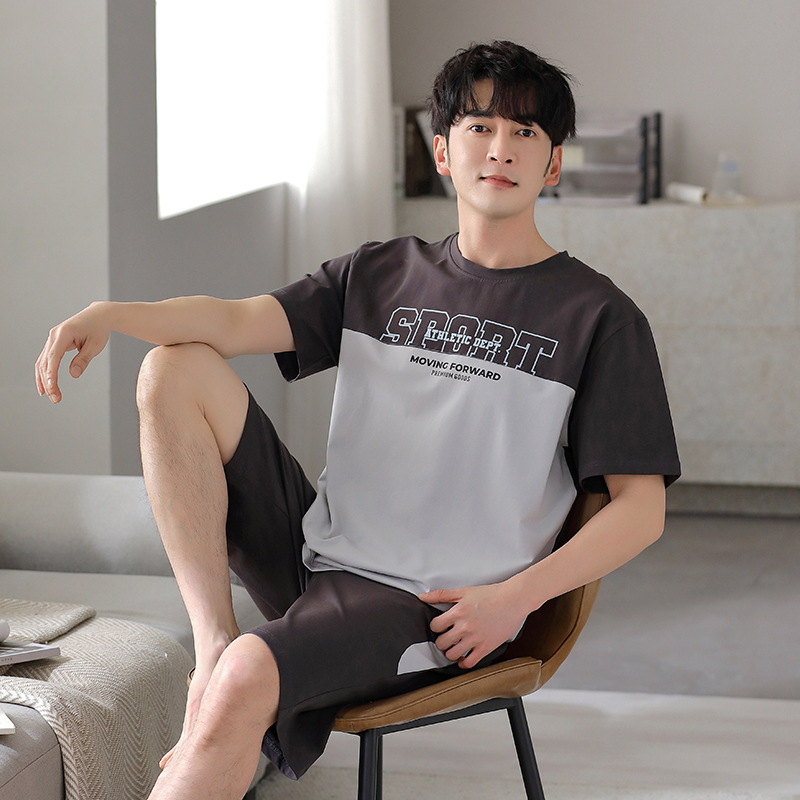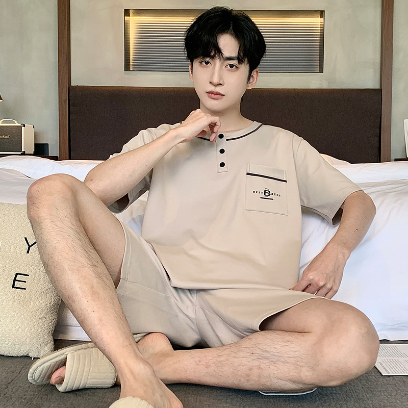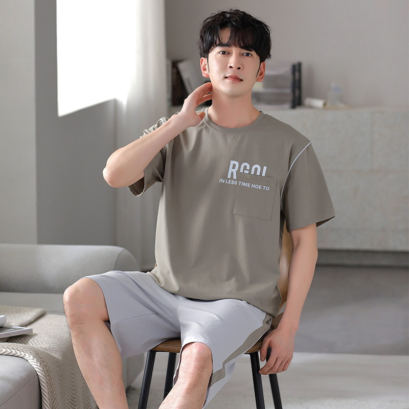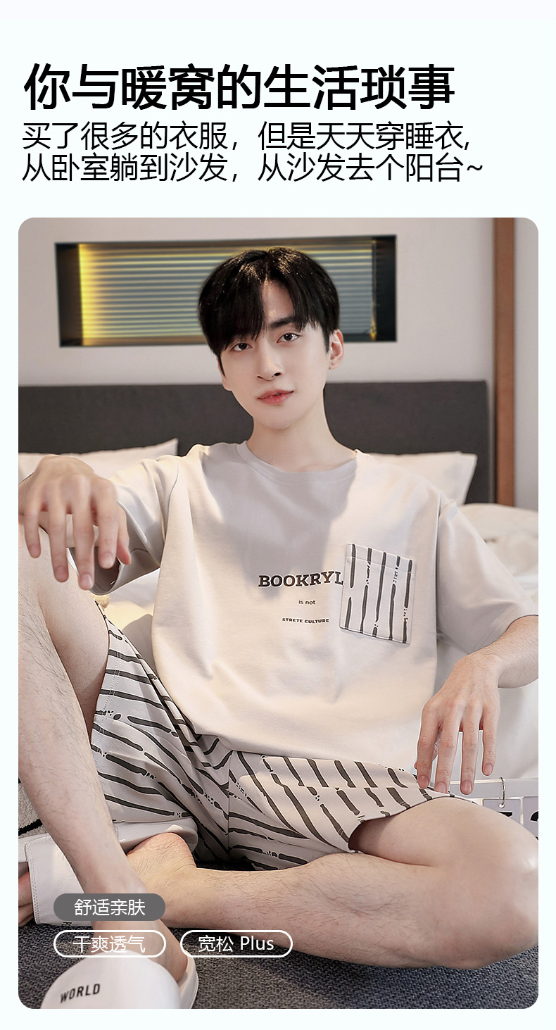 퓨어 코튼 파자마 남자 여름 반팔 반바지 얇은 청소년 캐주얼 스포츠 간단한 라운드 넥 홈웨어 외주스토어 가기