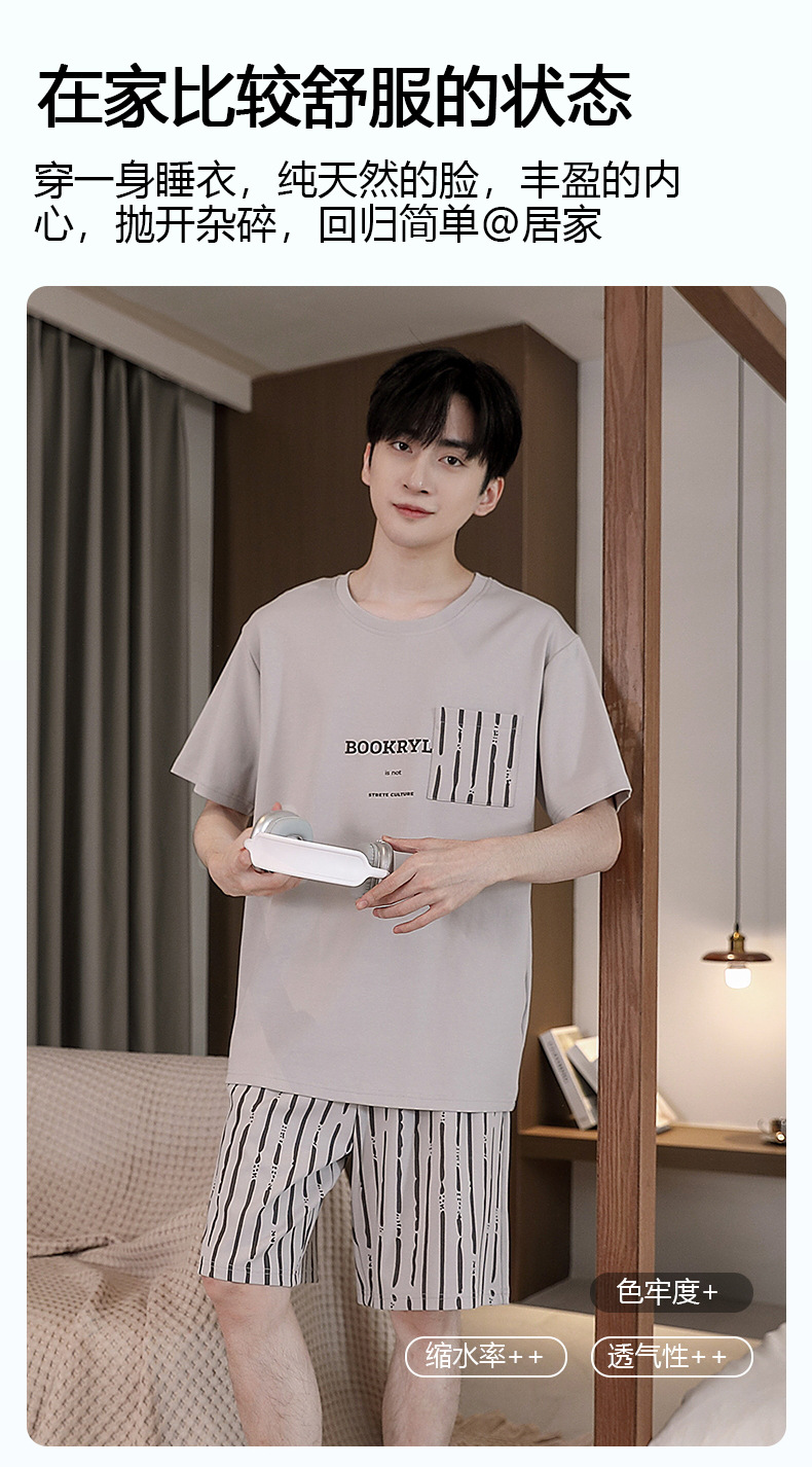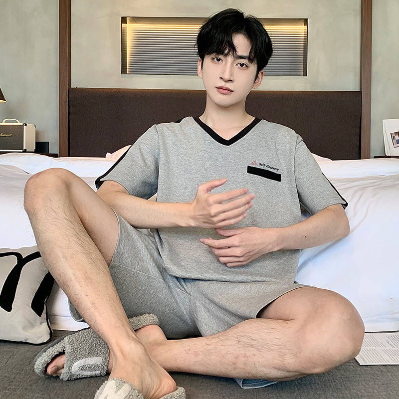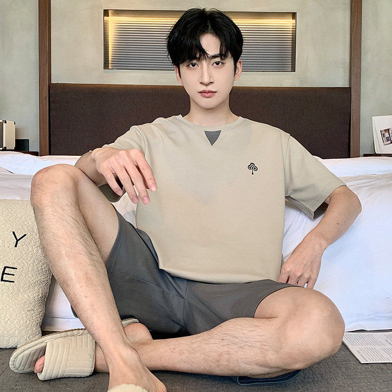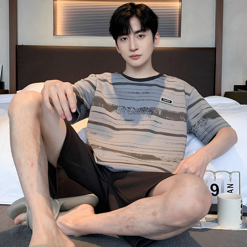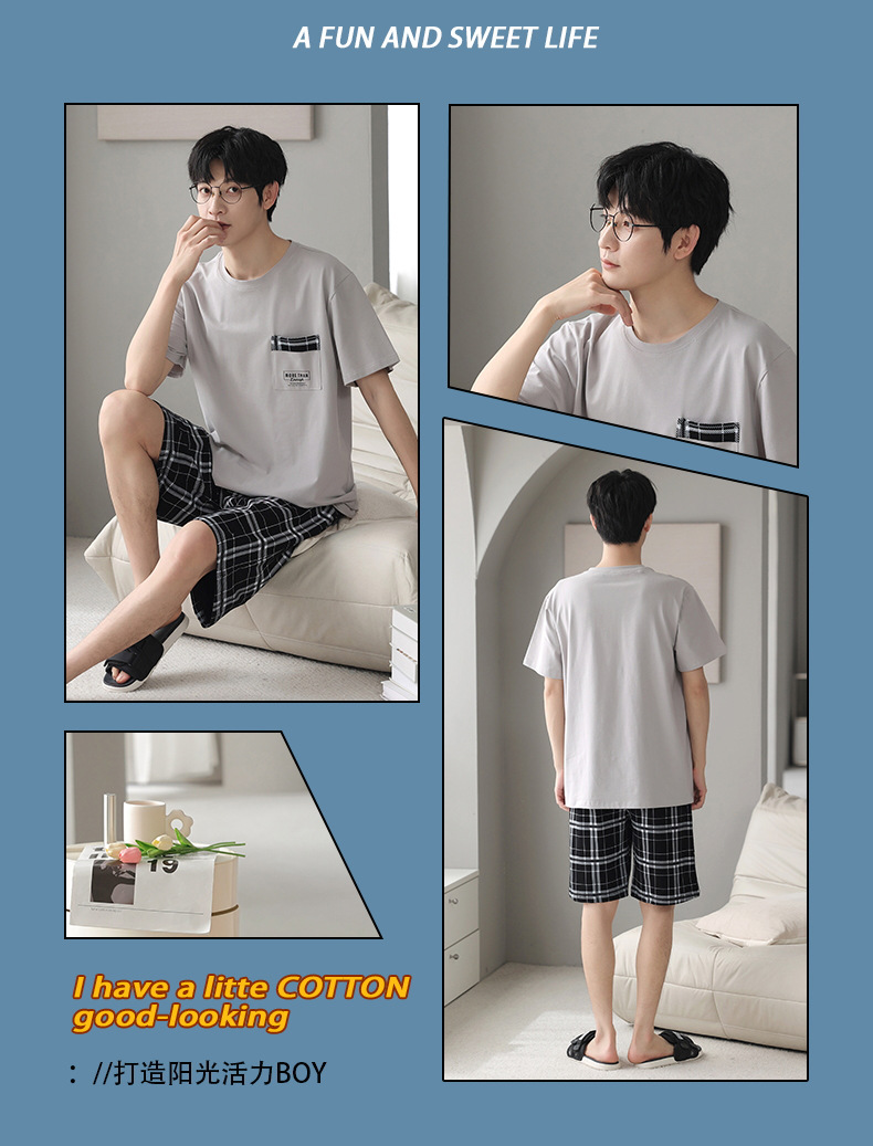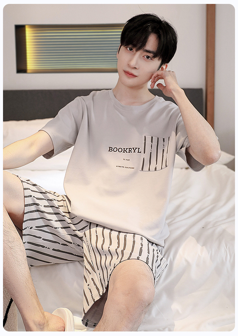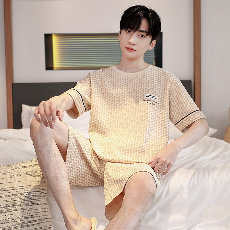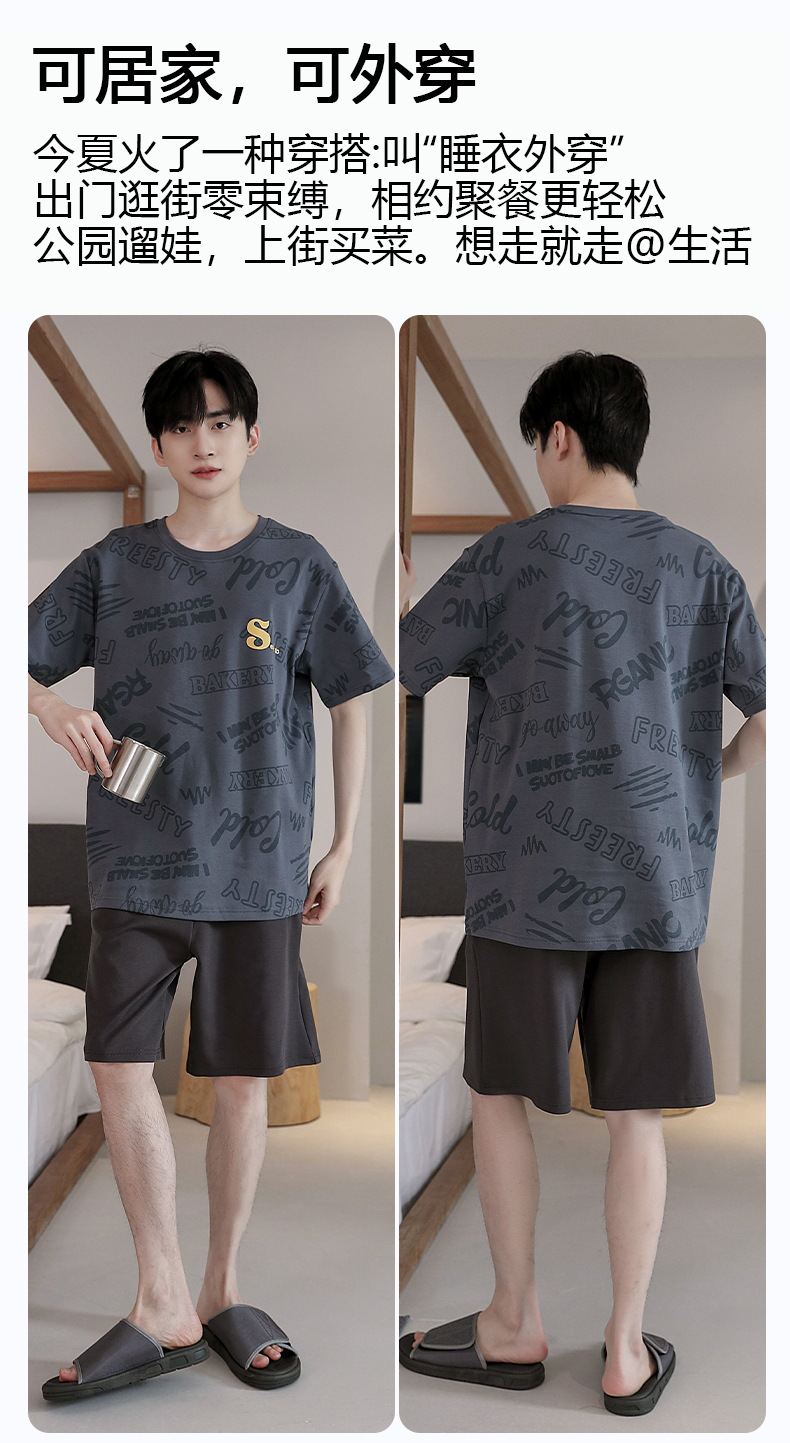 퓨어 코튼 파자마 남자 여름 반팔 반바지 얇은 청소년 캐주얼 스포츠 간단한 라운드 넥 홈웨어 외주스토어 가기