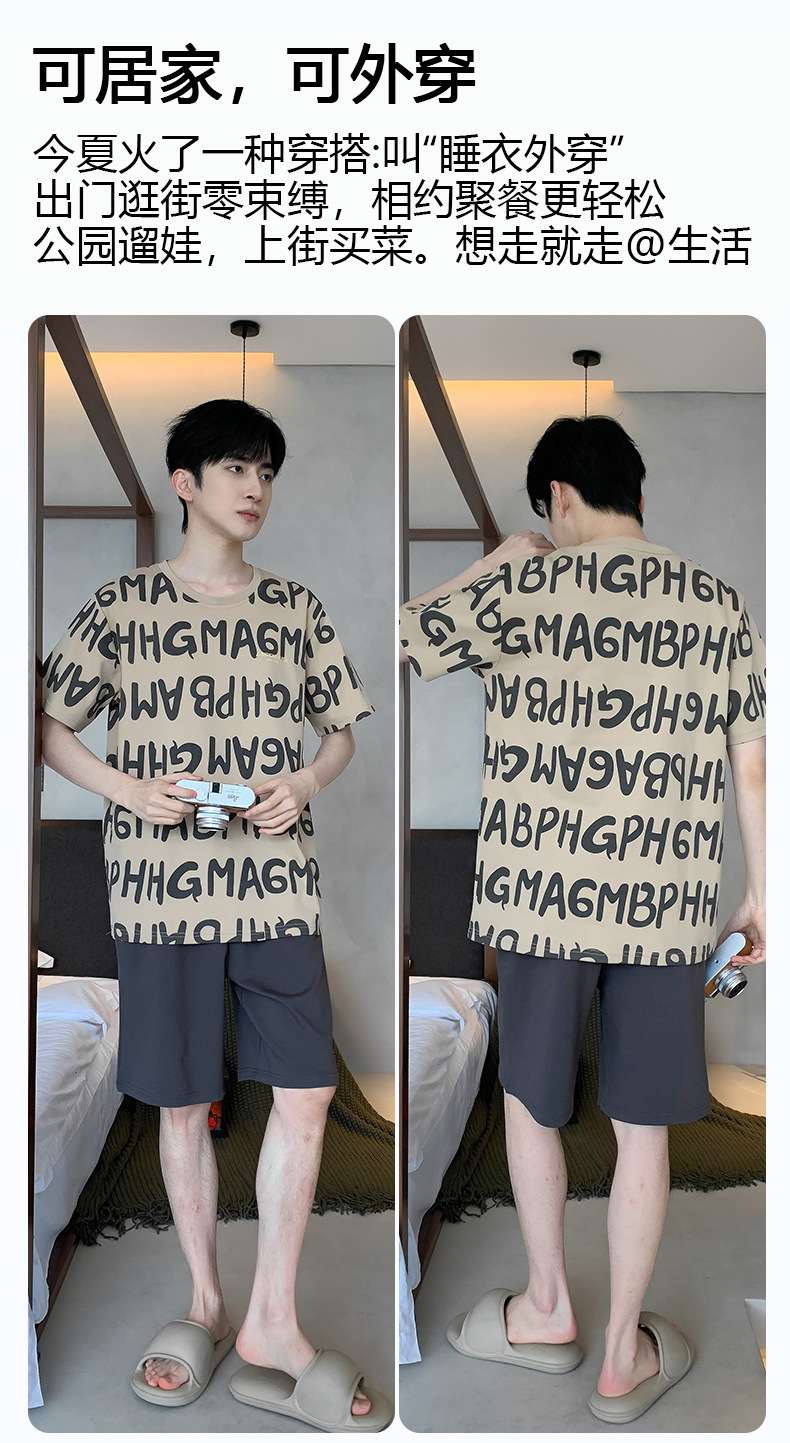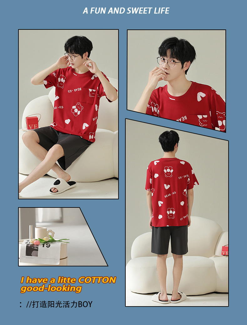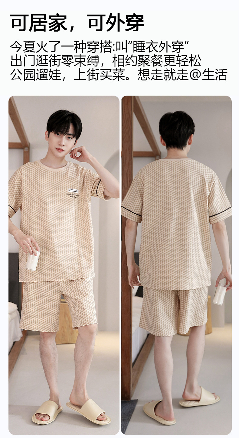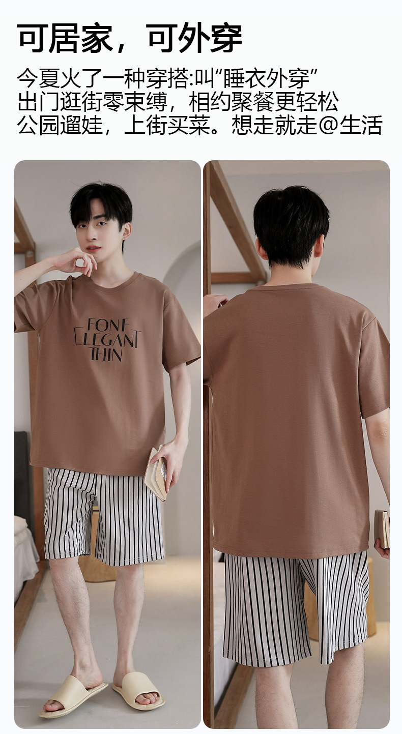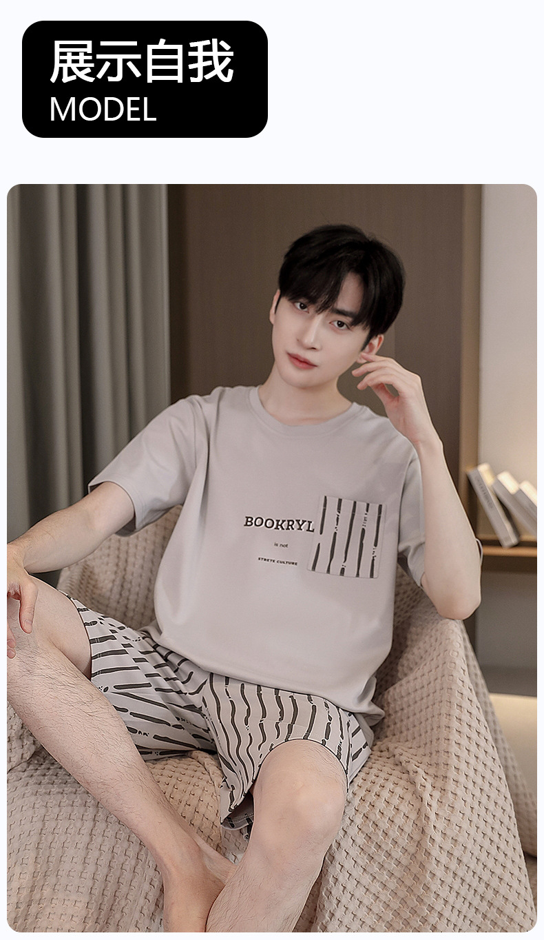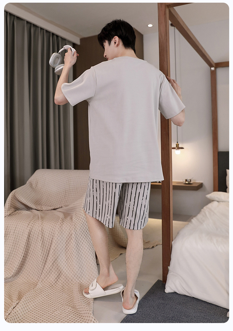 퓨어 코튼 파자마 남자 여름 반팔 반바지 얇은 청소년 캐주얼 스포츠 간단한 라운드 넥 홈웨어 외주스토어 가기