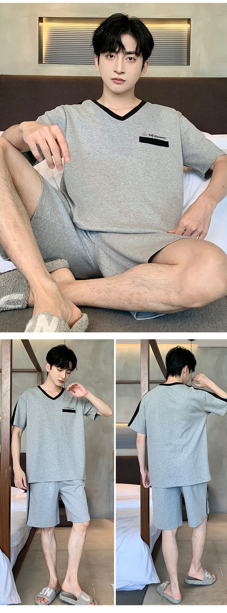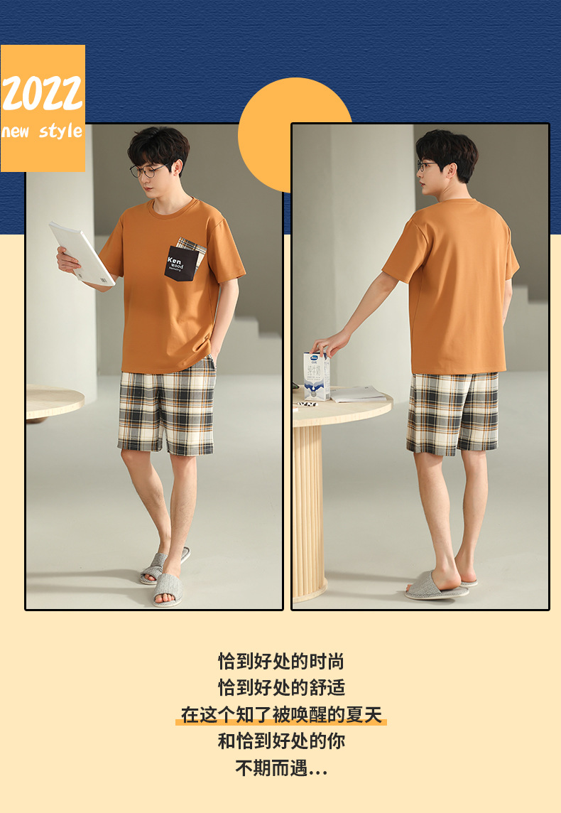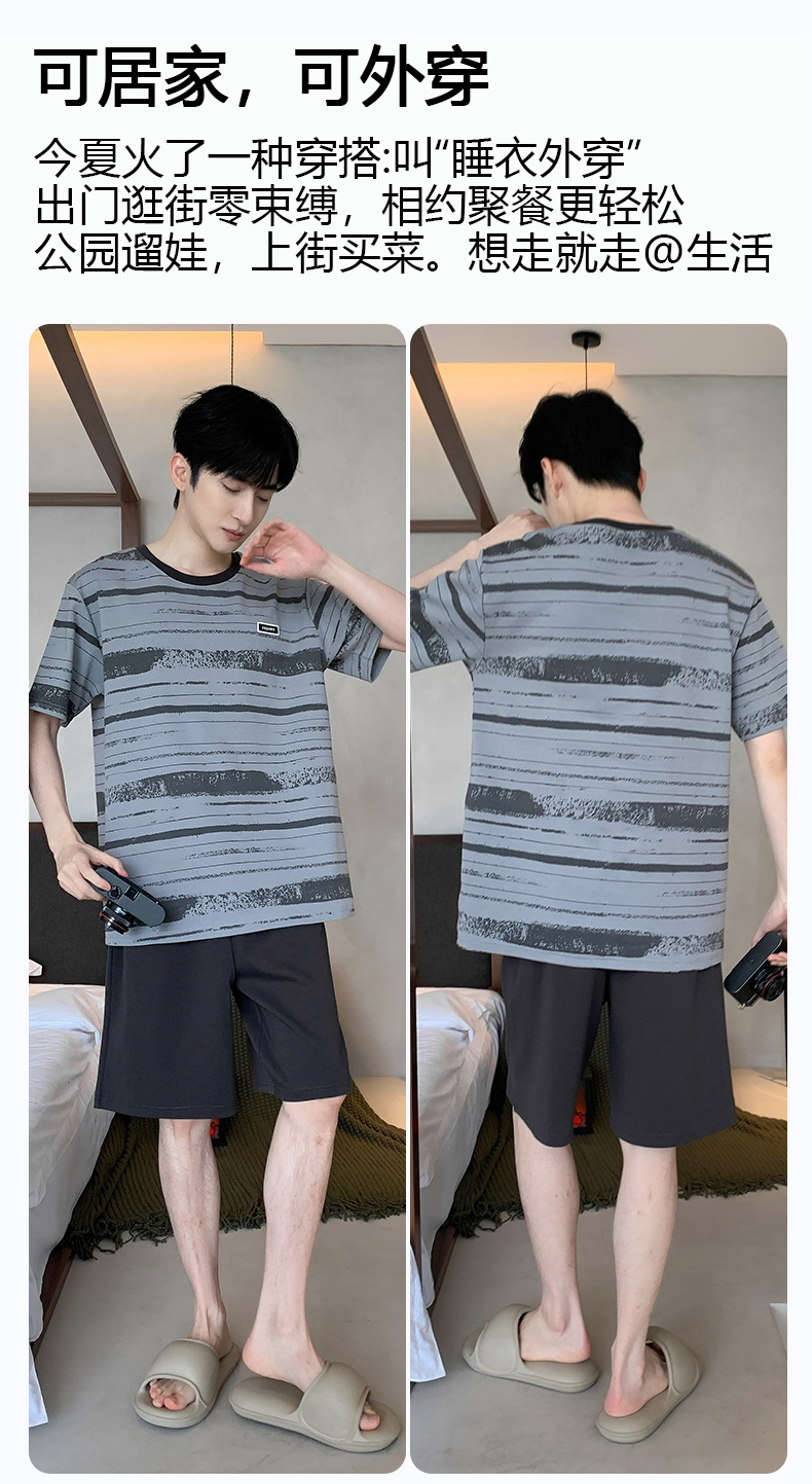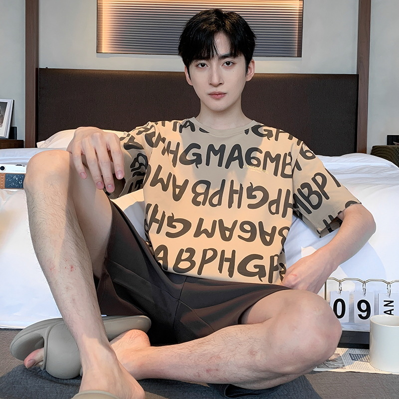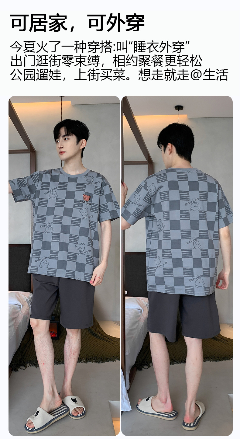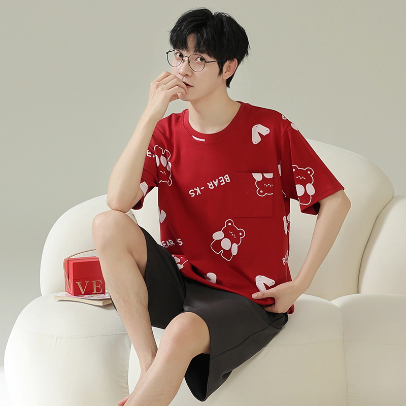 퓨어 코튼 파자마 남자 여름 반팔 반바지 얇은 청소년 캐주얼 스포츠 간단한 라운드 넥 홈웨어 외주스토어 가기