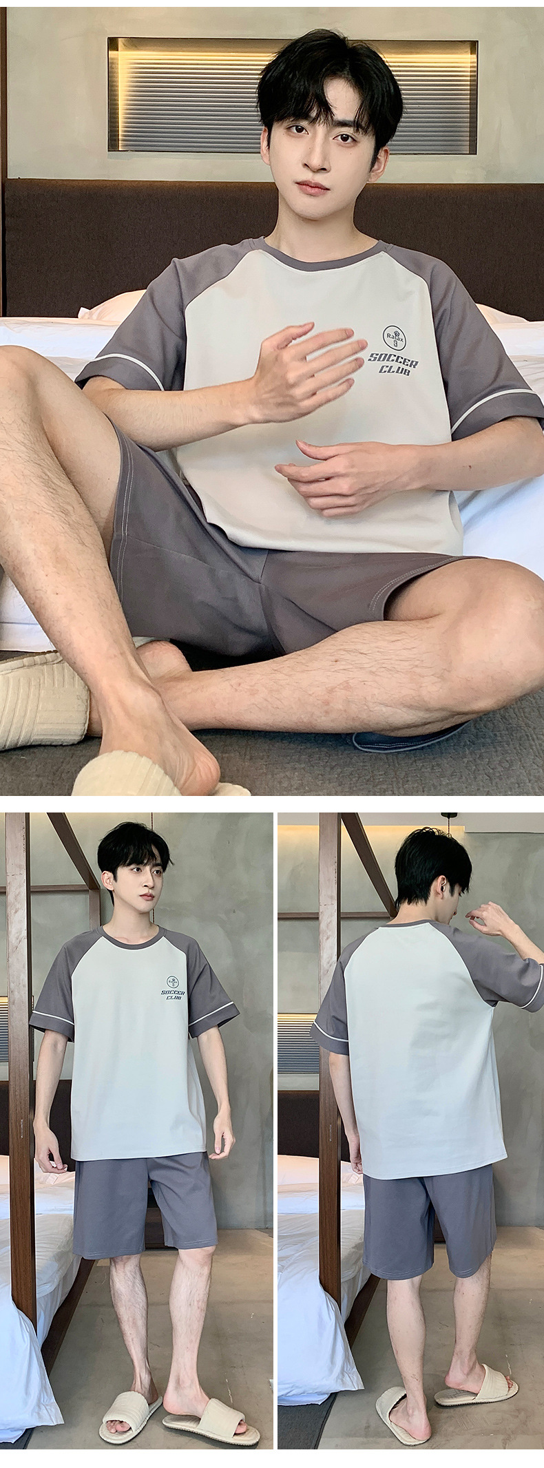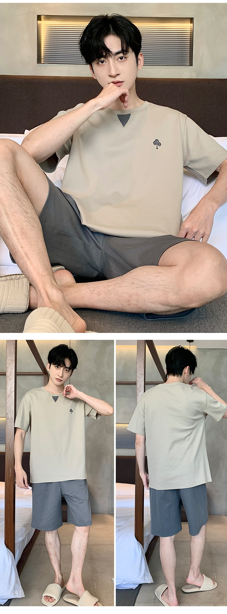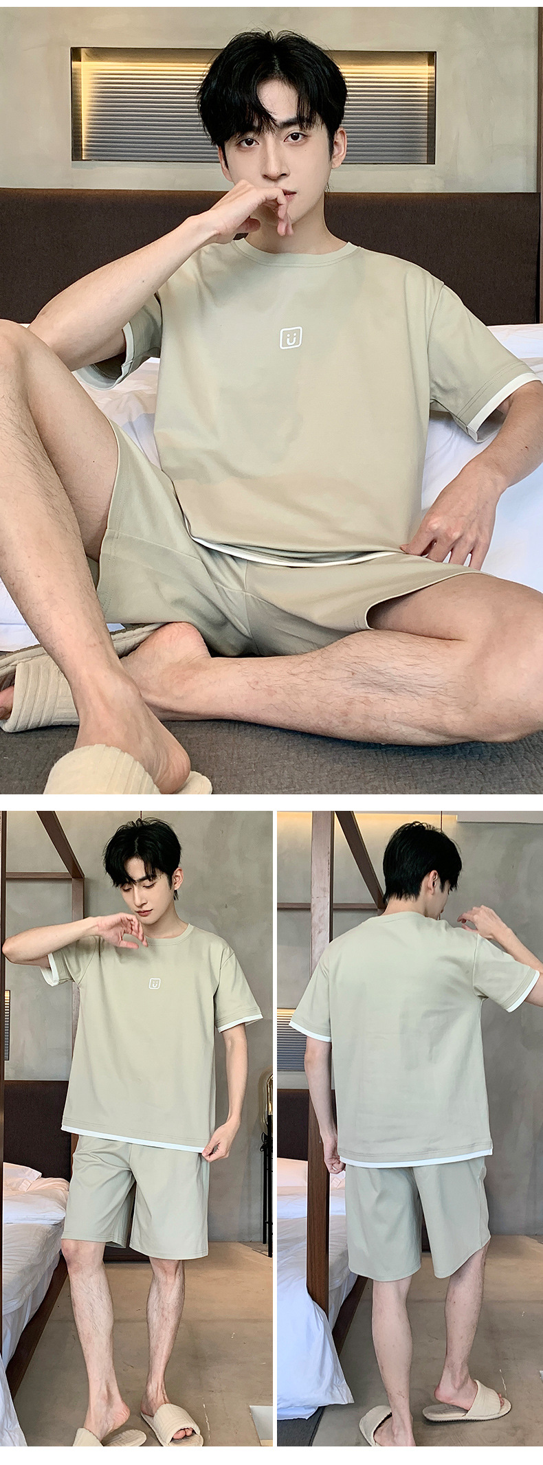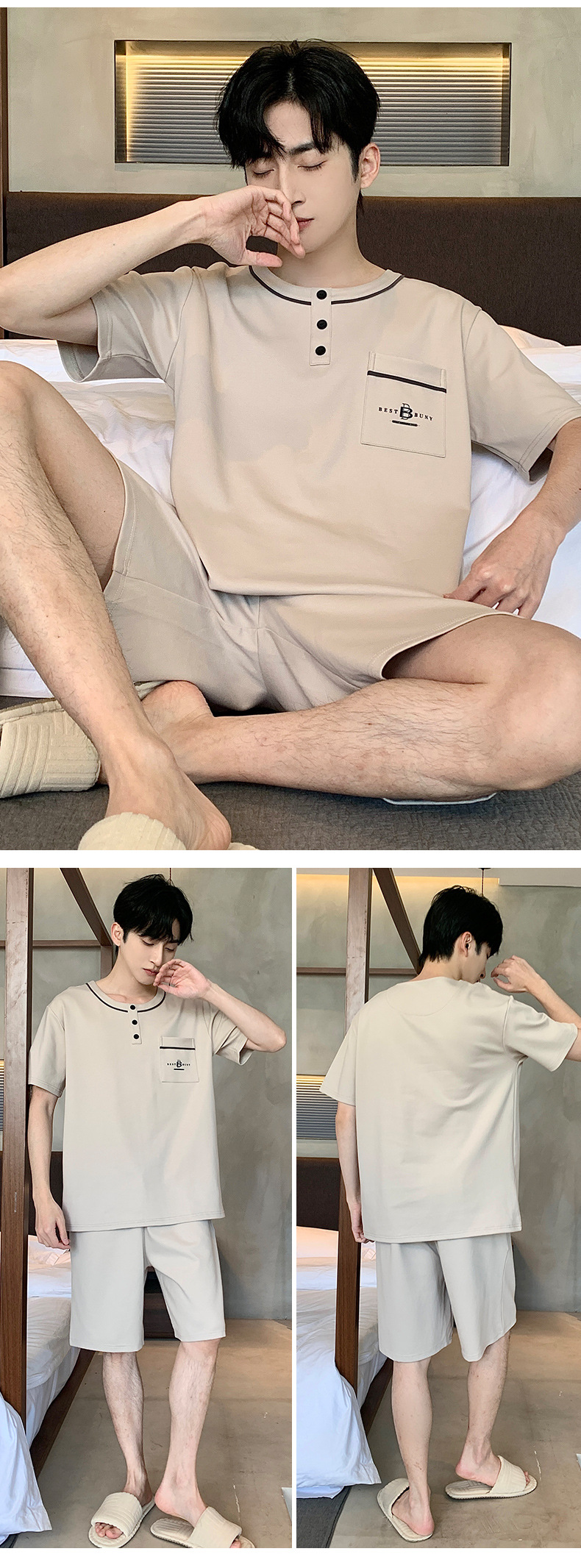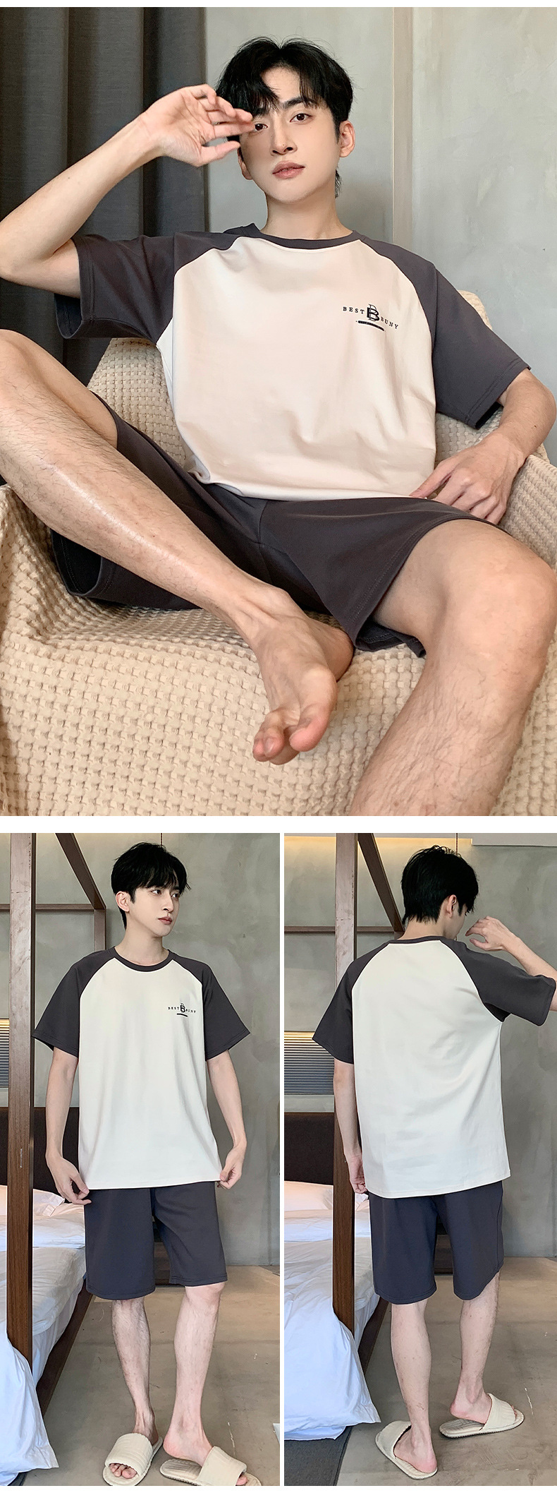 퓨어 코튼 파자마 남자 여름 반팔 반바지 얇은 청소년 캐주얼 스포츠 간단한 라운드 넥 홈웨어 외주스토어 가기