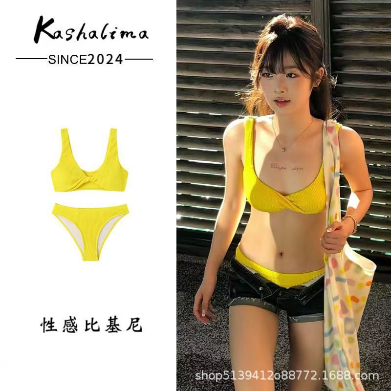 여성용 수영복 레몬 옐로우 화이트 스플릿 트라이앵글 비키니 순수한 욕망 섹시한 작은 가슴 뜨거운 소녀 가슴 패드가있는 온천 휴가스토어 가기