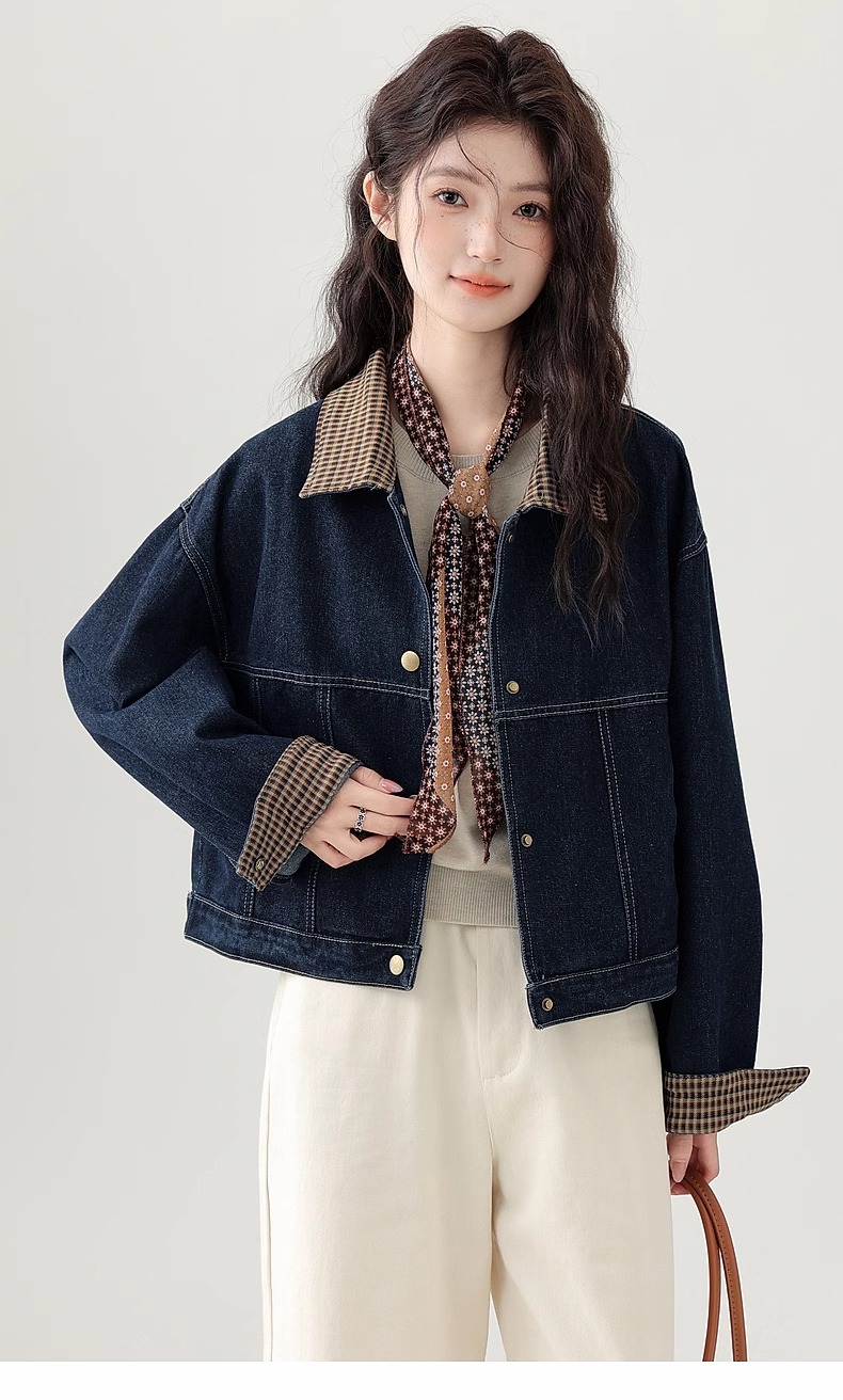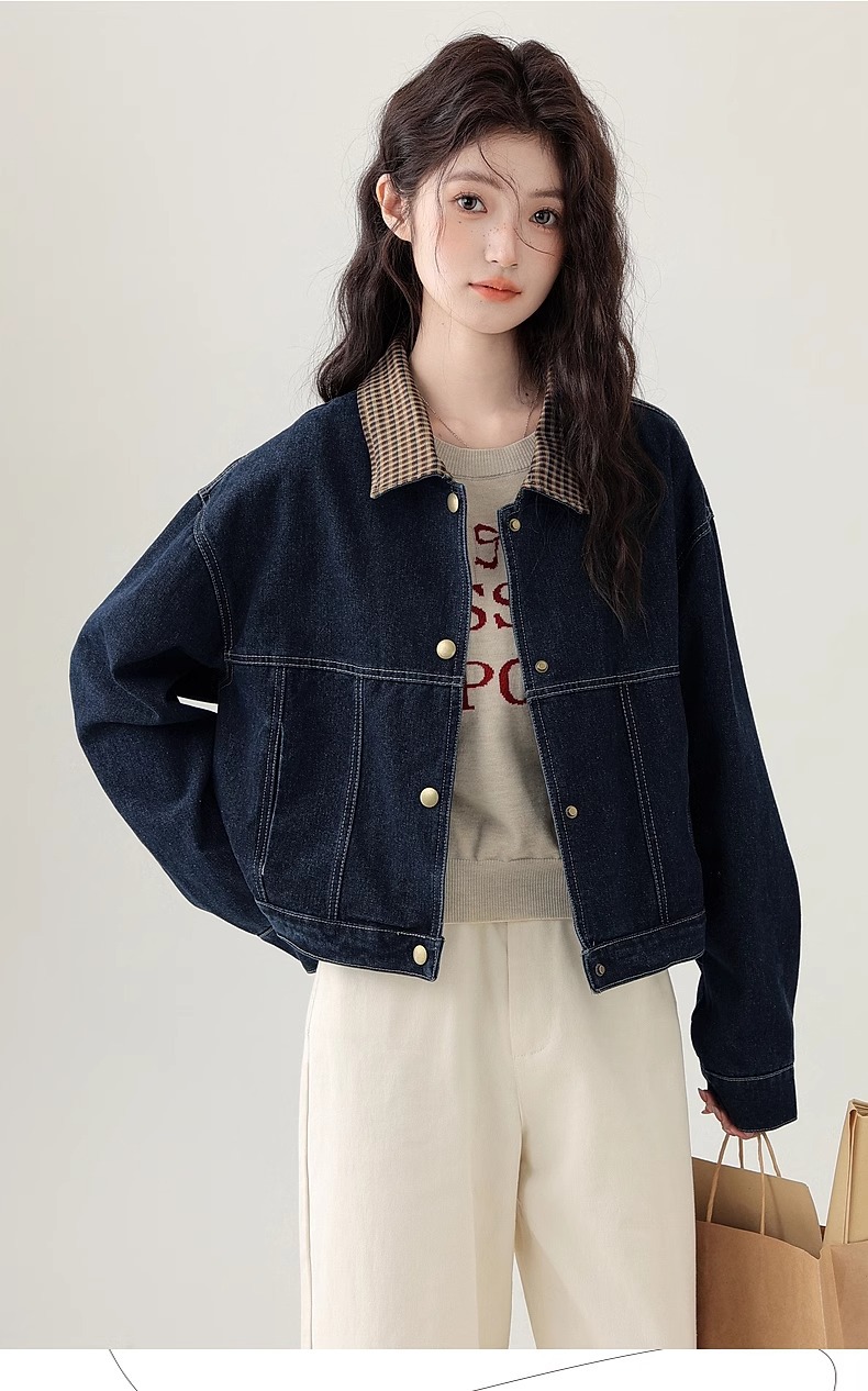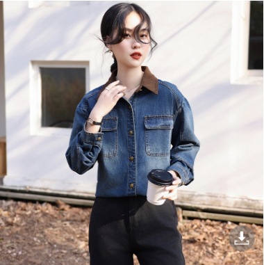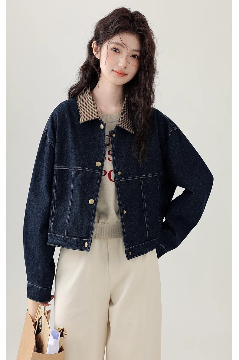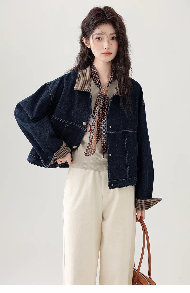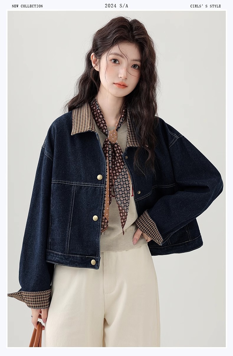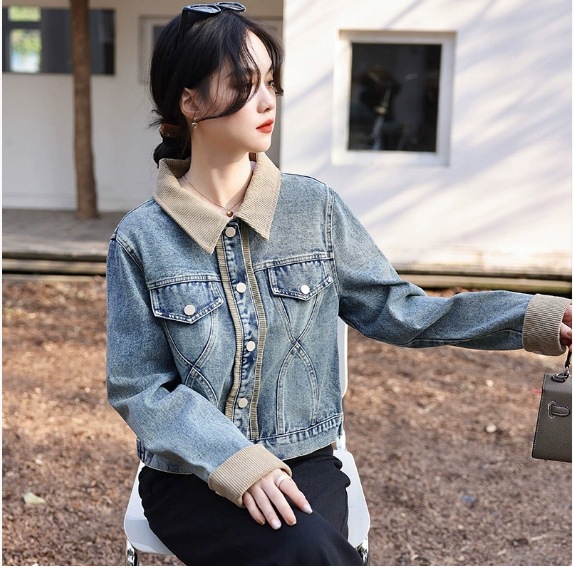 봄 2025 새로운 홍콩 스타일 옷깃 무늬 데님 짧은 코트 여성용 작은 재킷 탑스토어 가기
