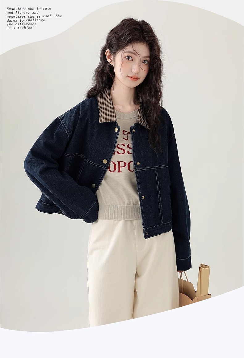 봄 2025 새로운 홍콩 스타일 옷깃 무늬 데님 짧은 코트 여성용 작은 재킷 탑
