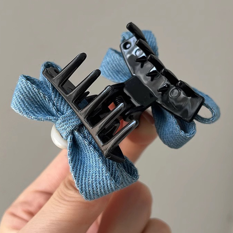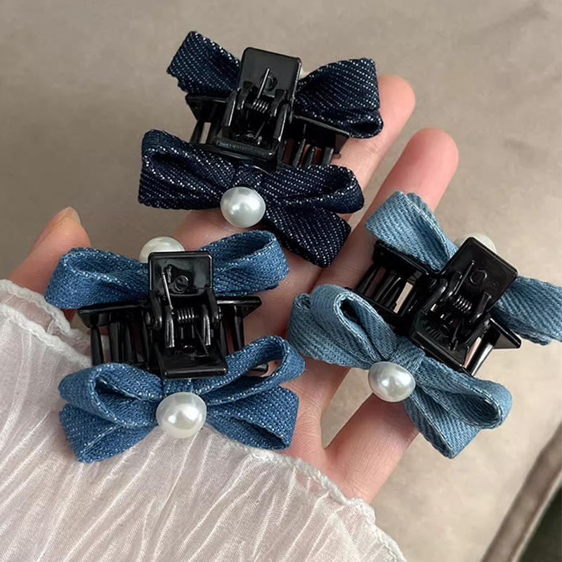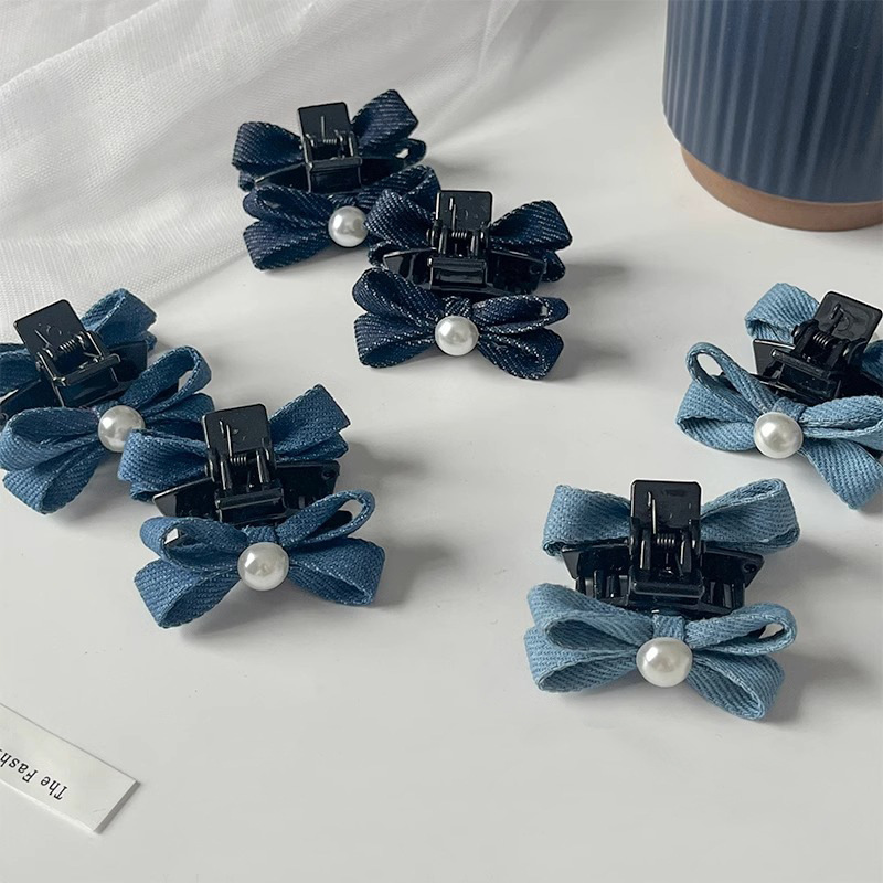 패션 데님 컬러 진주 작은 잡아 클립 소녀의 앞면 클립 헤드웨어 머리핀 귀여운 활 머리핀스토어 가기