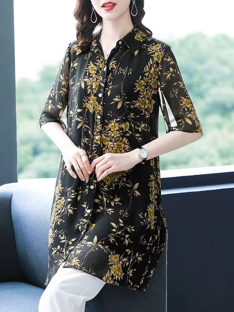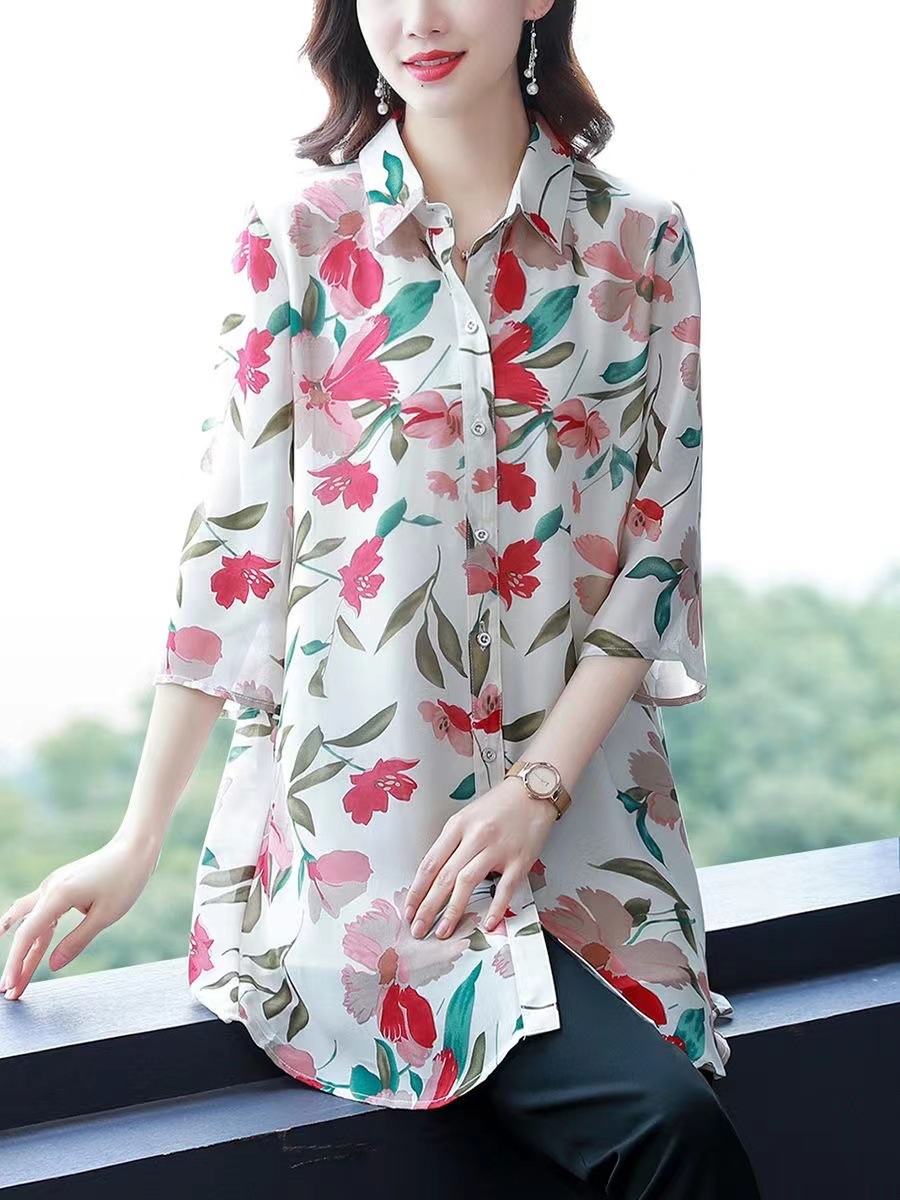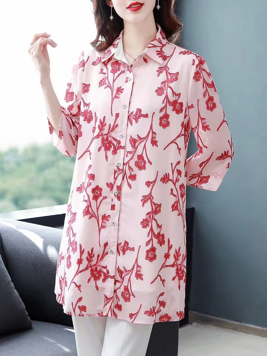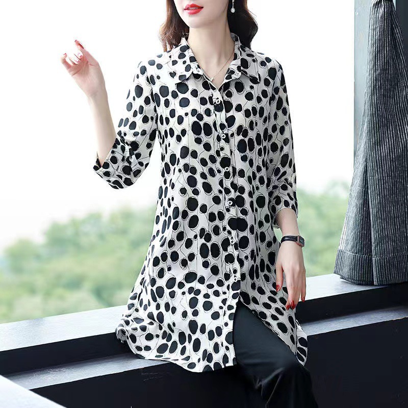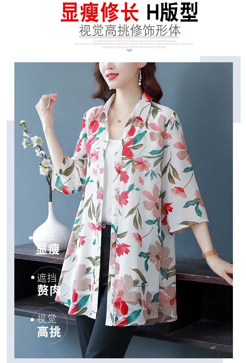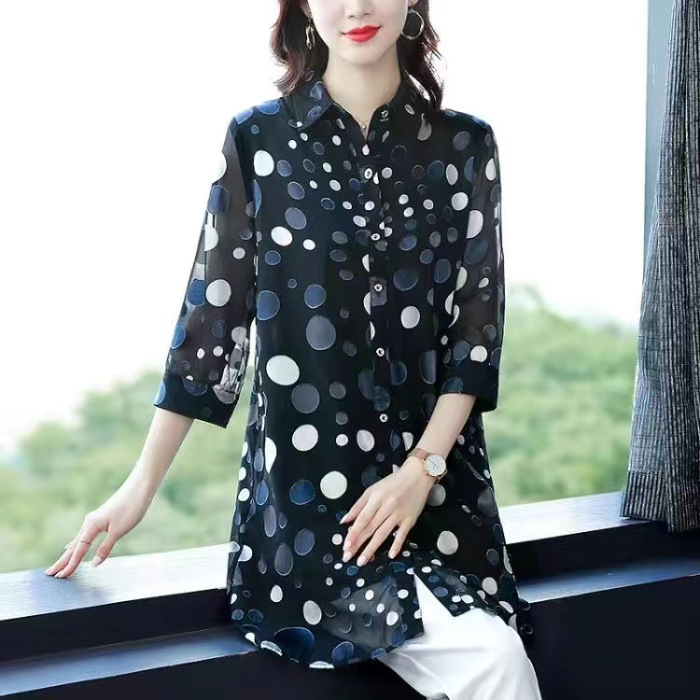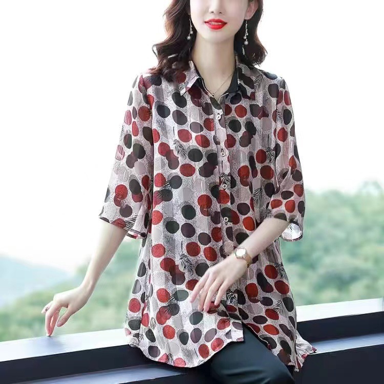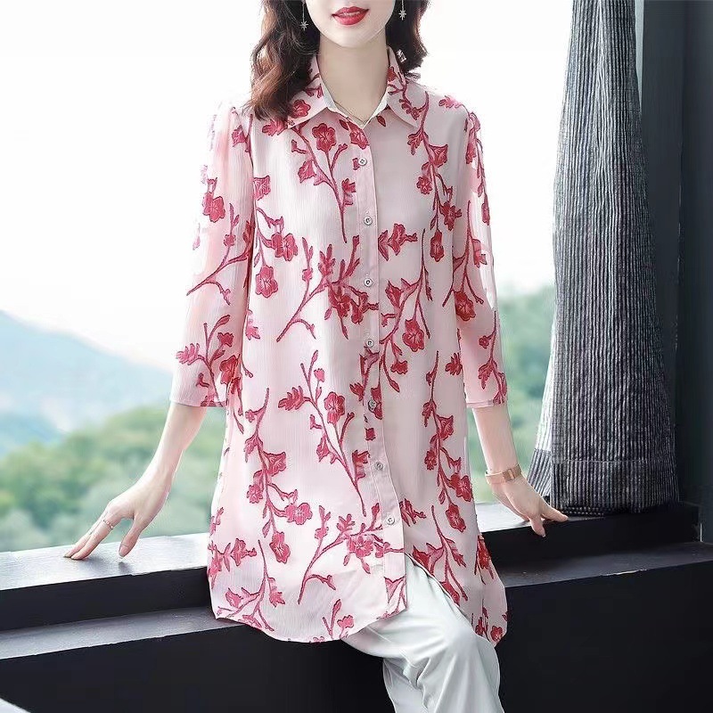 봄과 여름 새로운 쉬폰 셔츠 여성용 중간 길이 작은 셔츠 세븐 슬리브 탑 웨스턴 스타일 플러스 사이즈 어머니의 셔츠