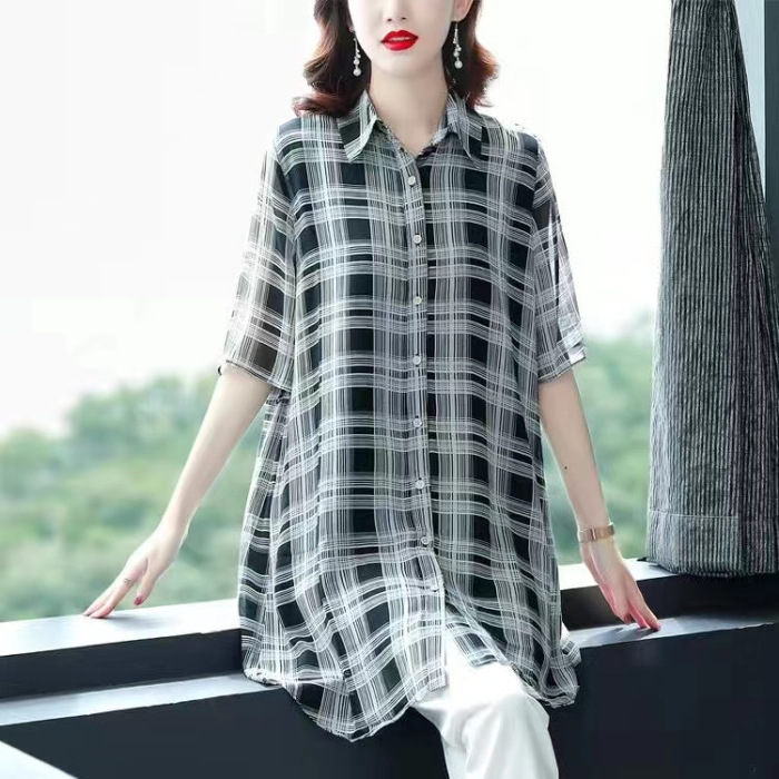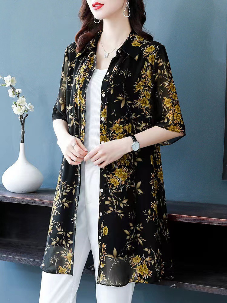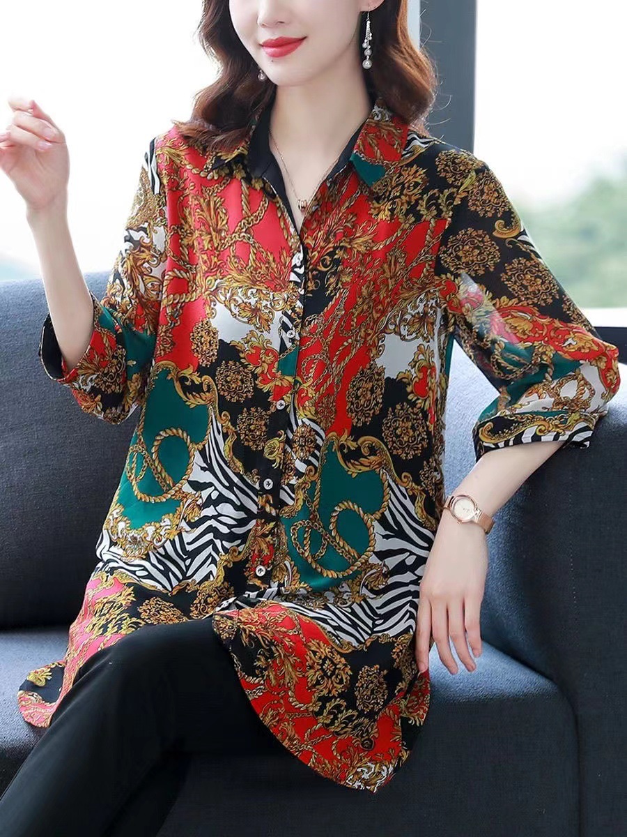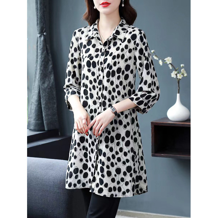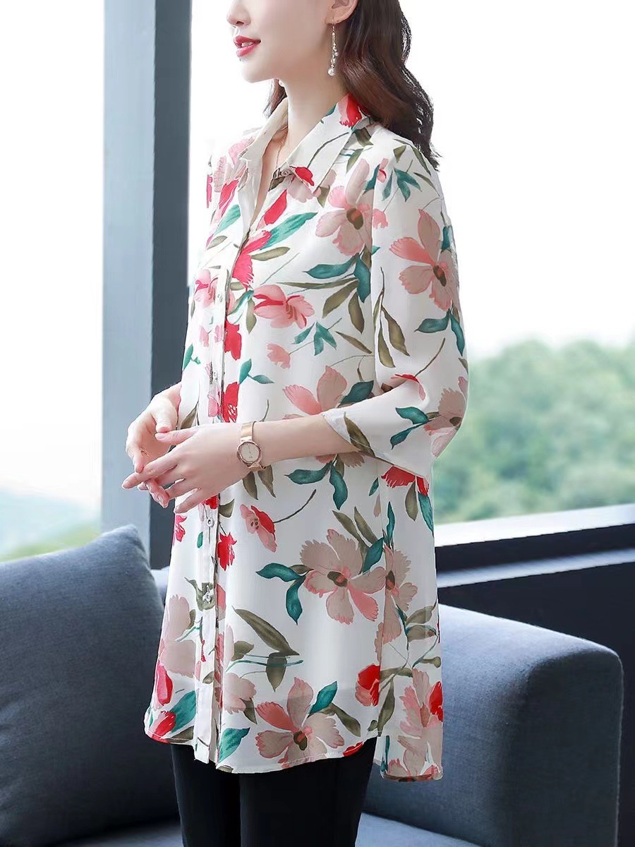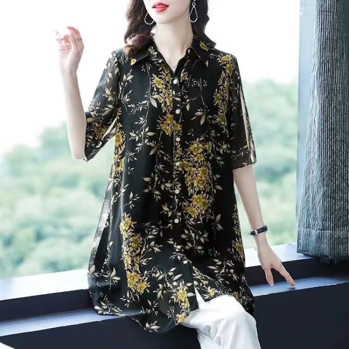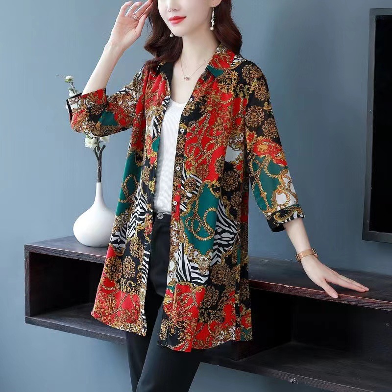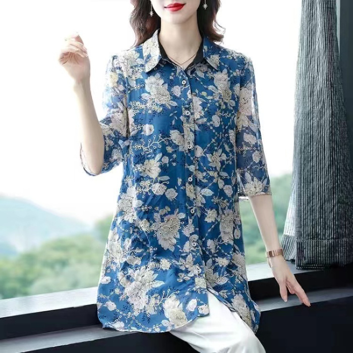 봄과 여름 새로운 쉬폰 셔츠 여성용 중간 길이 작은 셔츠 세븐 슬리브 탑 웨스턴 스타일 플러스 사이즈 어머니의 셔츠
