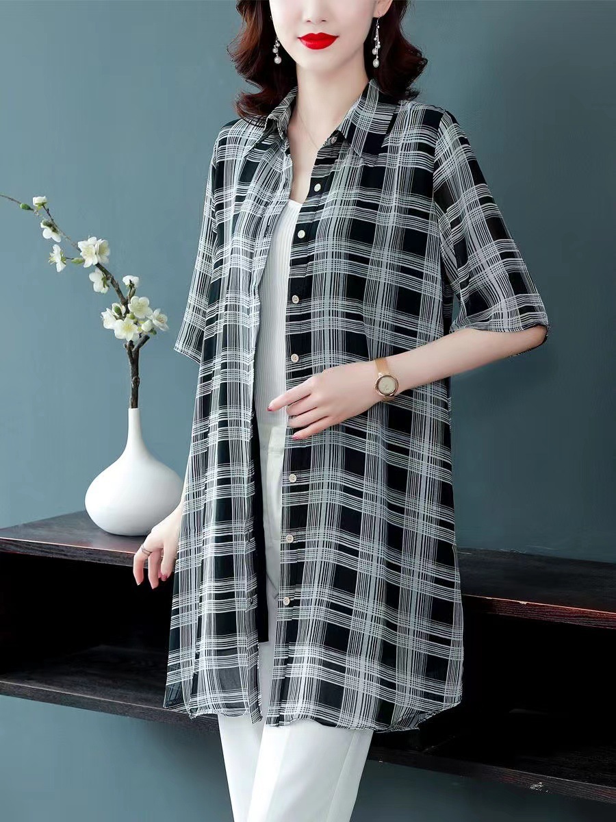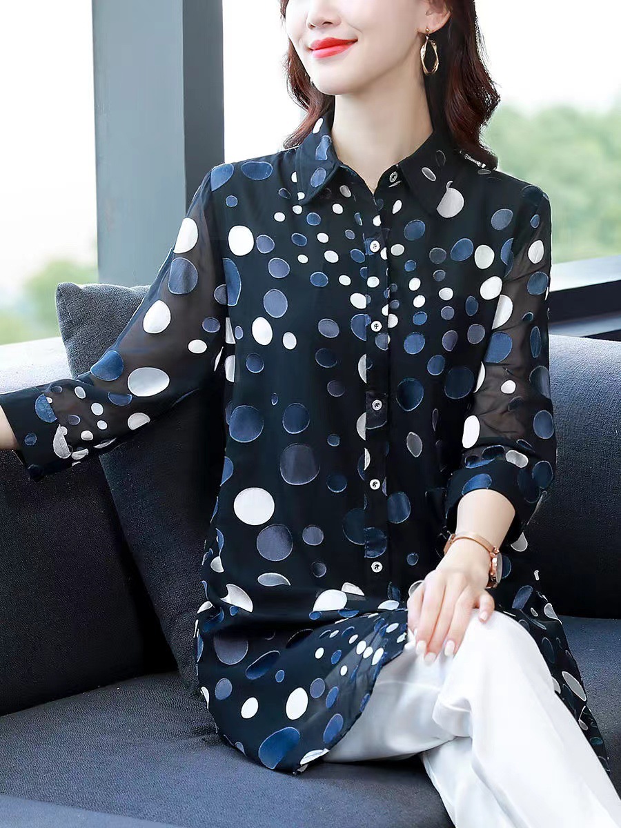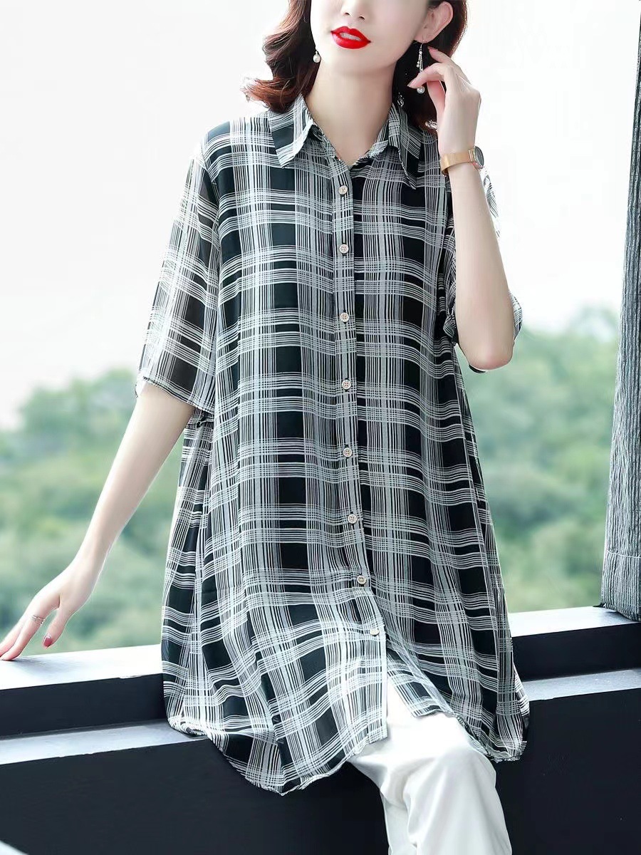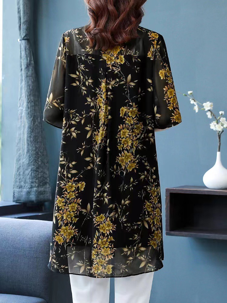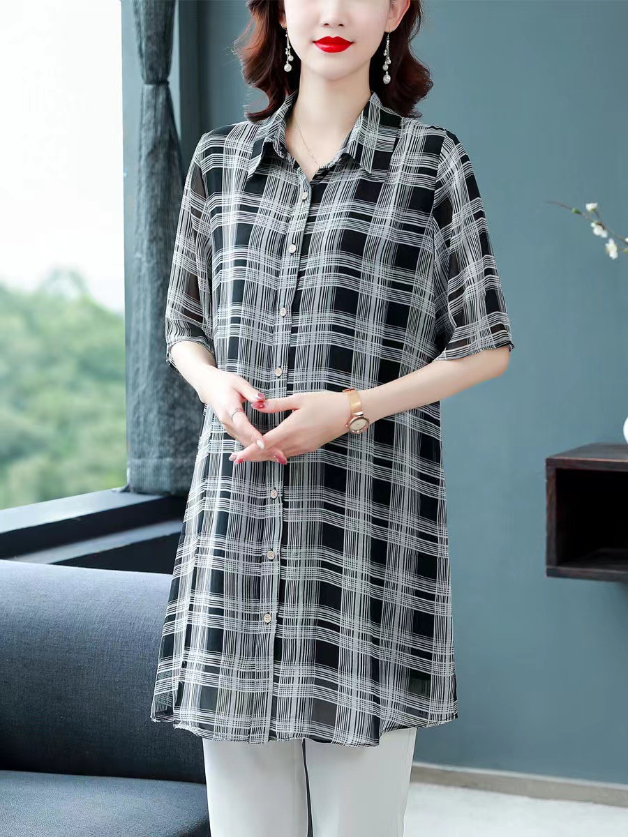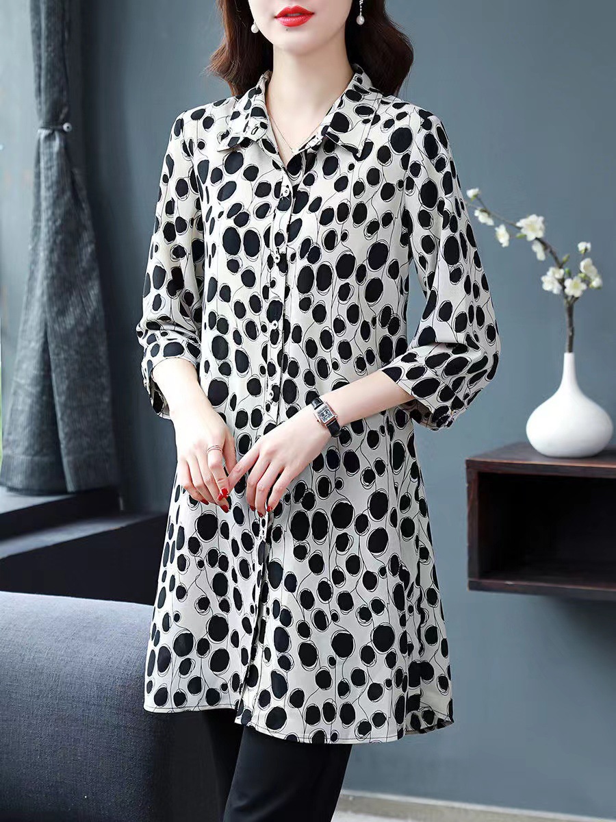 봄과 여름 새로운 쉬폰 셔츠 여성용 중간 길이 작은 셔츠 세븐 슬리브 탑 웨스턴 스타일 플러스 사이즈 어머니의 셔츠