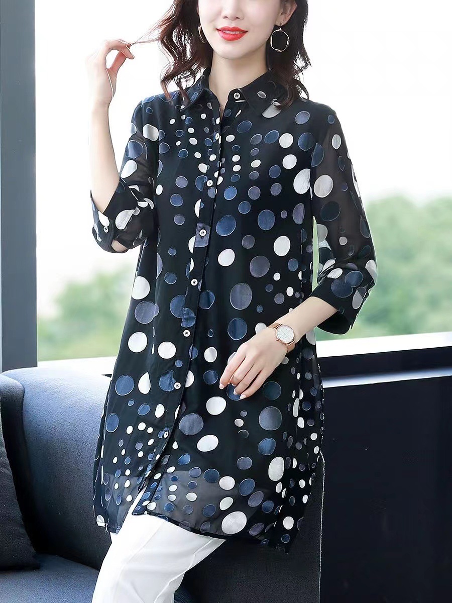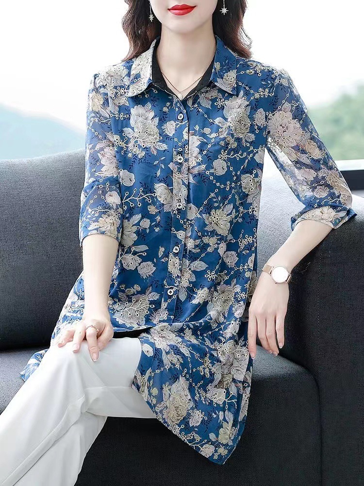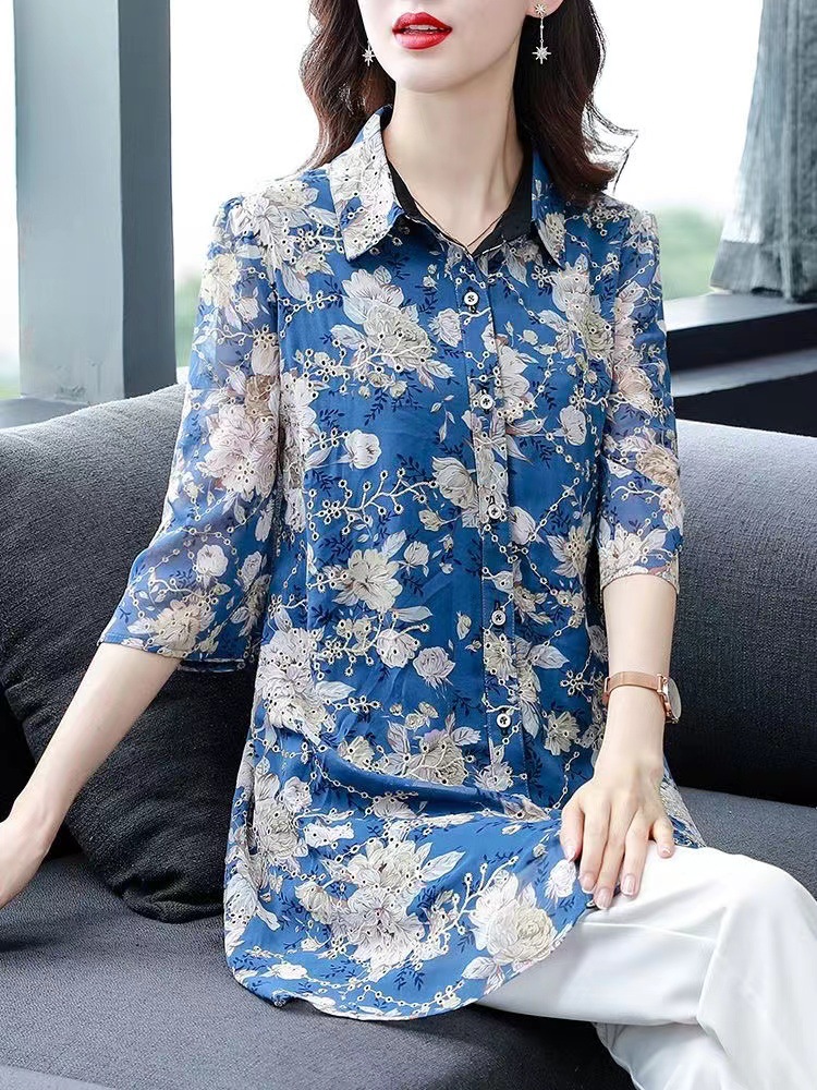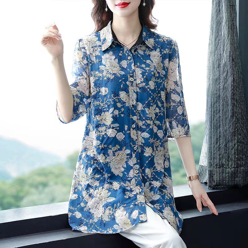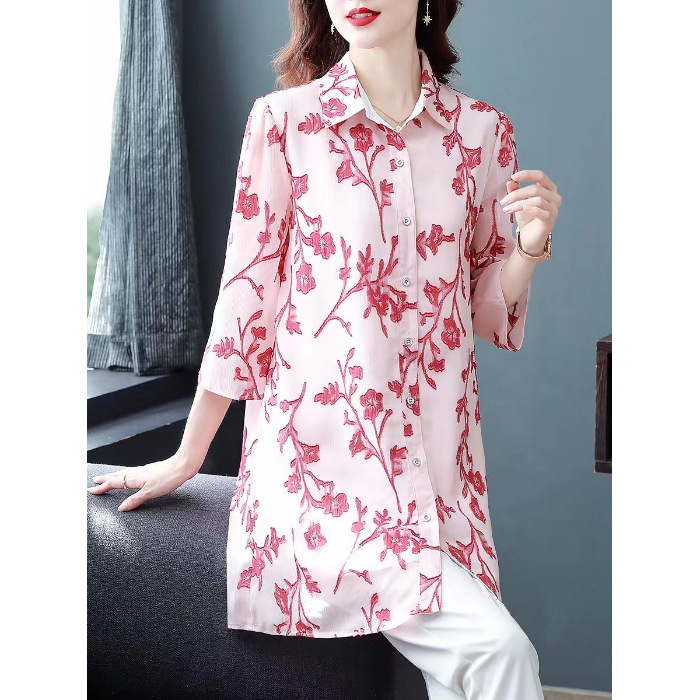 봄과 여름 새로운 쉬폰 셔츠 여성용 중간 길이 작은 셔츠 세븐 슬리브 탑 웨스턴 스타일 플러스 사이즈 어머니의 셔츠스토어 가기