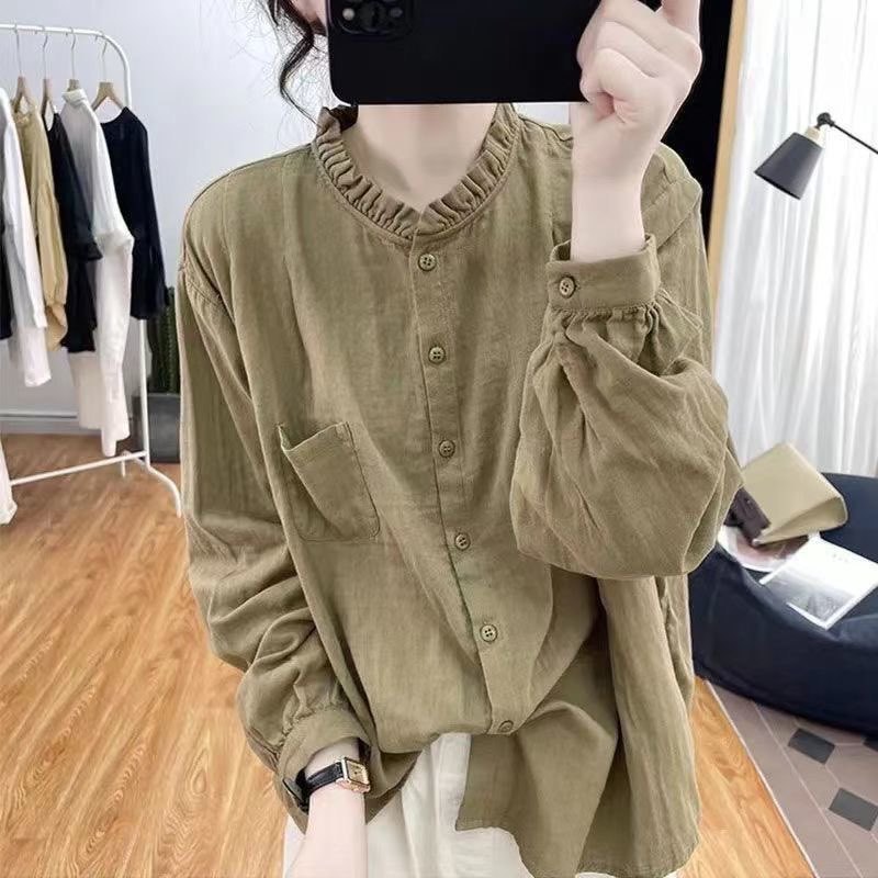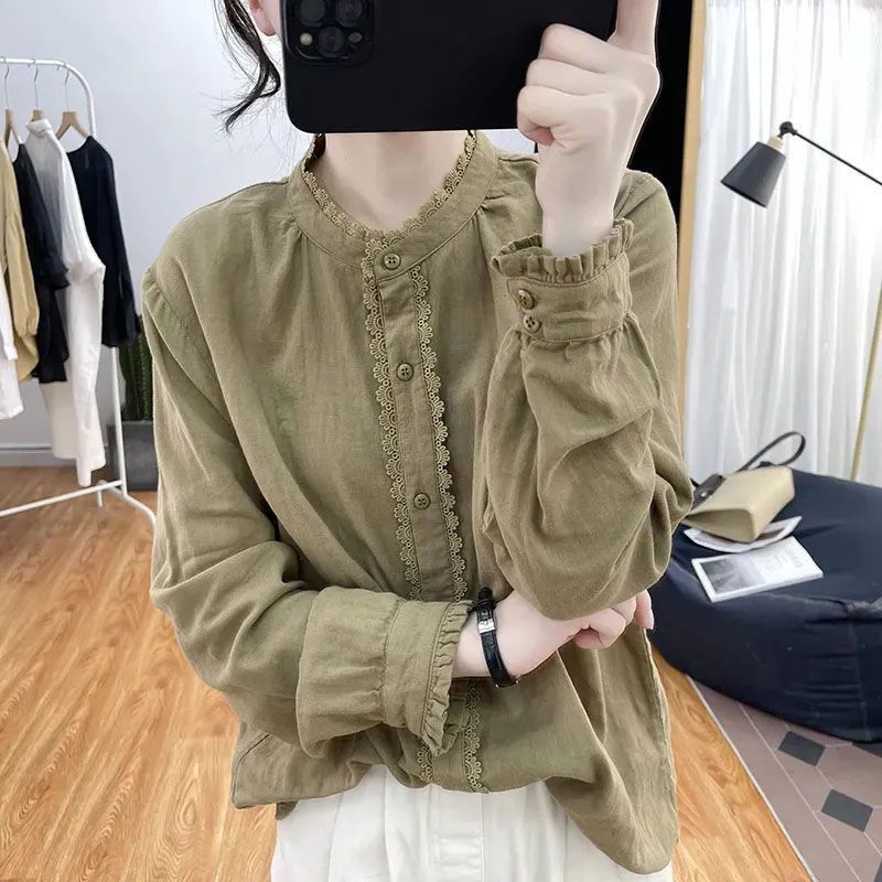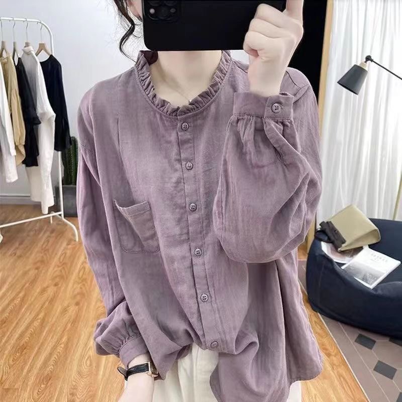 코튼 및 리넨 긴팔 셔츠 여성 최고 연령 감소 올 매치 레트로 칼라 스티칭 솔리드 컬러베이스 셔츠 루즈 재킷 봄