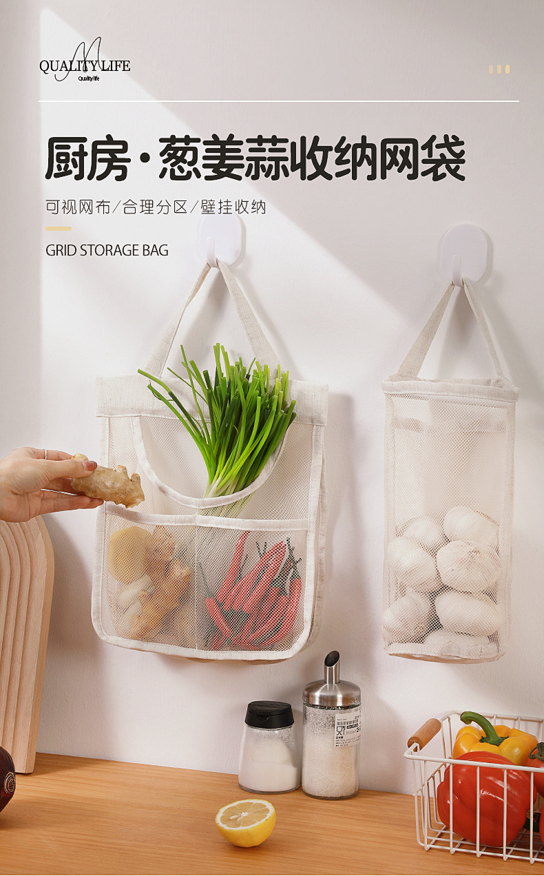 메쉬 통기성 생강 및 마늘 벽걸이 저장 가방 면화 및 리넨 두꺼운 메쉬 가방 대용량 주방 과일 및 야채 수분 방지 교수형 가방