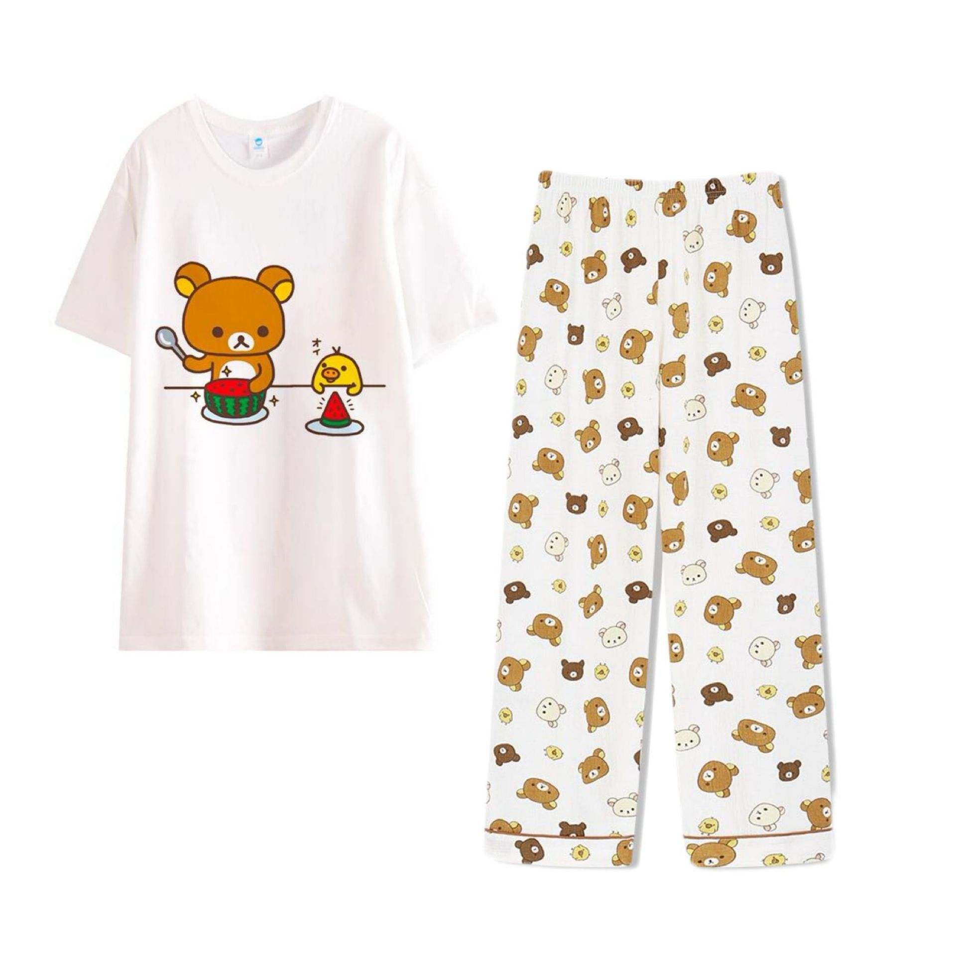 순면 rilakkuma 휴식 곰 잠옷 봄과 가을 여성 반팔 바지 귀여운 휴식 곰 홈 옷 여름