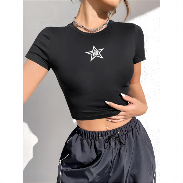 여름 크로스보더 y2k 스트리트 레터 슬림 섹시 블랙 뷰티 스타일 배꼽 노출 반팔 티셔츠 여성 티셔츠