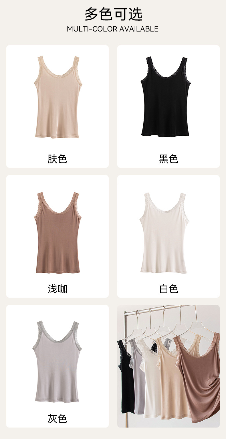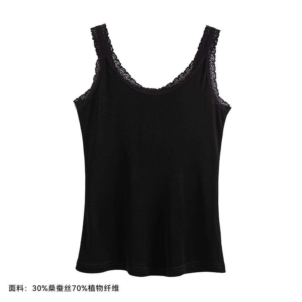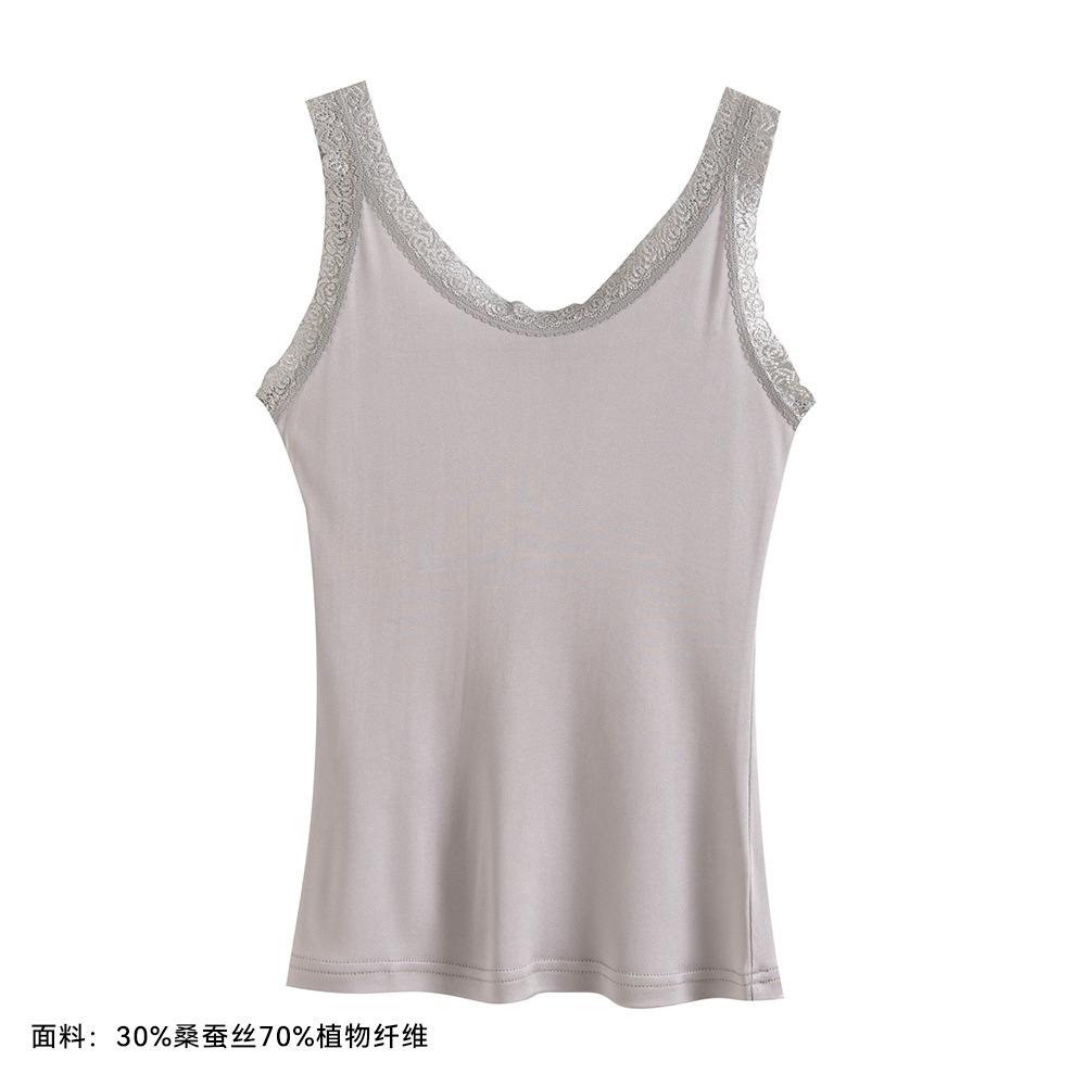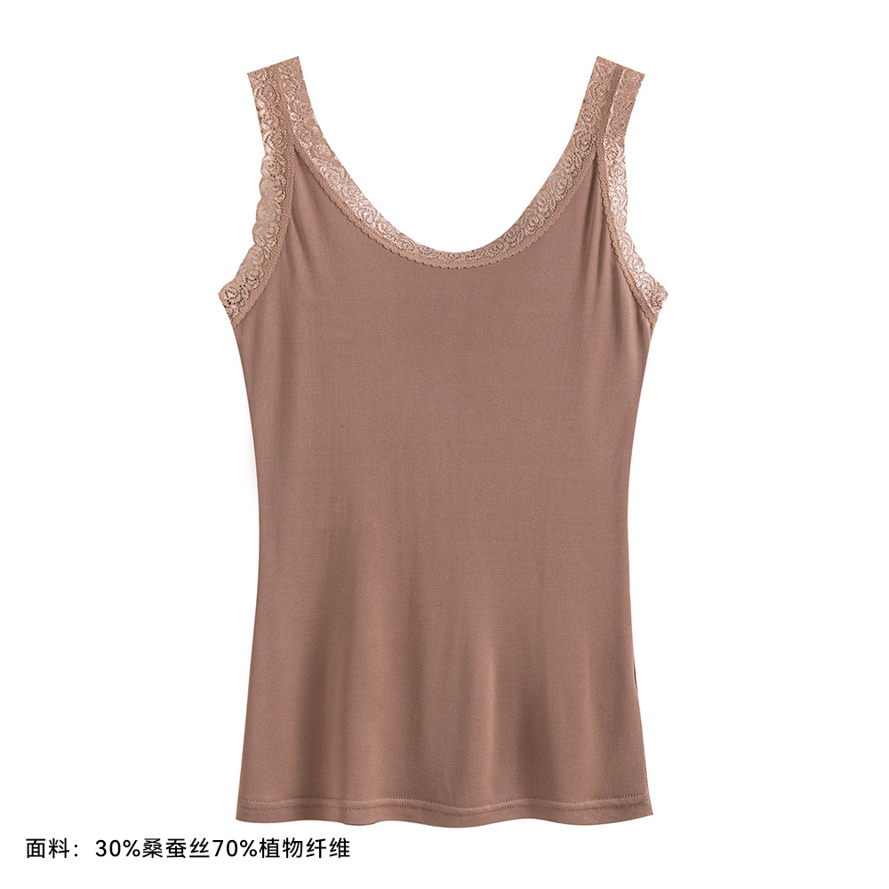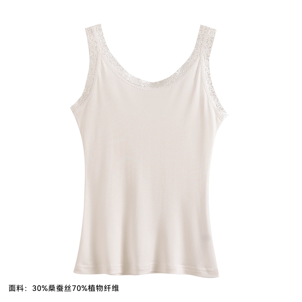 2026 봄/여름 신상 실크 캐미솔 여성용 아우터웨어, 단색 라운드넥, 레이스 테두리가 있는 실크 베이스 레이어스토어 가기