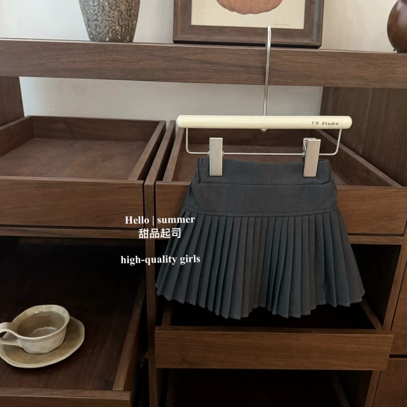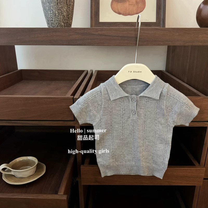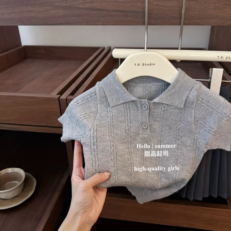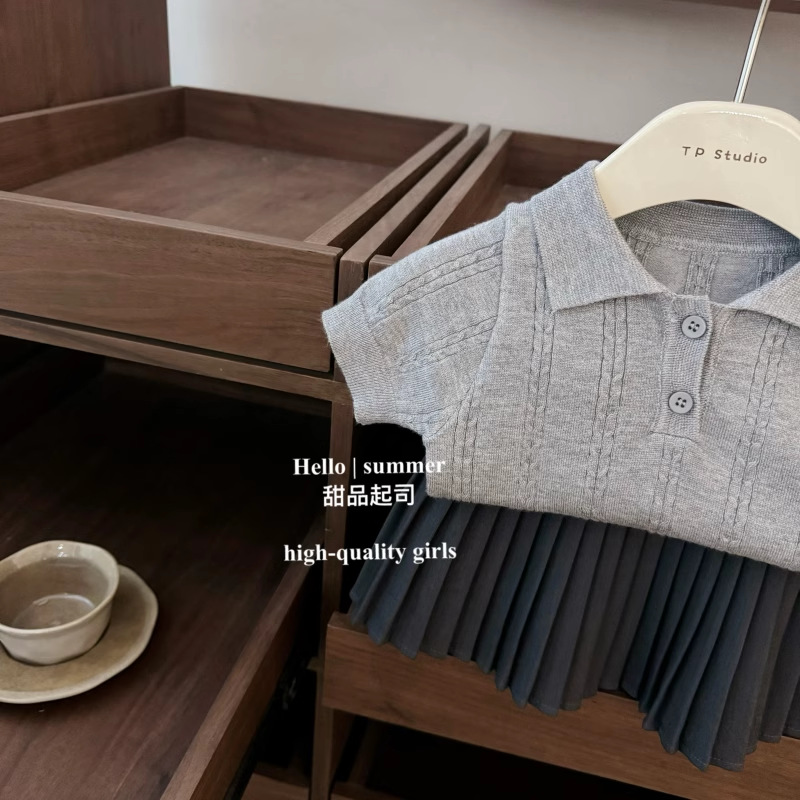 2025 한국식 여성 보물 아카데미 스타일 그레이 짧은 소매 옷깃 폴로 스웨터 유행 주름 치마 투피스 세트스토어 가기