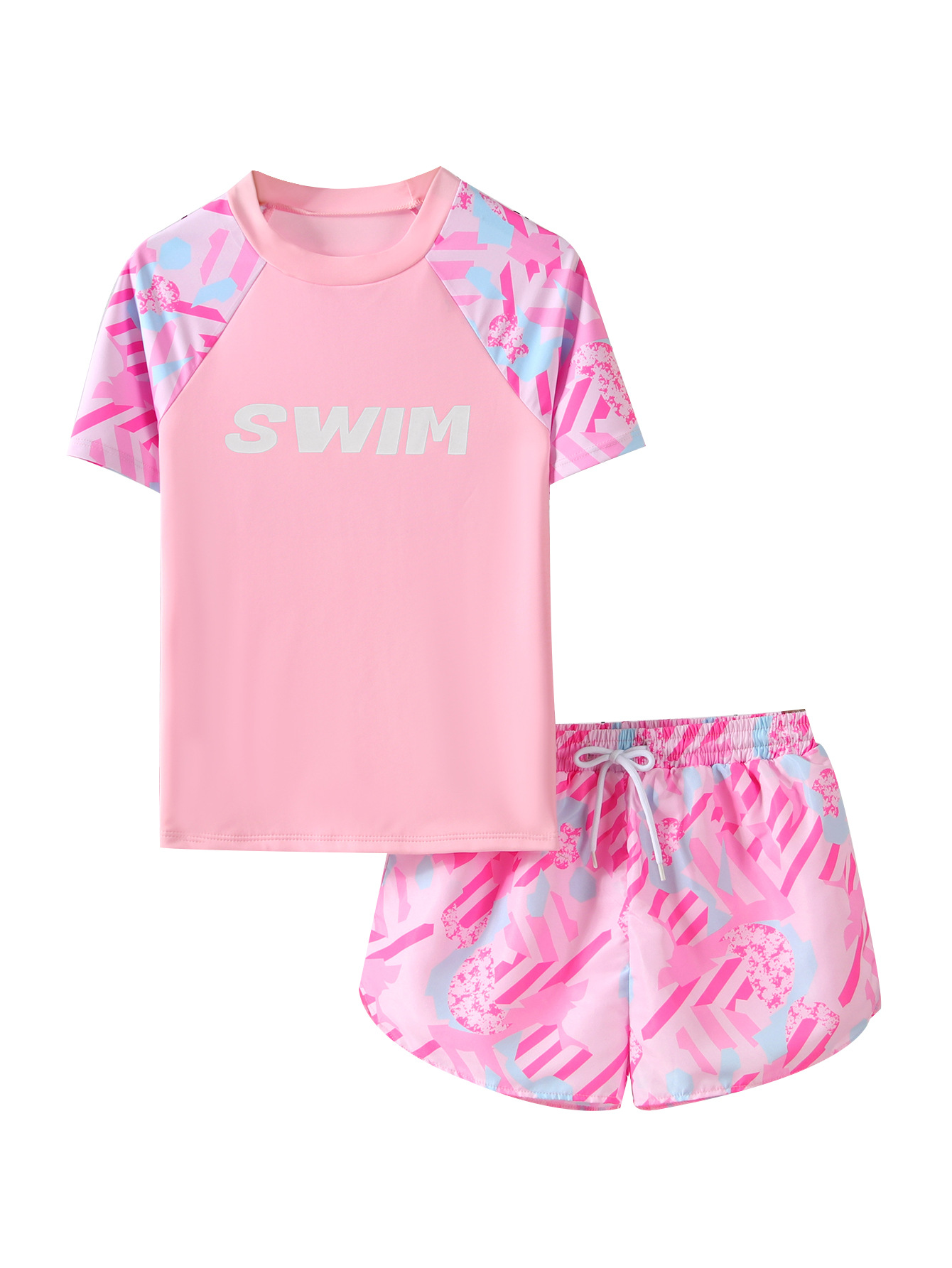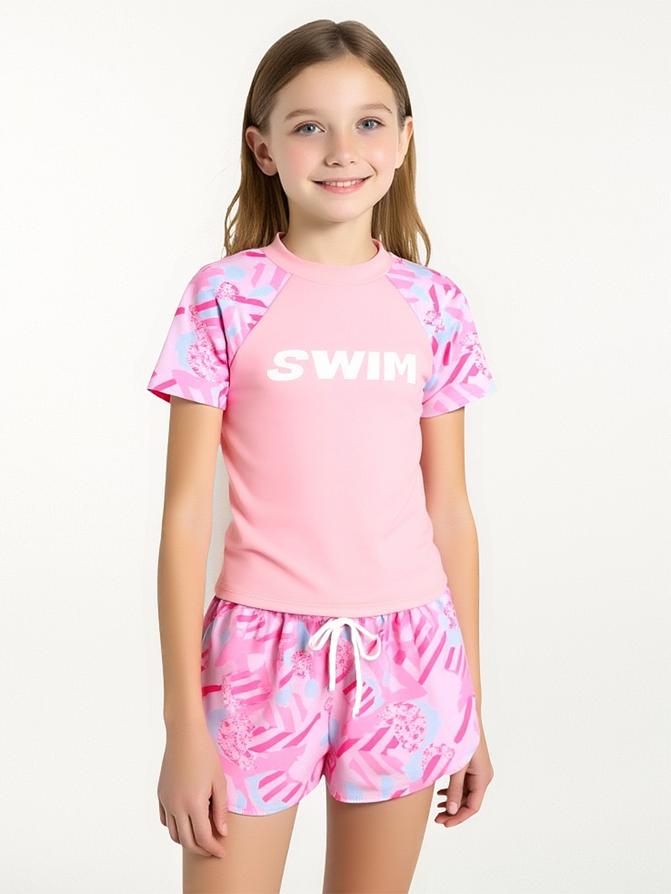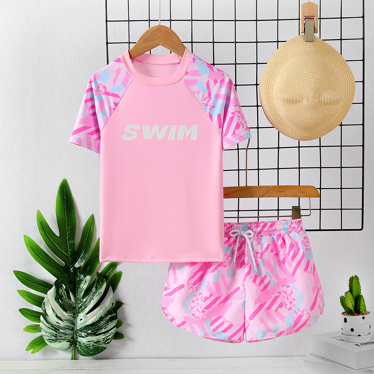 어린이 수영복 여자아이 분리형 수영복 2025 신상 핑크 반팔 반바지 레터링 스포츠 소녀 수영복