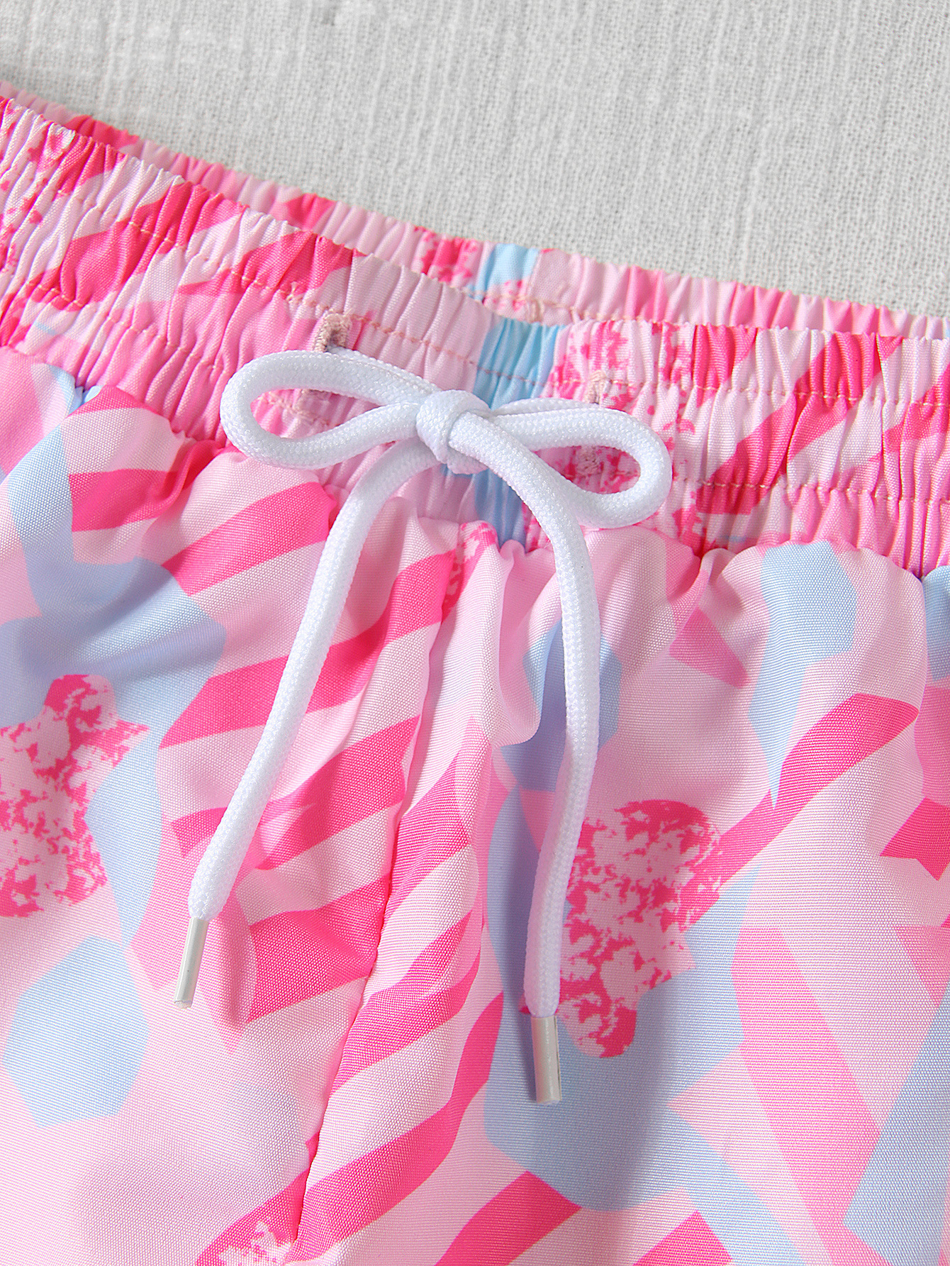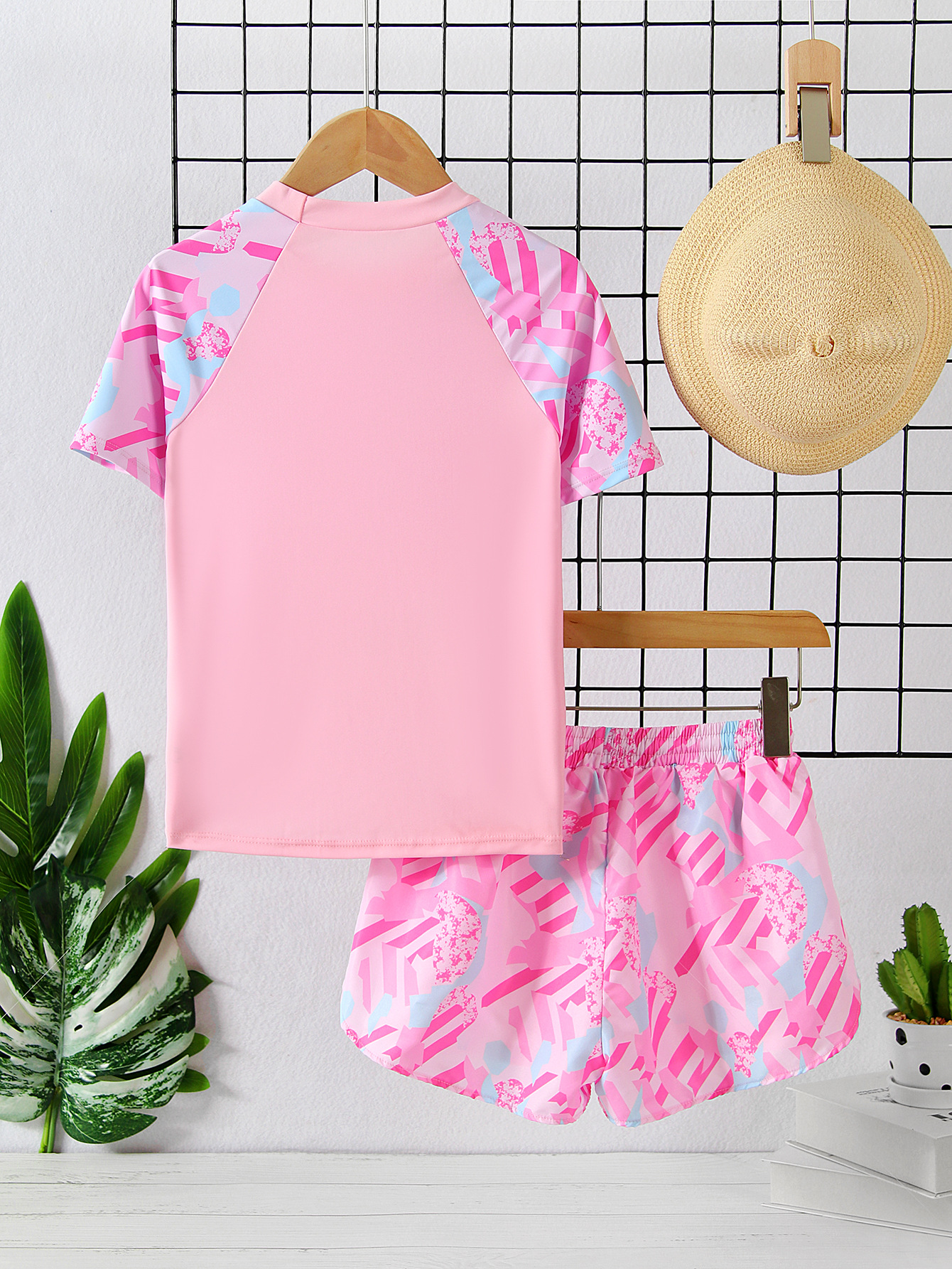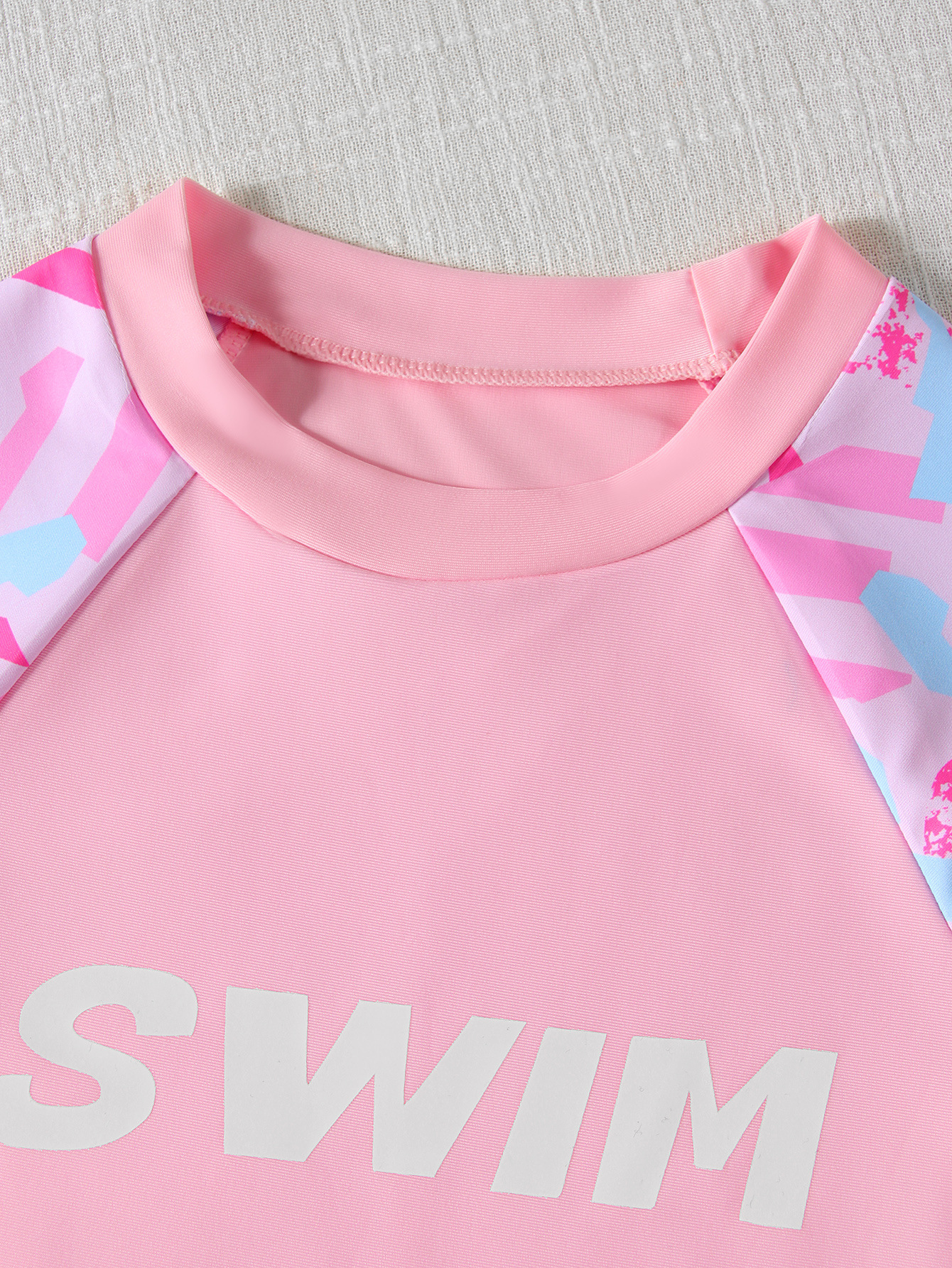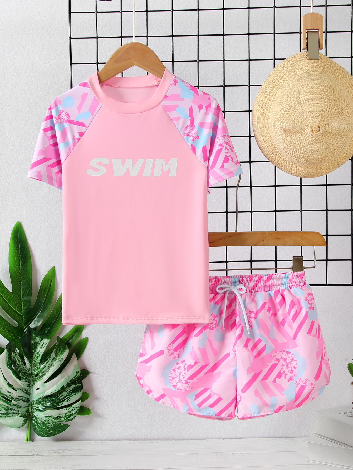 어린이 수영복 여자아이 분리형 수영복 2025 신상 핑크 반팔 반바지 레터링 스포츠 소녀 수영복