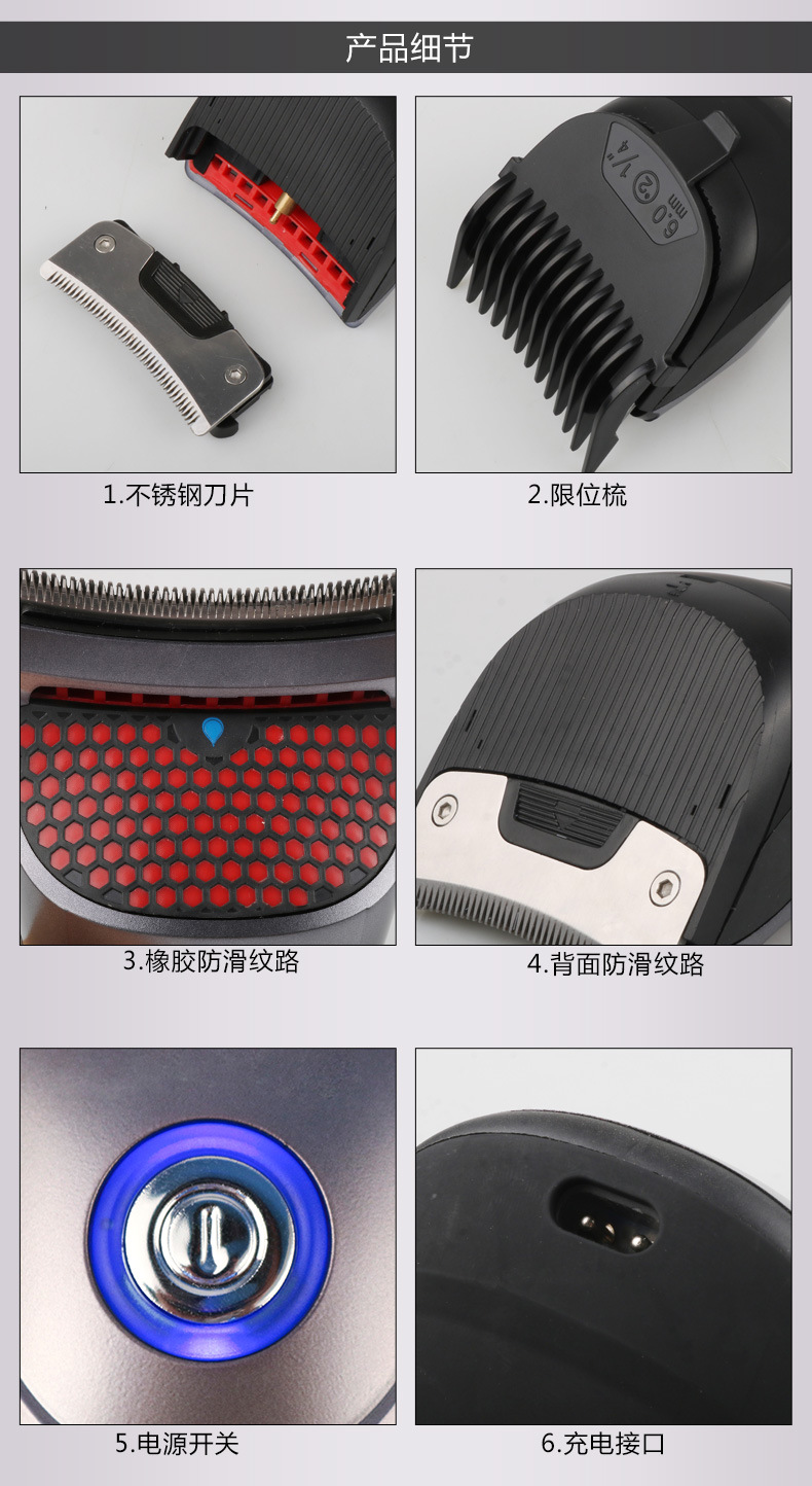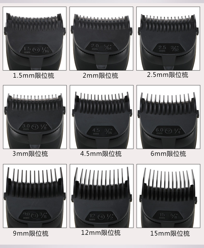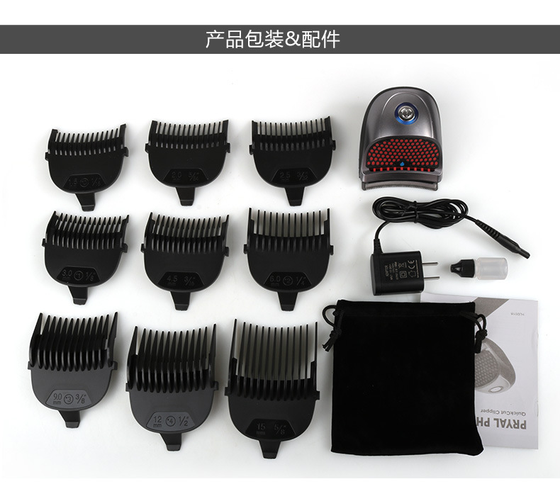 产品标配:主机,9种导向梳子,清洁刷,油瓶,充电器,说明书,彩盒。