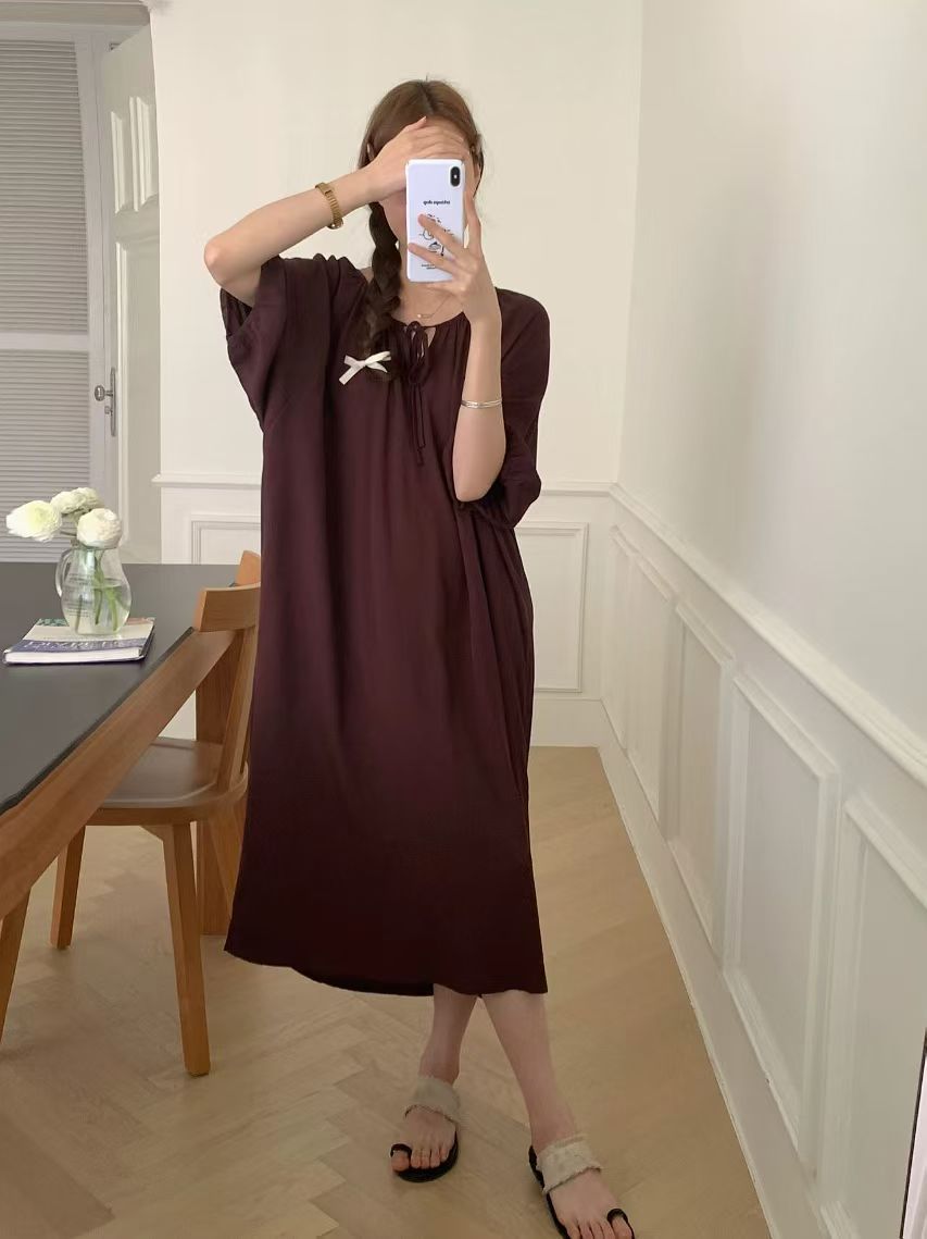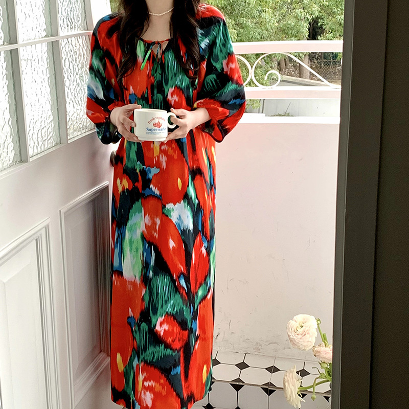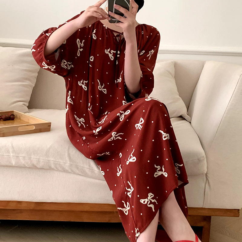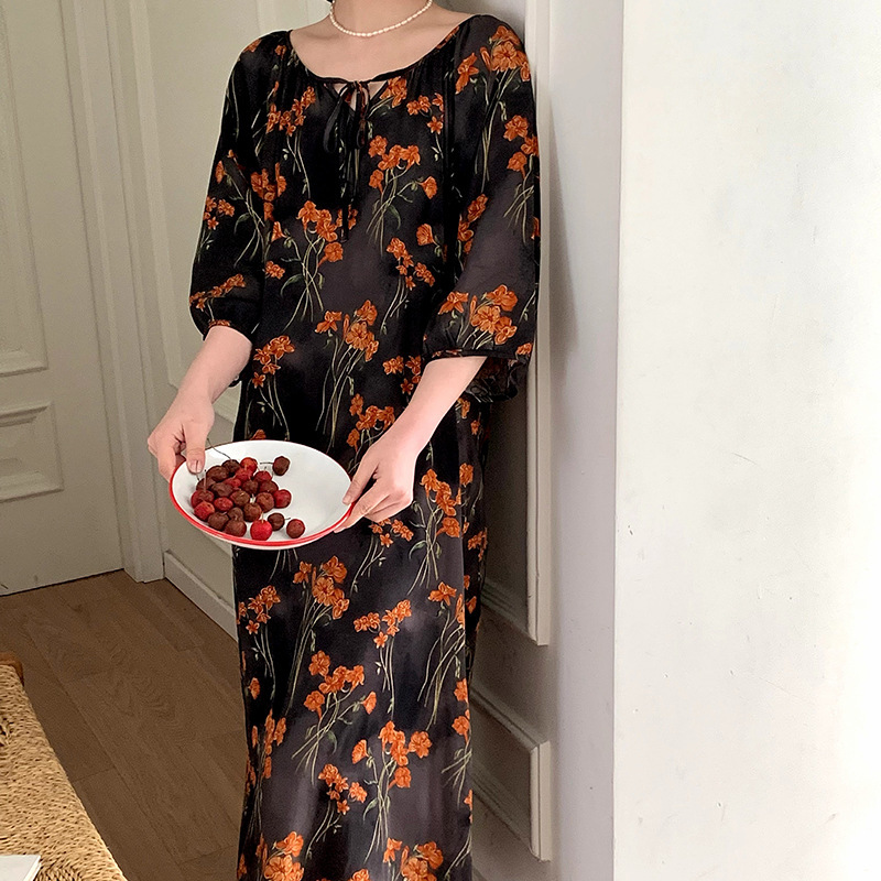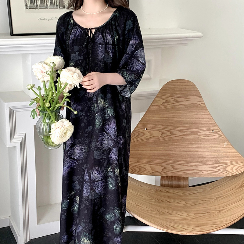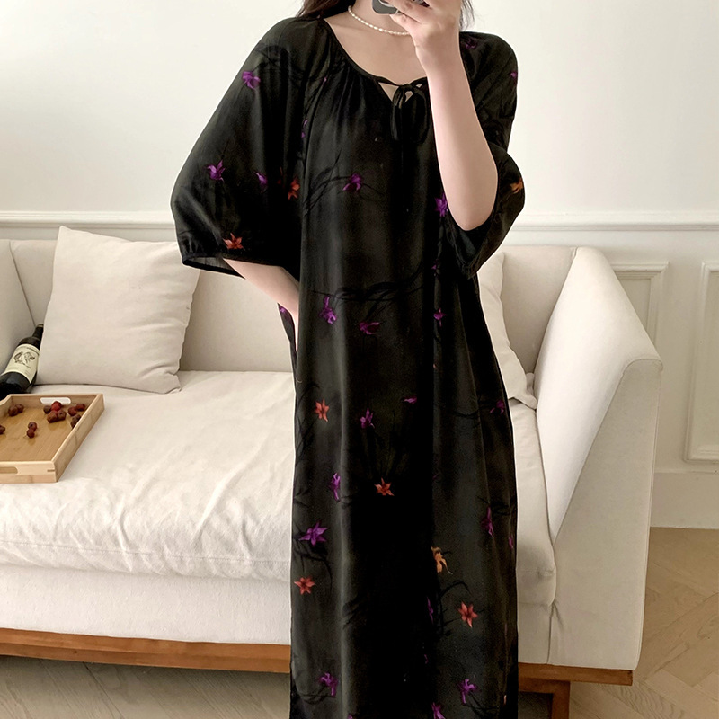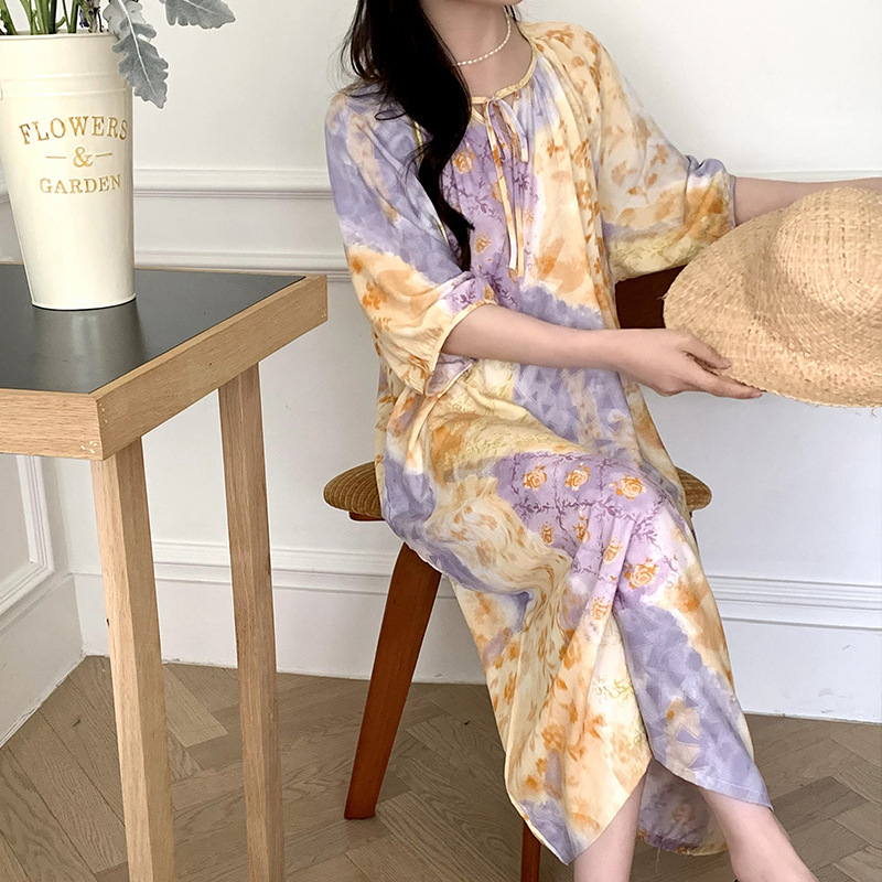 2026년 신상 여성용 면 실크 잠옷, 고급스러운 프린트 반팔 롱 드레스, 큰 사이즈, 얇은 소재, 외출복으로도 활용 가능한 홈웨어