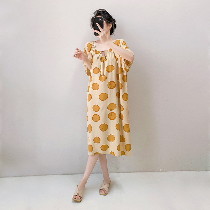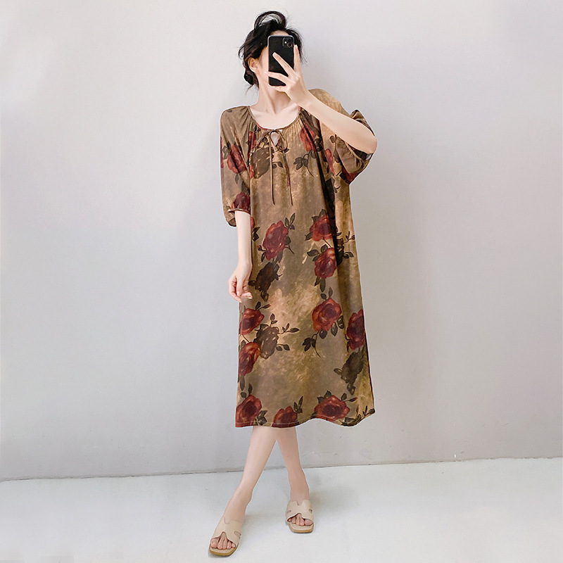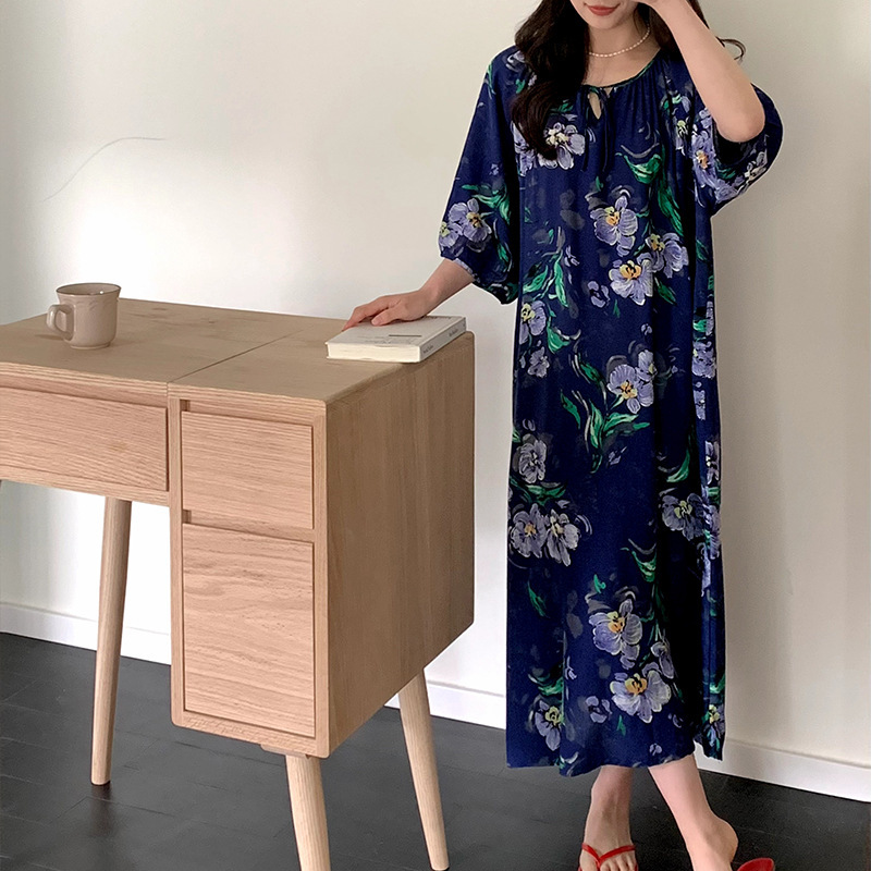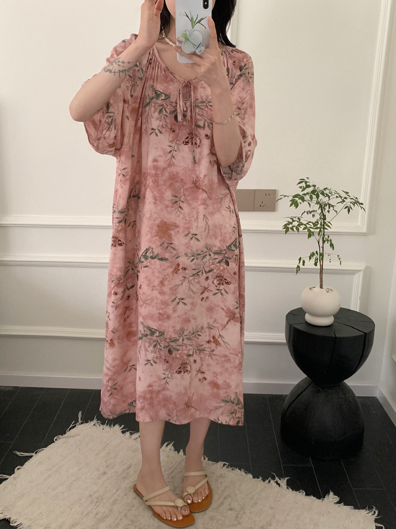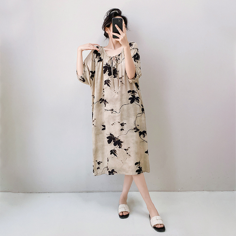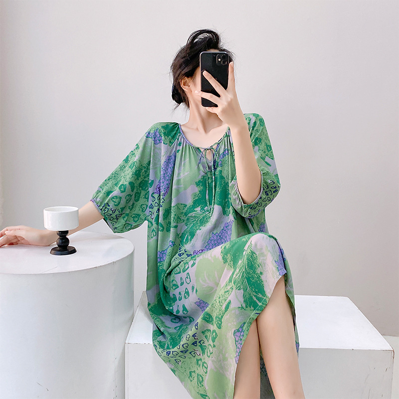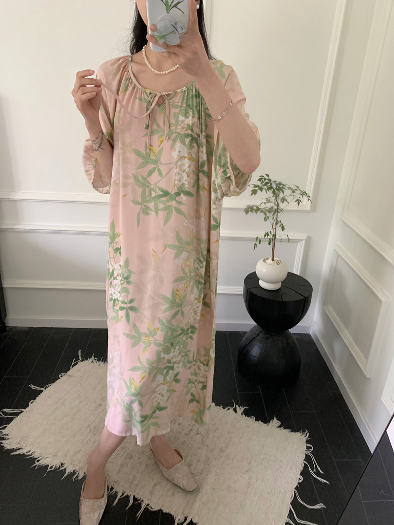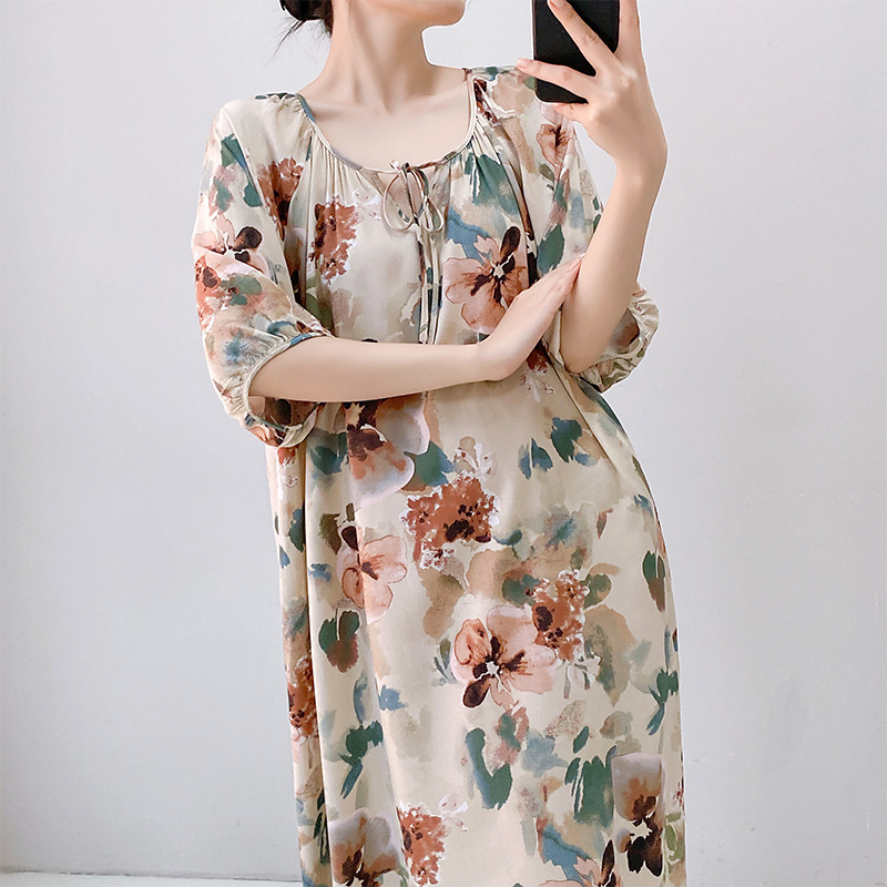 2026년 신상 여성용 면 실크 잠옷, 고급스러운 프린트 반팔 롱 드레스, 큰 사이즈, 얇은 소재, 외출복으로도 활용 가능한 홈웨어스토어 가기