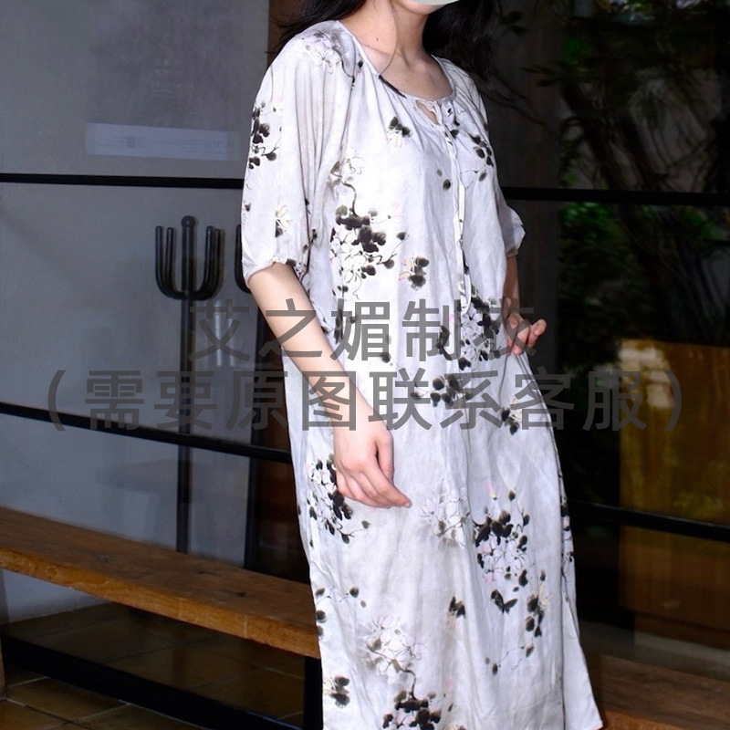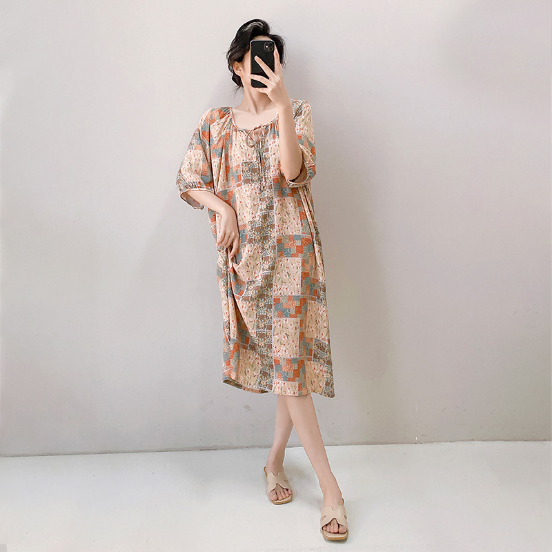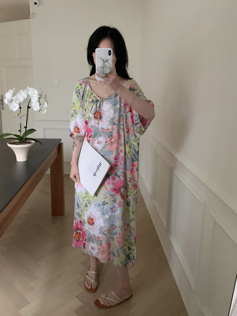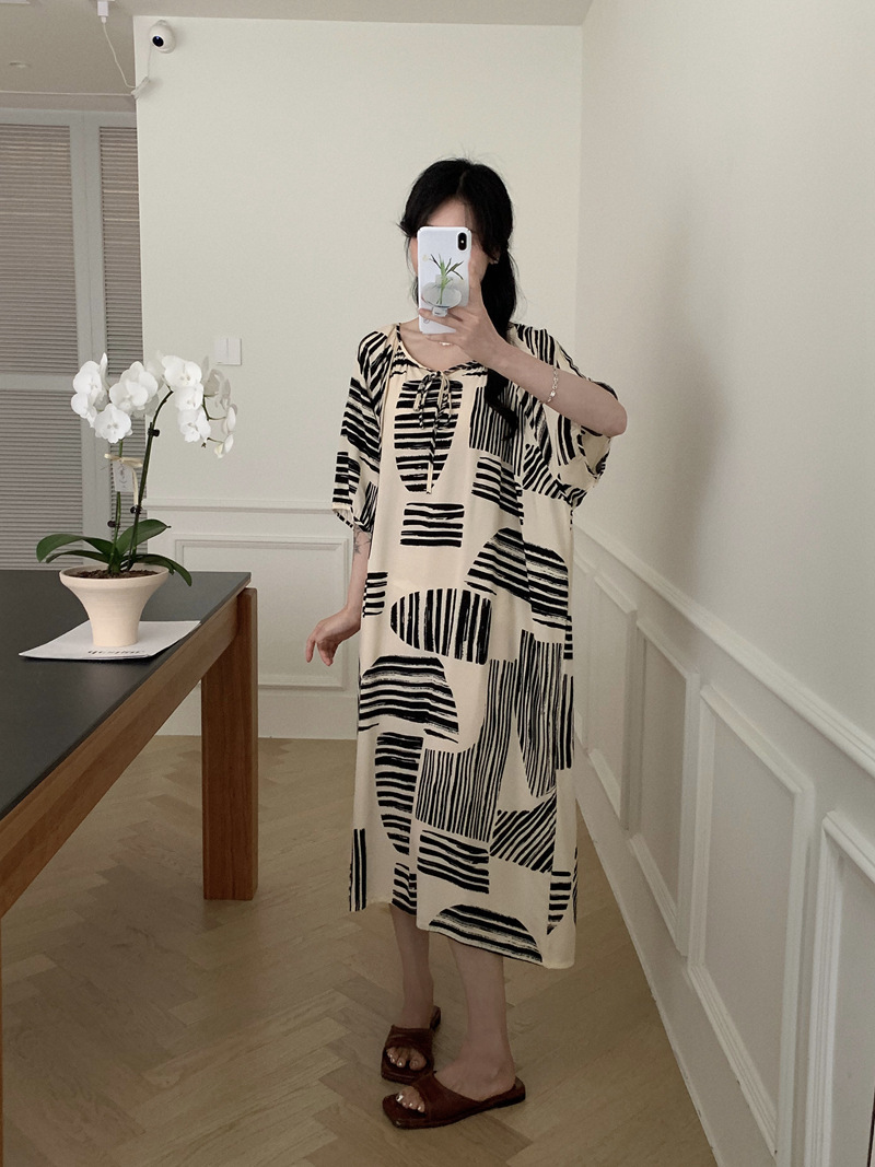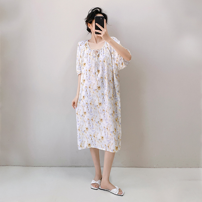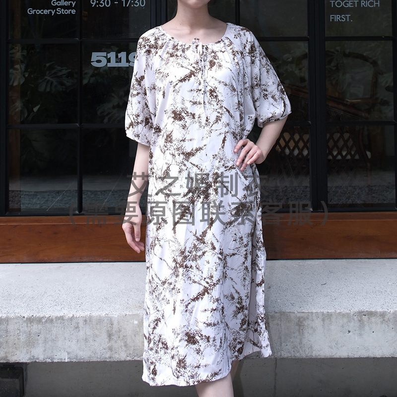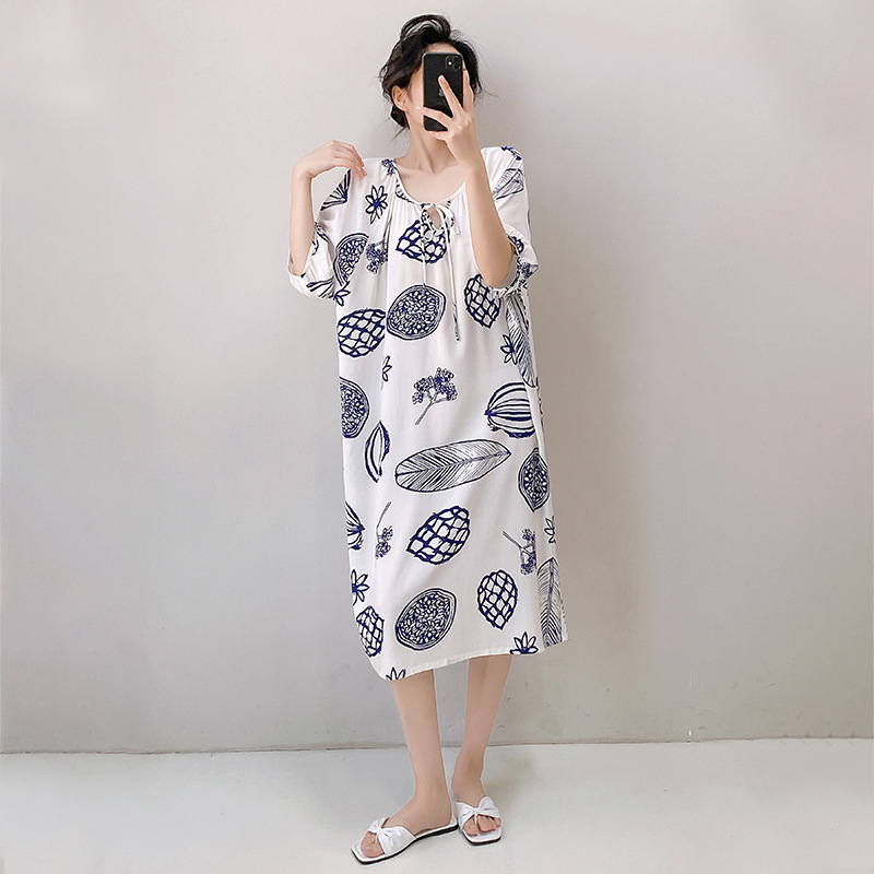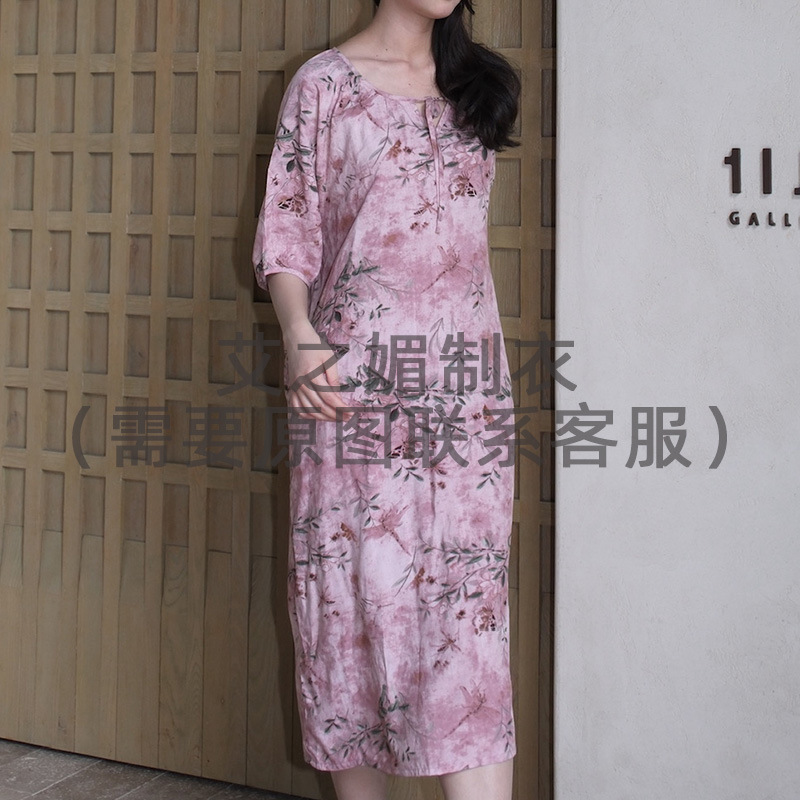 2026년 신상 여성용 면 실크 잠옷, 고급스러운 프린트 반팔 롱 드레스, 큰 사이즈, 얇은 소재, 외출복으로도 활용 가능한 홈웨어스토어 가기
