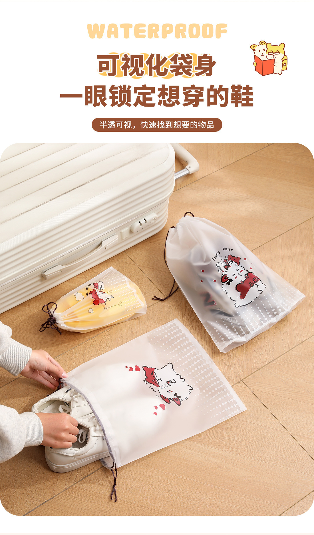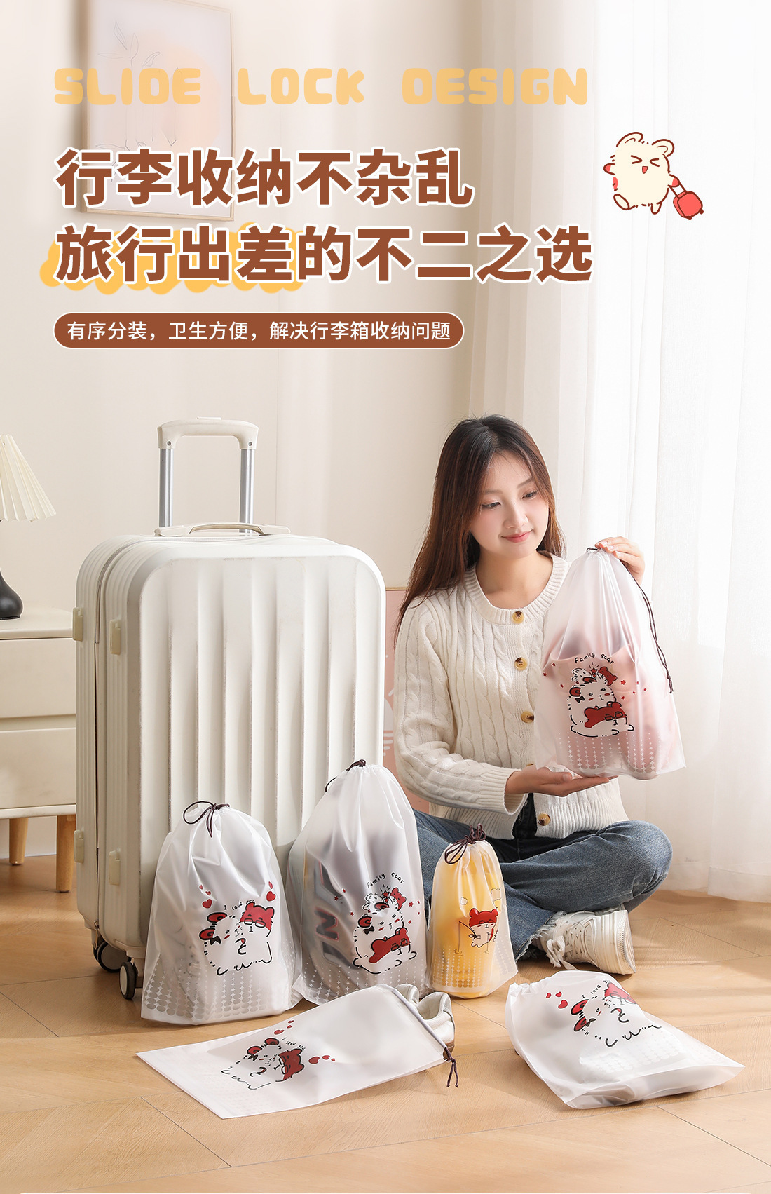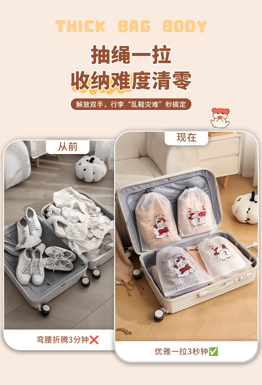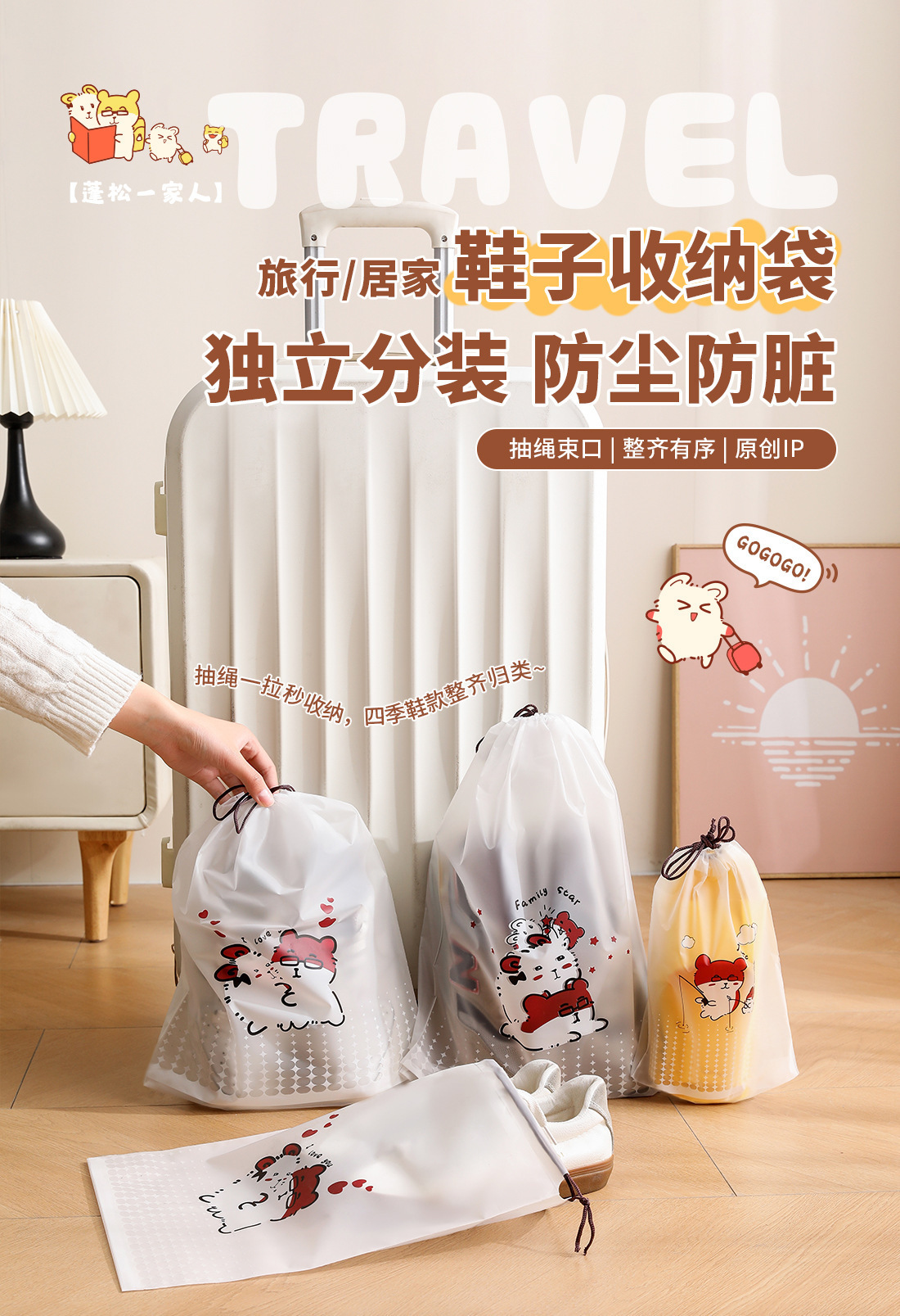 【오리지널】귀여운 여행용 수납 가방, 여행 가방 속옷 정리, 출장용 끈 조임식 편리한 수납 분류 도매스토어 가기