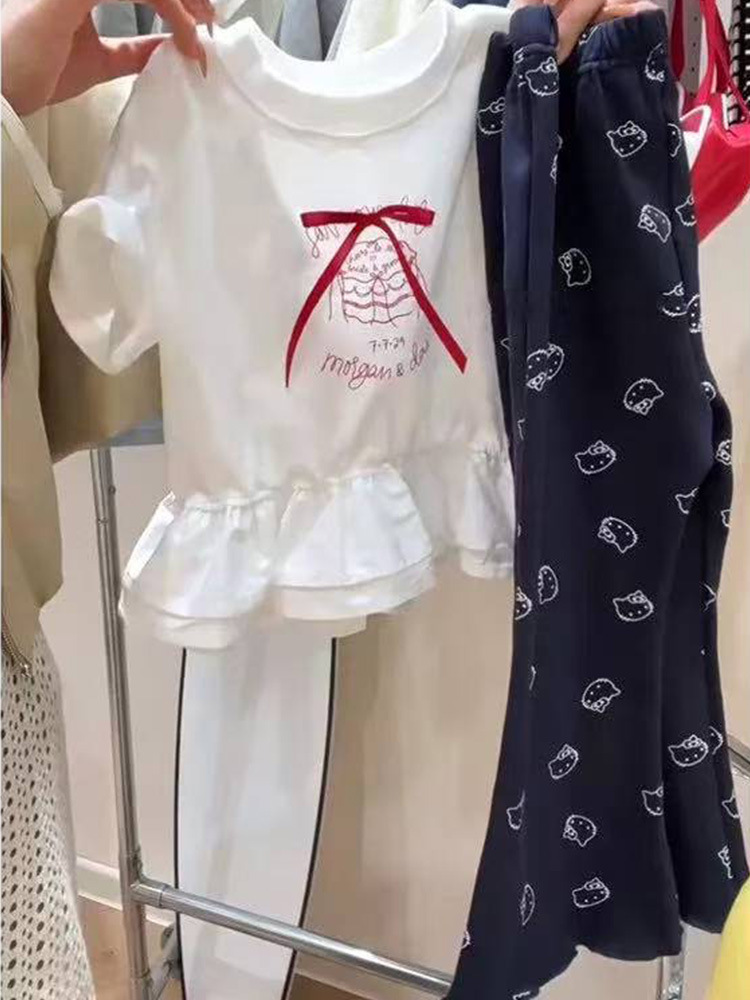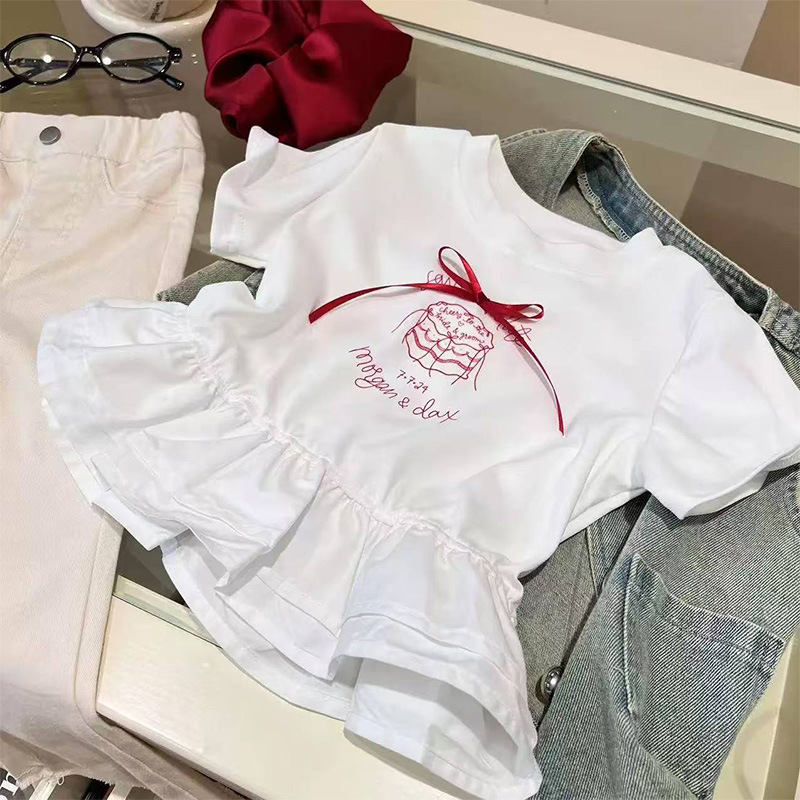한국 아동복 어린이 흰색 t 탑 2025 새로운 소녀 달콤한 활 만화 반팔 티셔츠 인형 셔츠 여름스토어 가기