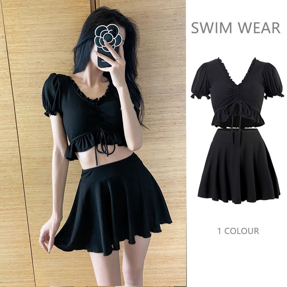 수영복 여성 보수파 2025 새 한국 쪼개지는 치마 배꼽이 휴가 용 슬리밍 학생 수영복 블랙