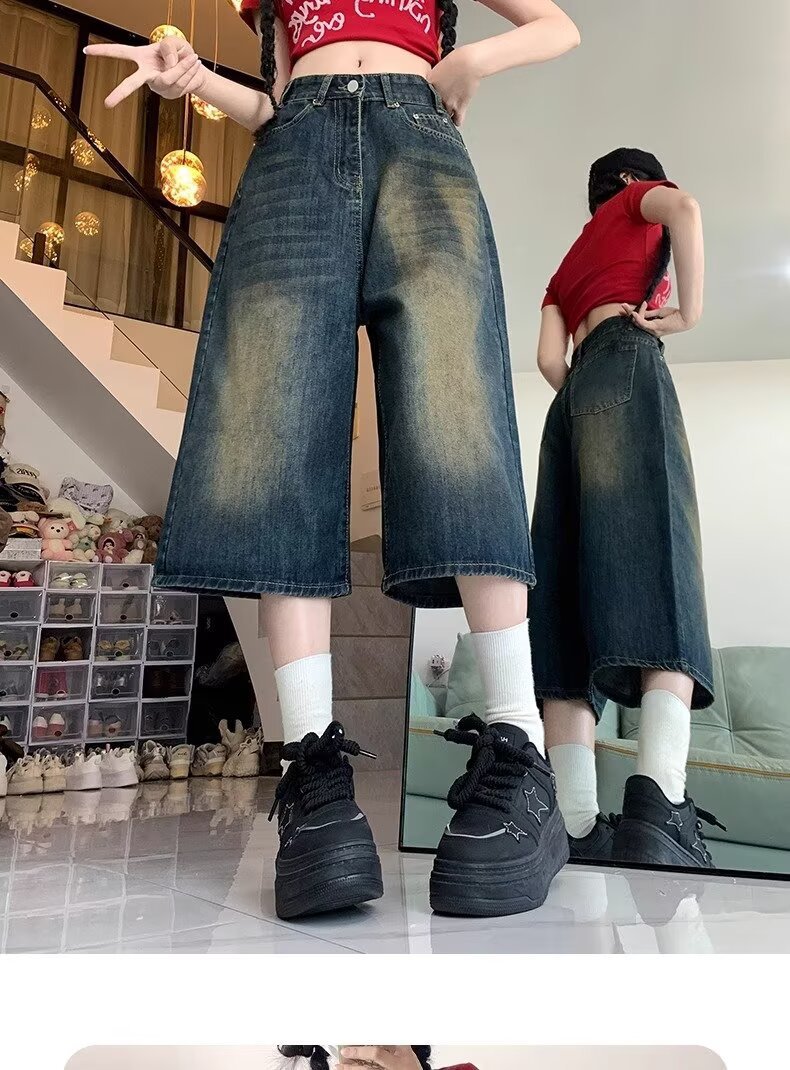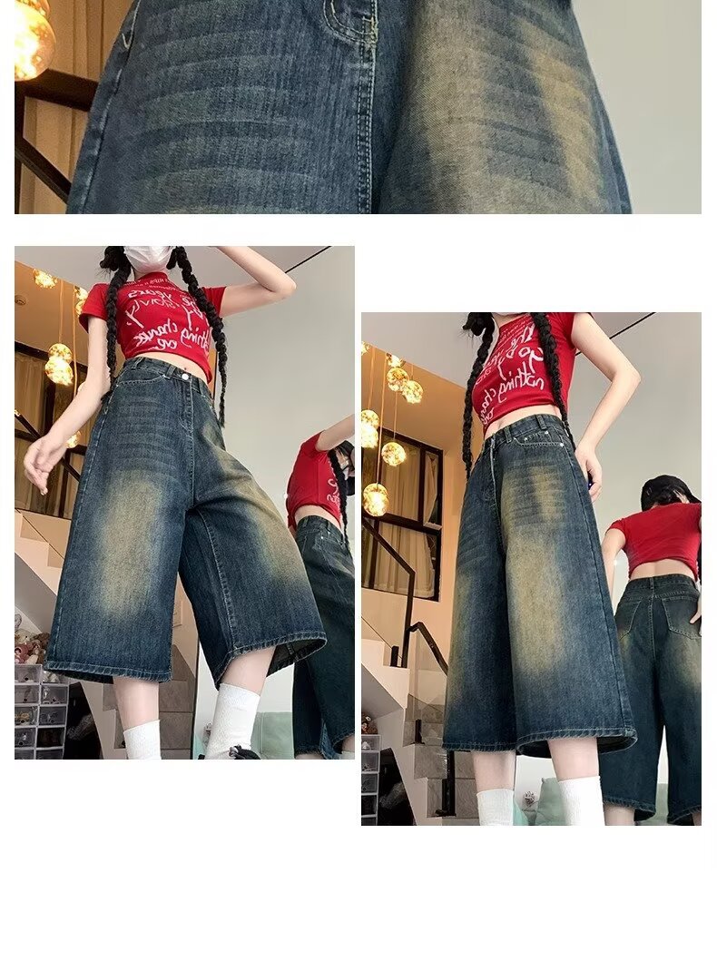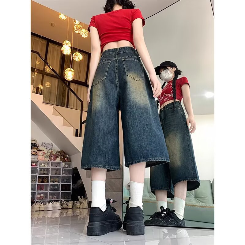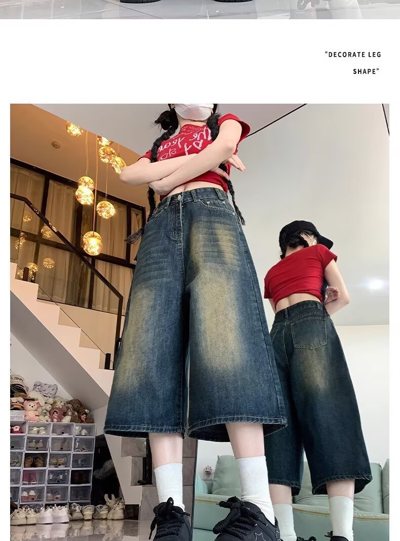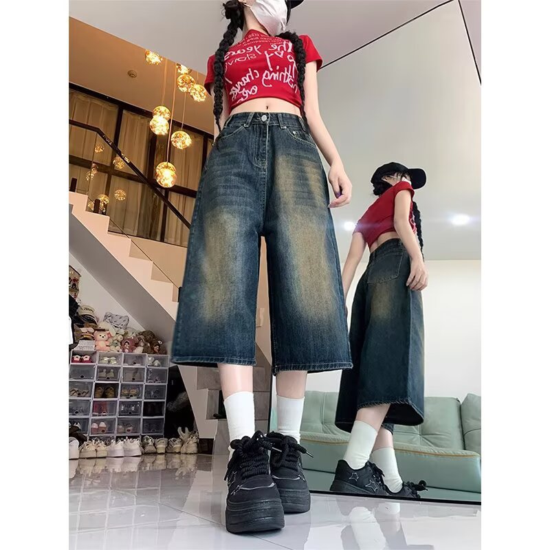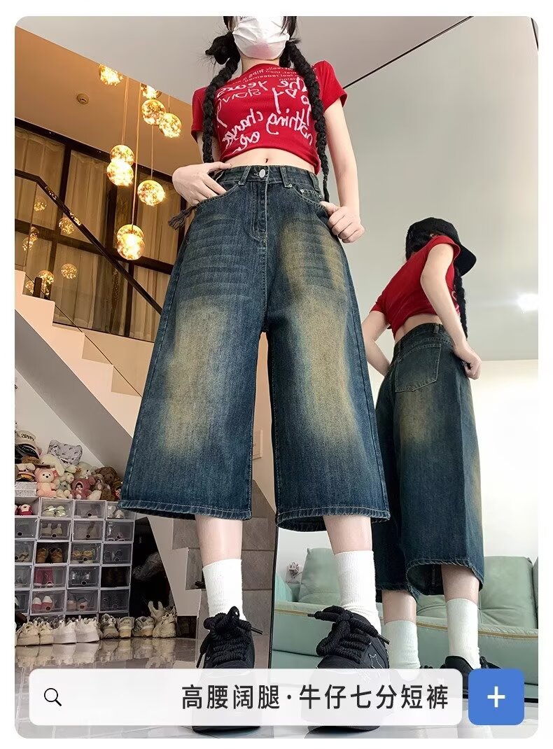 아메리칸 스타일 하이 스트리트 올드 와이드 레그 크롭 청바지 여성 여름 새로운 높은 허리 느슨한 슬리밍 빈티지 스트레이트 바지스토어 가기