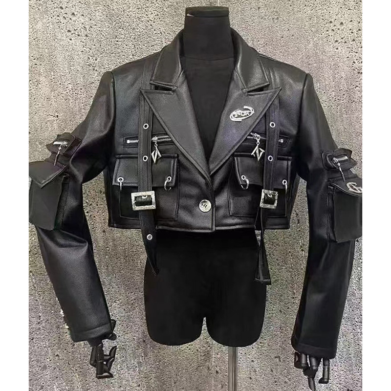 쿨 사 뜨거운 소녀 금속 장식 블랙 오토바이 PU 가죽 자켓 여성의 가을 프라이드 스트리트 툴링 멀티 포켓 가죽 자켓
